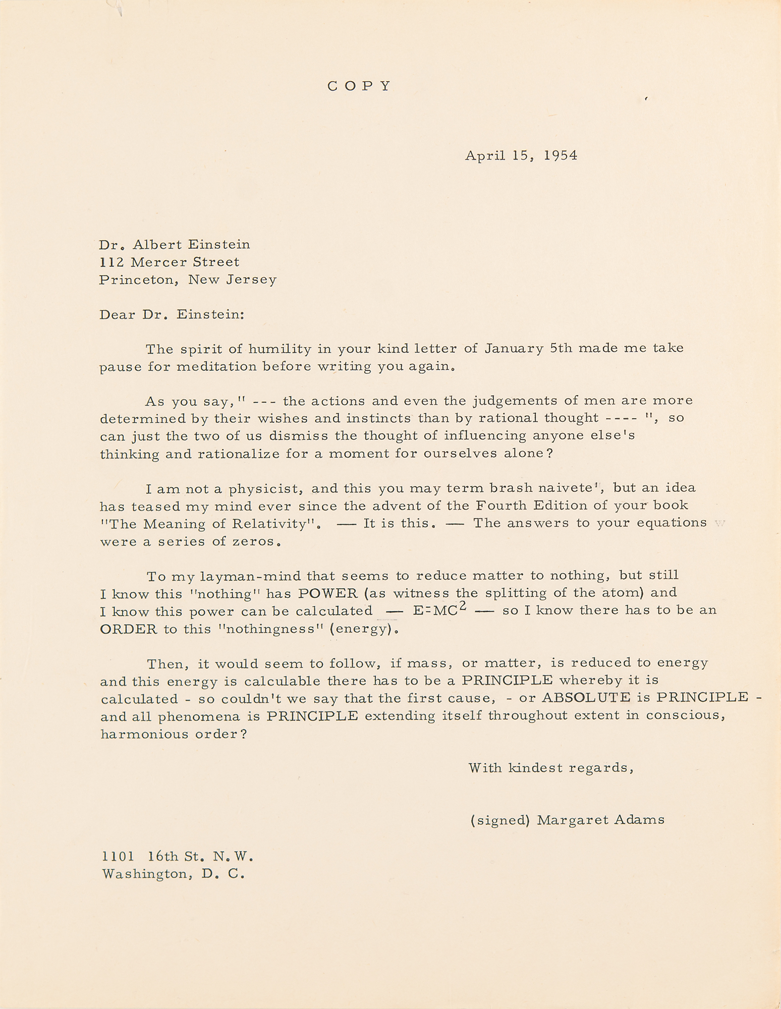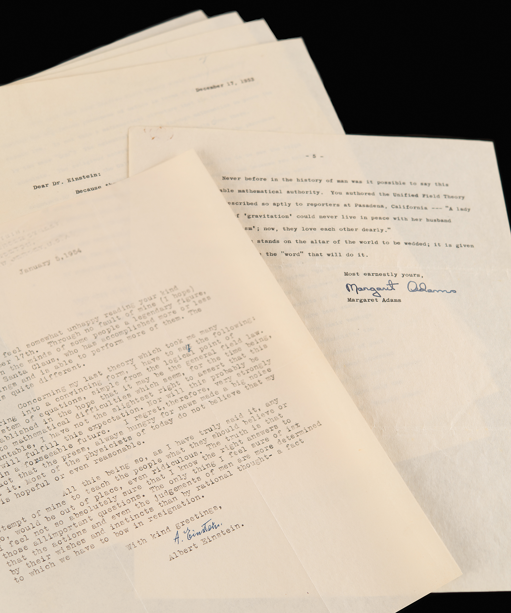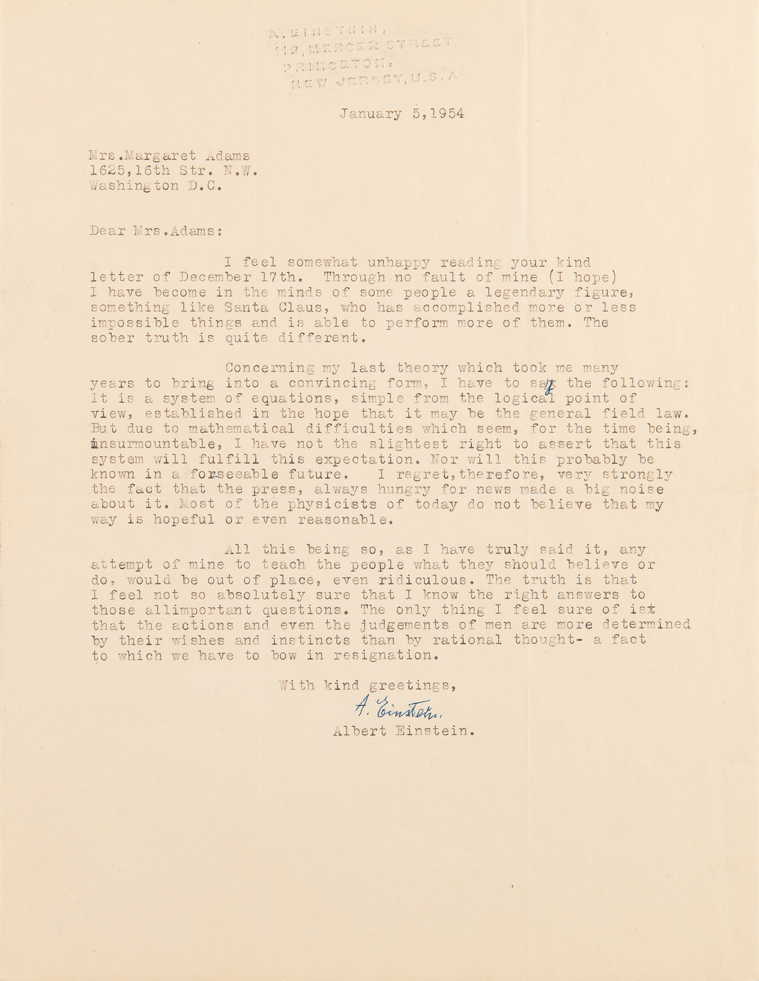 TLS signed “A. Einstein,” one page, 8.5 x 11, blindstamped personal Princeton letterhead, January 5, 1954. Letter to Margaret Sanders Adams, the daughter of KFC founder Col. Harland Sanders, replying to a five-page letter in which she prompts him with a litany of philosophical questions and ideas about science, religion, peace, and universal brotherhood; she makes mention of her work in sculpture and notes that Otto Nathan saw her "reading [Einstein's] books at the Library of Congress and made himself known to me. He has been so kind as to offer to bring my letter in person."