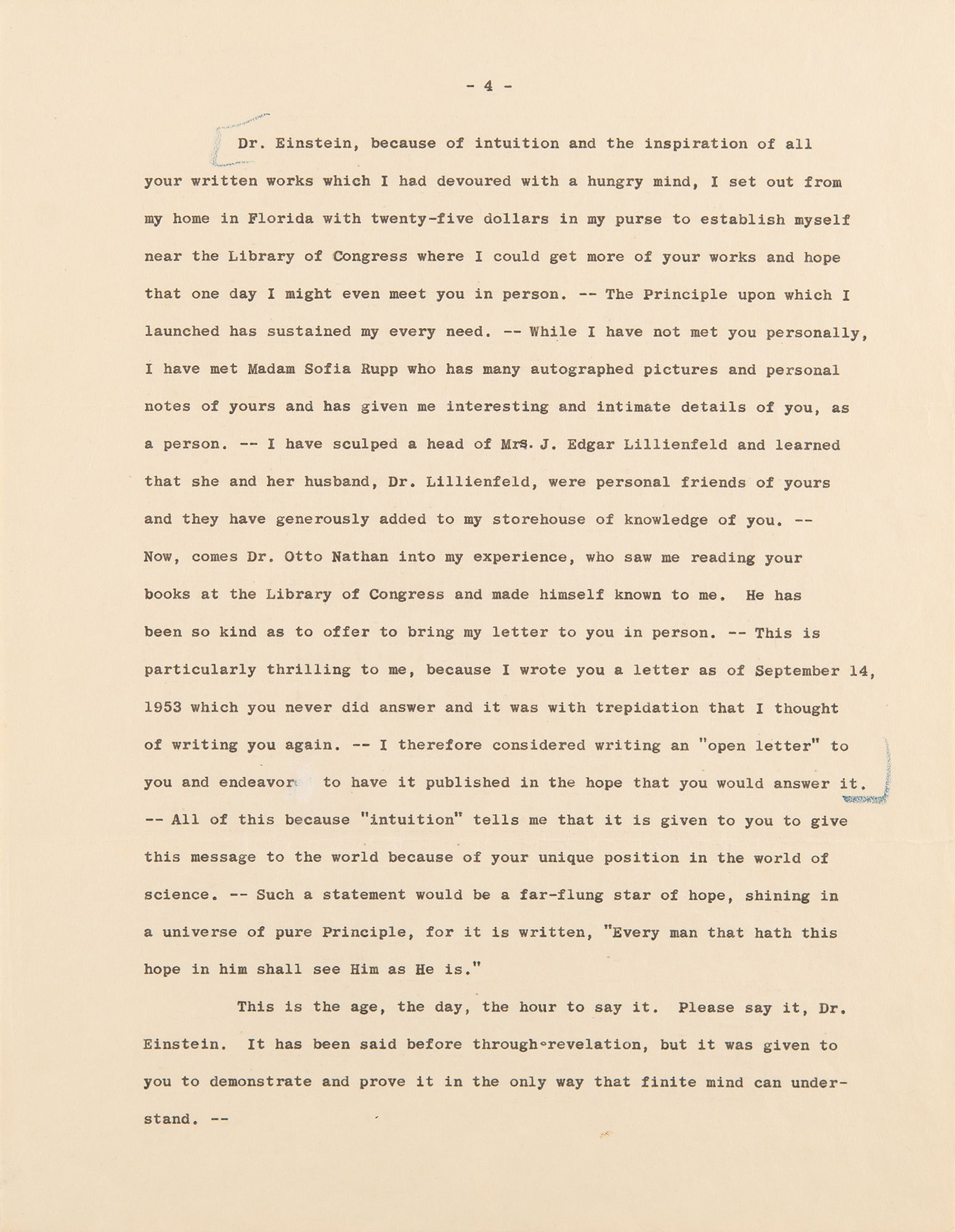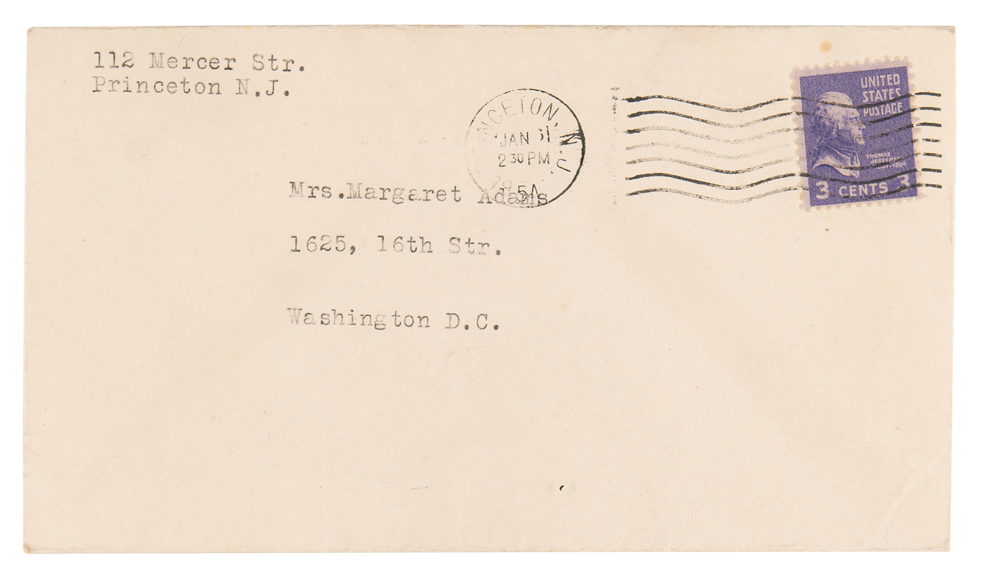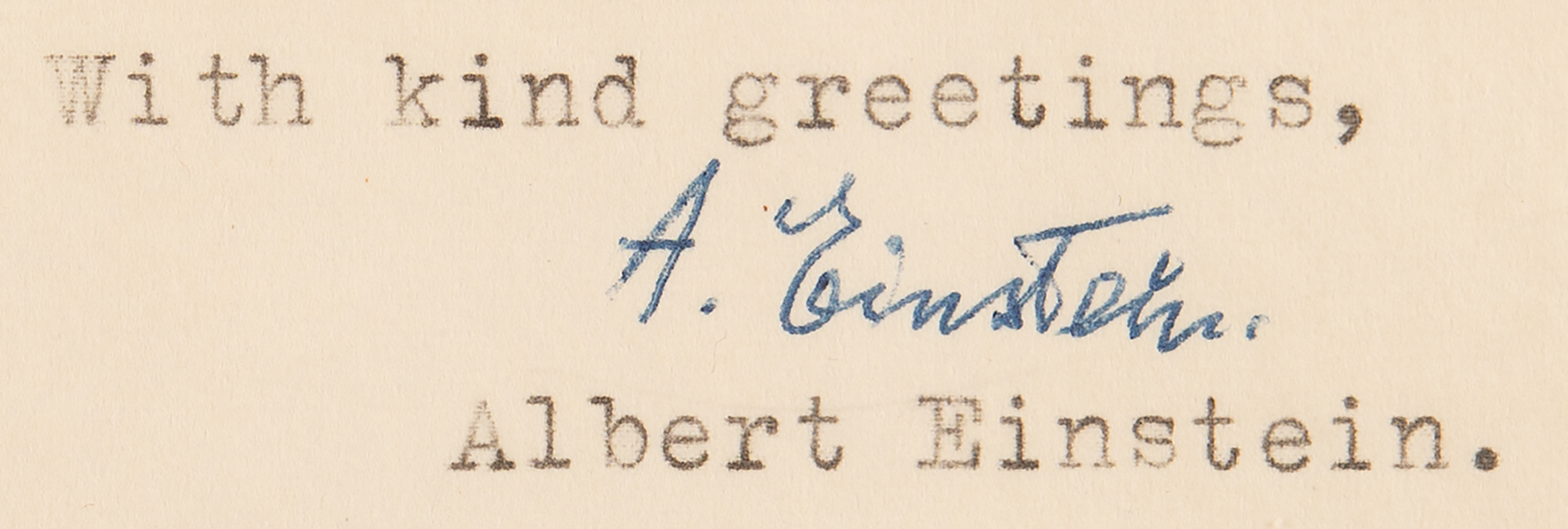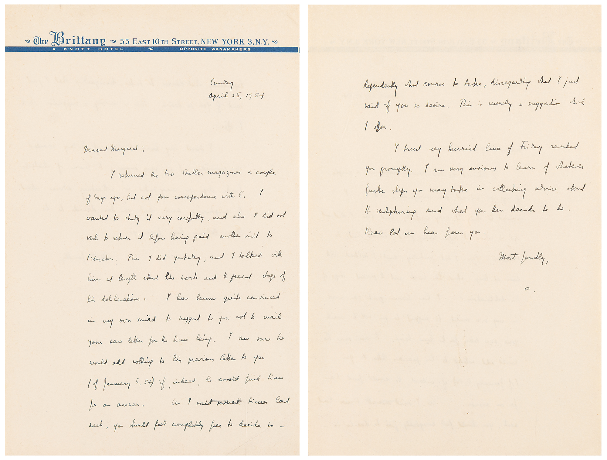 TLS signed “A. Einstein,” one page, 8.5 x 11, blindstamped personal Princeton letterhead, January 5, 1954. Letter to Margaret Sanders Adams, the daughter of KFC founder Col. Harland Sanders, replying to a five-page letter in which she prompts him with a litany of philosophical questions and ideas about science, religion, peace, and universal brotherhood; she makes mention of her work in sculpture and notes that Otto Nathan saw her "reading [Einstein's] books at the Library of Congress and made himself known to me. He has been so kind as to offer to bring my letter in person."