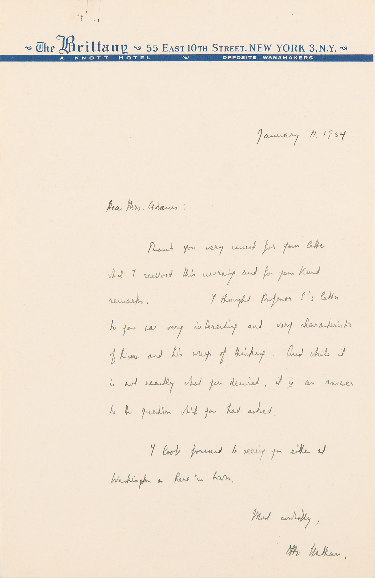 Accompanied by the original mailing envelope, a copy of Adams's original letter to Einstein, a copy of her proposed reply, and two ALSs by Otto Nathan concerning their correspondence. In the first, dated January 11, 1954, he writes: "I thought Professor E's letter to you was very interesting and very characteristic of him and his way of thinking. And while it is not exactly what you desired, it is an answer to the question which you had asked." In the second, dated April 25, 1954, he mentions visiting Einstein and recommends that she not send a new letter: "I talked with him at length about his works and the present stage of his deliberations. I have become quite convinced in my own mind to suggest to you not to mail your new letter for the time being. I am sure he would add nothing to his previous letter to you (of January 5, 54)."