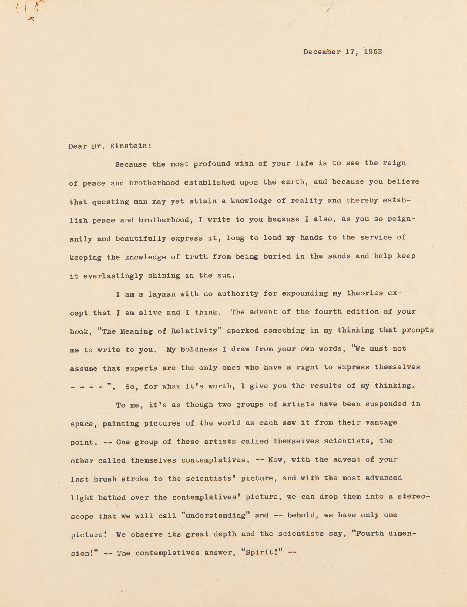 Einstein replies, in full: "I feel somewhat unhappy reading your kind letter of December 17th. Through no fault of mine (I hope) I have become in the minds of some people a legendary figure, something like Santa Claus, who has accomplished more or less impossible things and is able to perform more of them. The sober truth is quite different.