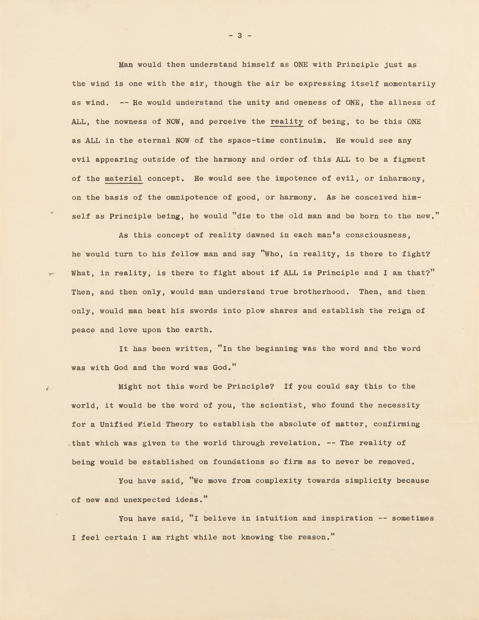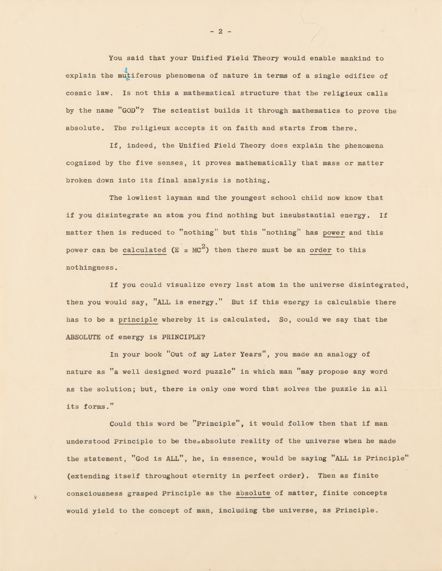 The essential question she poses to Einstein is thus: "You said that your Unified Field Theory would enable mankind to explain the multiferous phenomena of nature in terms of a single edifice of cosmic law. Is not this a mathematical structure that the religieux calls by the name 'GOD'? The scientist builds it through mathematics to prove the absolute. The religieux accepts it on faith and starts from there."