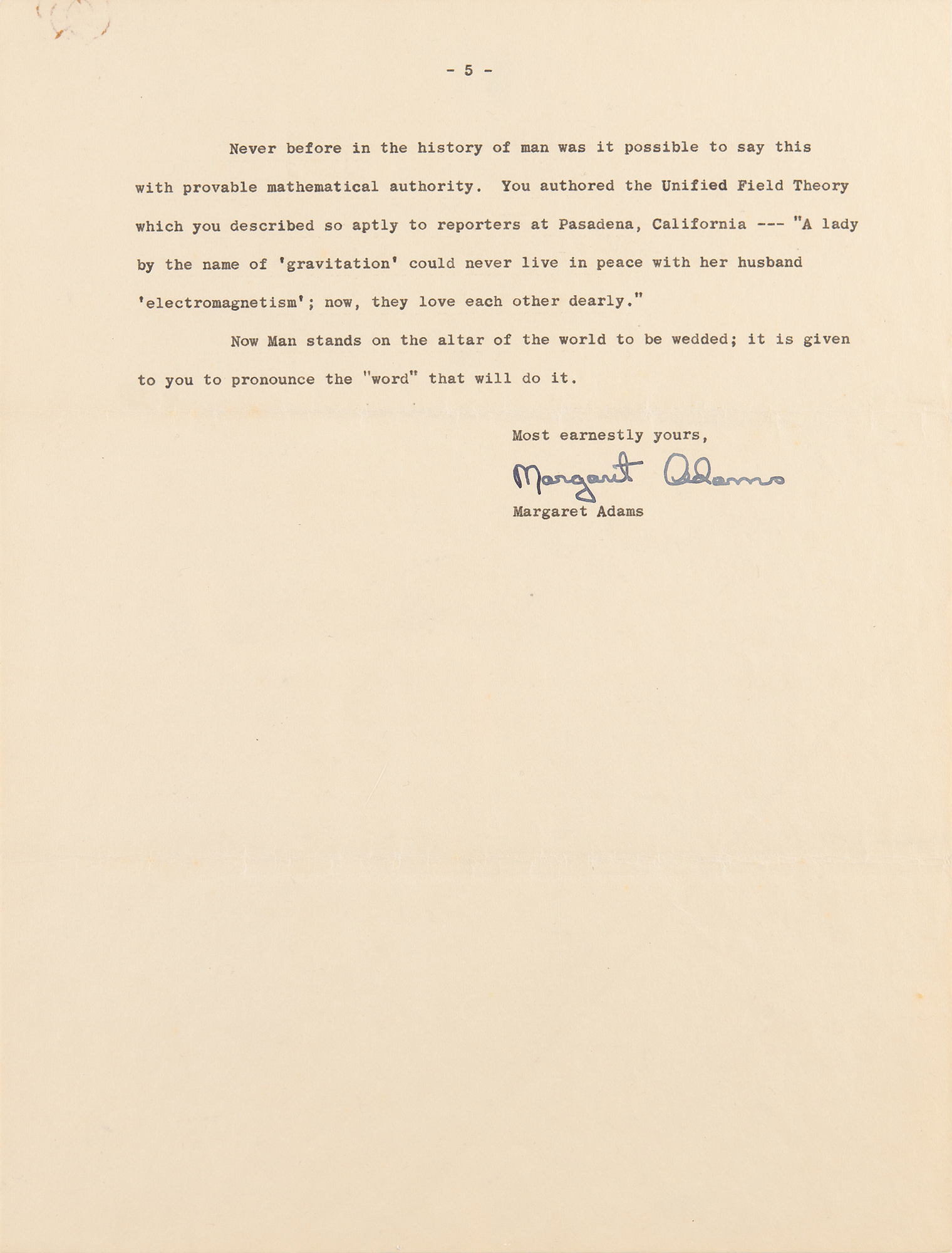 Also includes a copy of Margaret Sanders Adams's memoir, The Colonel's Secret: Eleven Herbs and a Spicy Daughter, in which she relates the conception, creation, and delivery (by Otto Nathan) of her letter to Einstein. She notes: "From the very beginning I had only dared to hope to someday have what I wrote published as an 'open letter' to Dr. Einstein, but far beyond all imaginable expectations, here before me stood Einstein's personal friend, willing to act as my courier, to take him a personal letter from me! I spent that night putting my hypothesis into a personal letter. Dr. Nathan delivered it and in a short time, I had an answer in the mail from Einstein himself. I have kept the two letters in my lock box since 1953 for safe keeping, and they shall remain there until I am shown the propitious time to publish them."