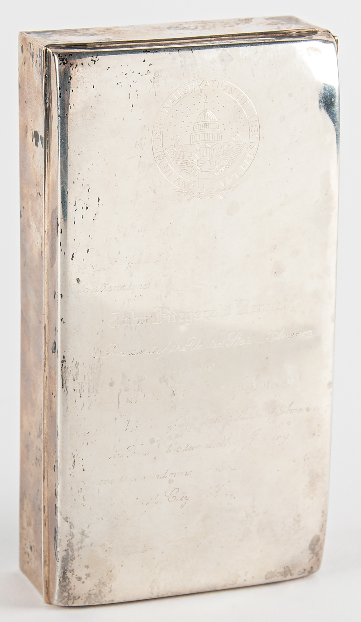 Handsome sterling silver cigarette box featuring an engraving on the lid replicating the invitation to the inauguration of President John F. Kennedy on January 20, 1961, 6˝ x 3˝ 1.5˝, marked on the bottom edge: "Sterling by Poole." The interior of the box is lined in wood. In very good to fine condition, with scattered spots of tarnishing.