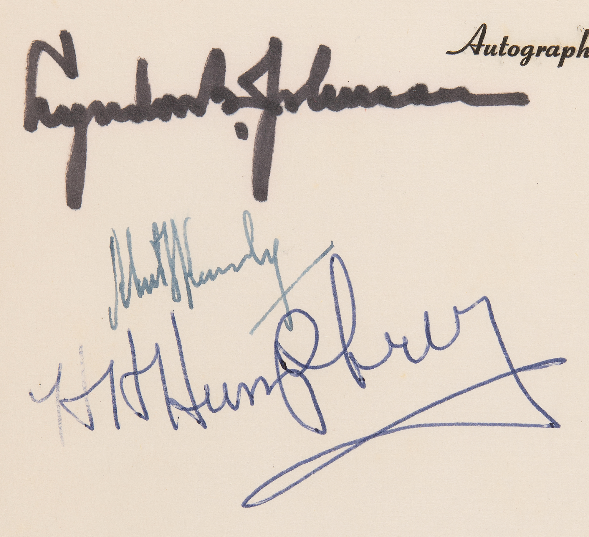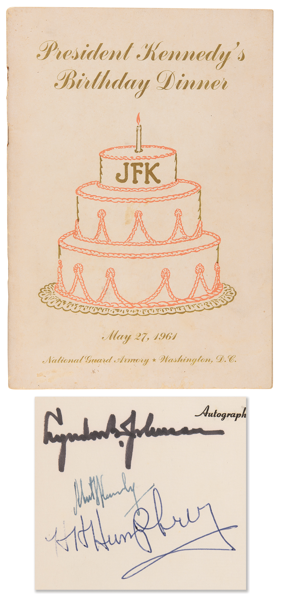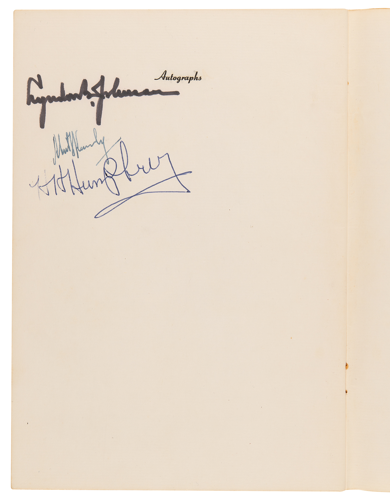 Official program for "President Kennedy's Birthday Dinner" from the collection of Congressman Ralph Harding, organized as a post-election fundraiser by the Democratic National Committee and held at the National Guard Armory on May 27, 1961, 54 pages, 6 x 8.75, depicting key Democratic figures, listing door prizes contributed by various states, and naming the contributors, guests, and seating arrangements. Signed on a rear 'autographs' page in ink by Lyndon B. Johnson, Robert F. Kennedy, and Hubert H. Humphrey. Also signed in blue ballpoint by Speaker of the House Sam Rayburn below his image on the second page. In fine condition, with minor staining and toning to the covers.