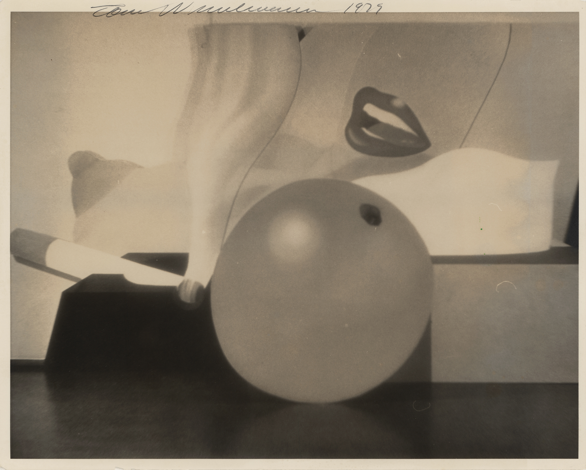 Matte-finish 10 x 8 photo of one of Wesselmann's typical works portraying a nude woman, orange, and smoldering cigarette, signed across the top in black ballpoint, "Tom Wesselmann, 1979." In very fine condition. Accompanied by the original mailing envelope, on which Wesselmann has penned his surname in the return address area.