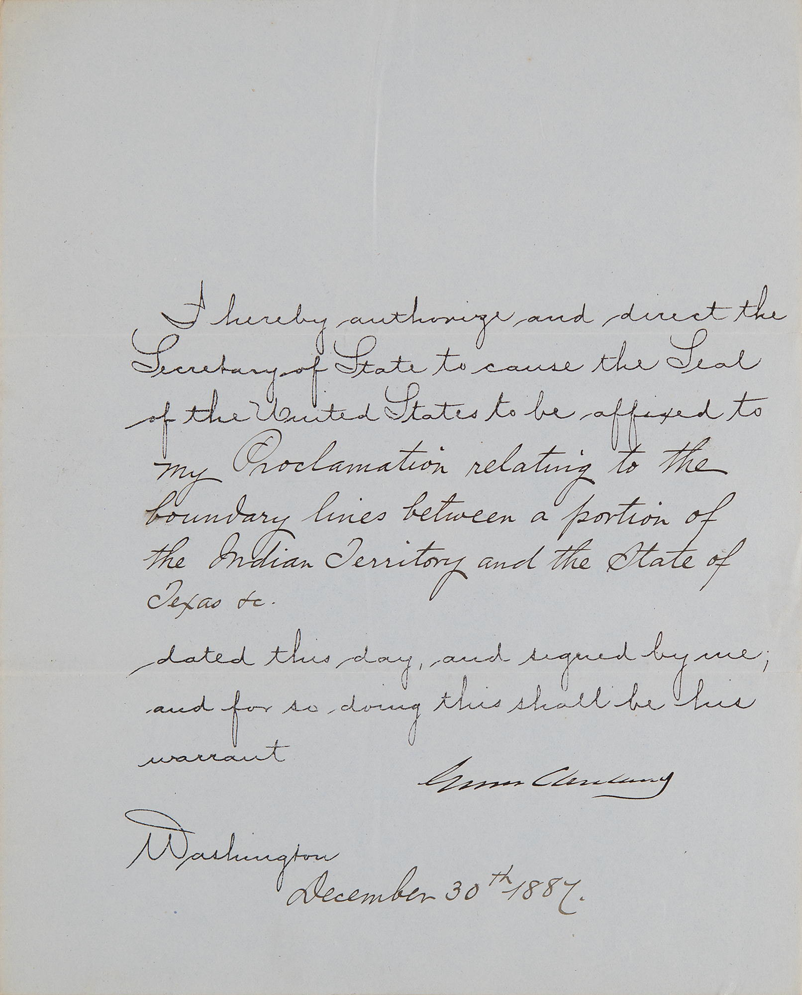 Partly-printed DS as president, one page, 8 x 10, December 30, 1887. President Cleveland directs the Secretary of State to cause the Seal of the United States to be affixed to “my Proclamation relating to the boundary lines between a portion of the Indian Territory and the State of Texas etc.” Signed neatly at the conclusion by Grover Cleveland. In fine condition.