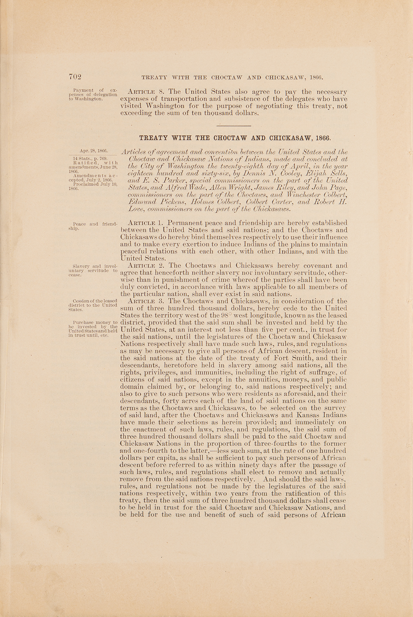 President Andrew Johnson's policies and actions toward Native Americans were complex and varied during his presidency. He inherited Andrew Jackson’s Indian Removal policy aimed at relocating Native American tribes from their ancestral lands to reservations further west, and, as this document reveals, his administration negotiated treaties with Native American tribes with the goal of securing land for white settlers. While Johnson was sympathetic to the plight of Southern states, he faced conflicts with tribes allied with the Confederacy, a group that included the Choctaw and Chickasaw.