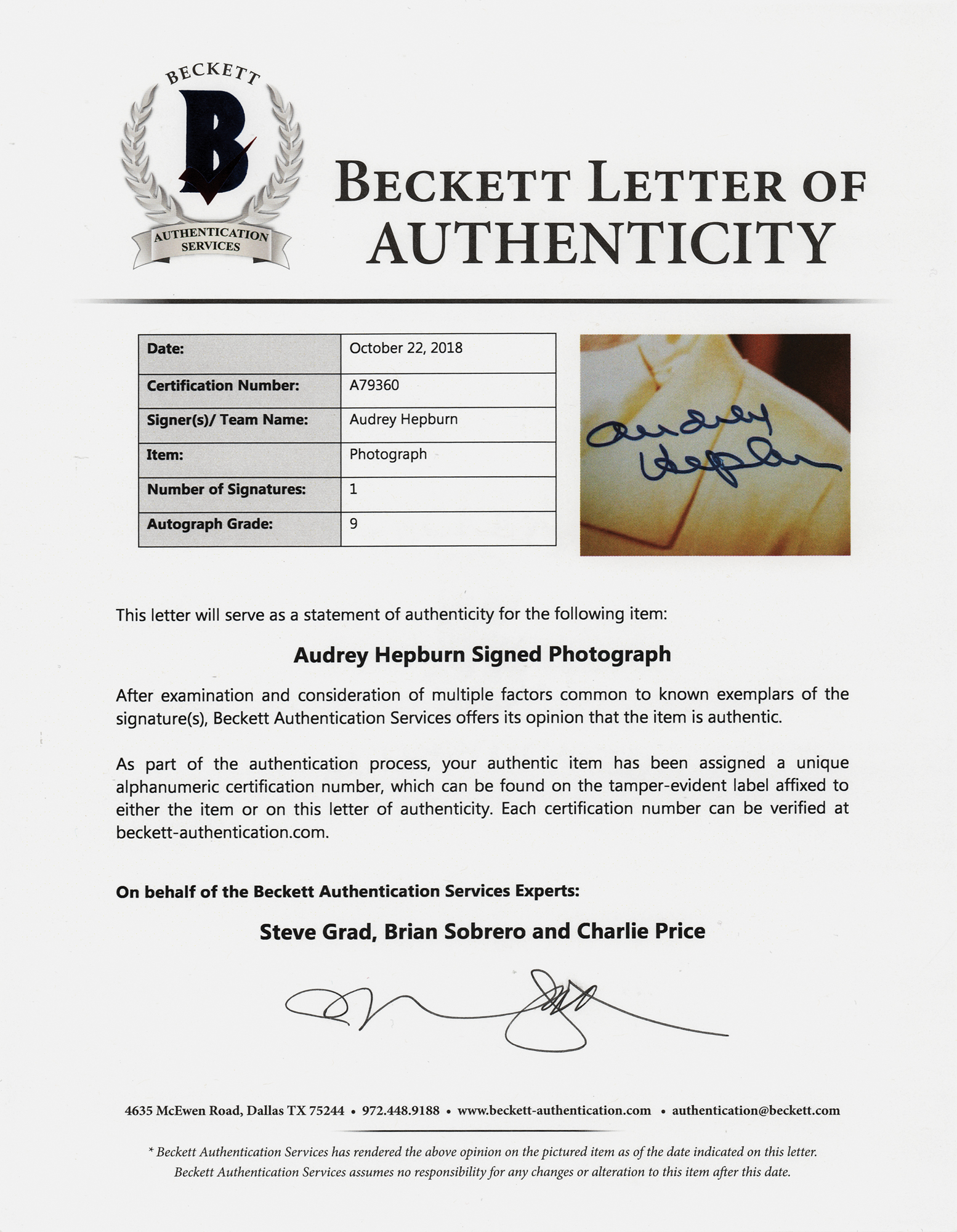 Color glossy 8 x 10 photo of Audrey Hepburn as Nicole Bonnet from the 1966 film How to Steal a Million, signed in blue felt tip. In very fine condition, with a Beckett label affixed to the lower left corner. Accompanied by a full letter of authenticity from Beckett Authentication Services.