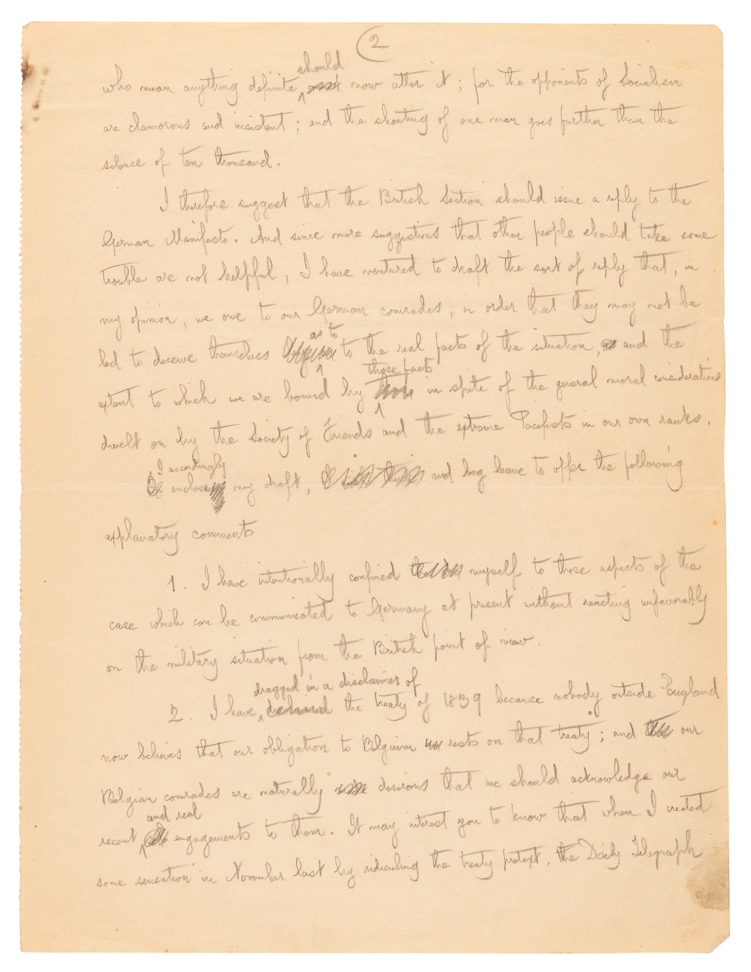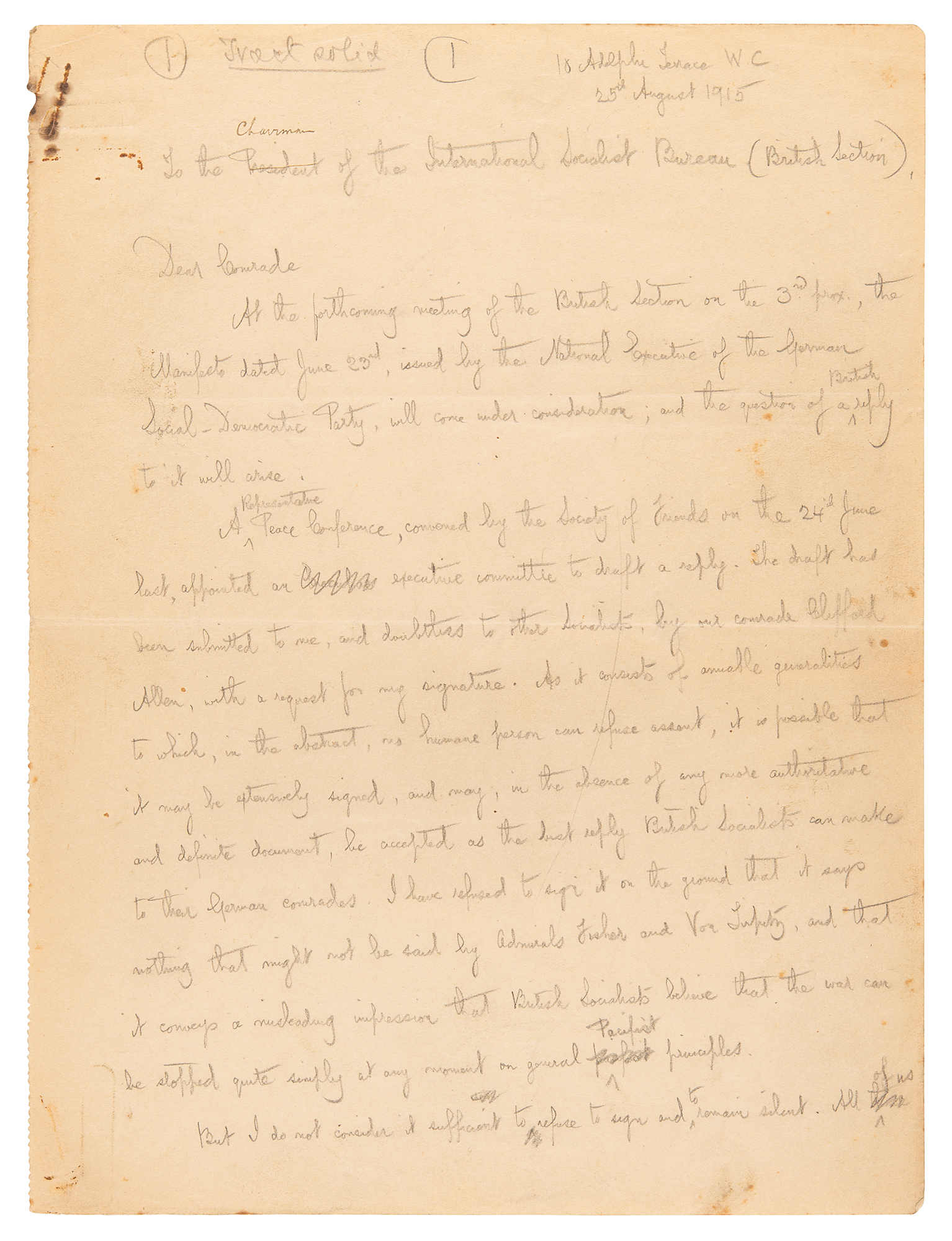 But I do not consider it sufficient to refuse to sign and to remain silent. All of us who mean anything definite should now utter it; for the opponents of Socialism are clamorous and insistent; and the shouting of one man goes further than the silence of ten thousand. I therefore suggest that the British Section should issue a reply to the German Manifesto…I have returned to draft the sort of reply that, in my opinion, we owe to our German comrades, in order that they may not be led to deceive themselves as to the real facts of the situation, and the extent to which we are bound by these facts in spite of the general moral considerations dwelt on by the Society of Friends and the extreme Pacifists in our own ranks." He goes on to outline the key points of his proposed draft, with commentary on his process. In very good to fine condition, with some light creasing and toning, and rusty paperclip impressions to the upper left corners.