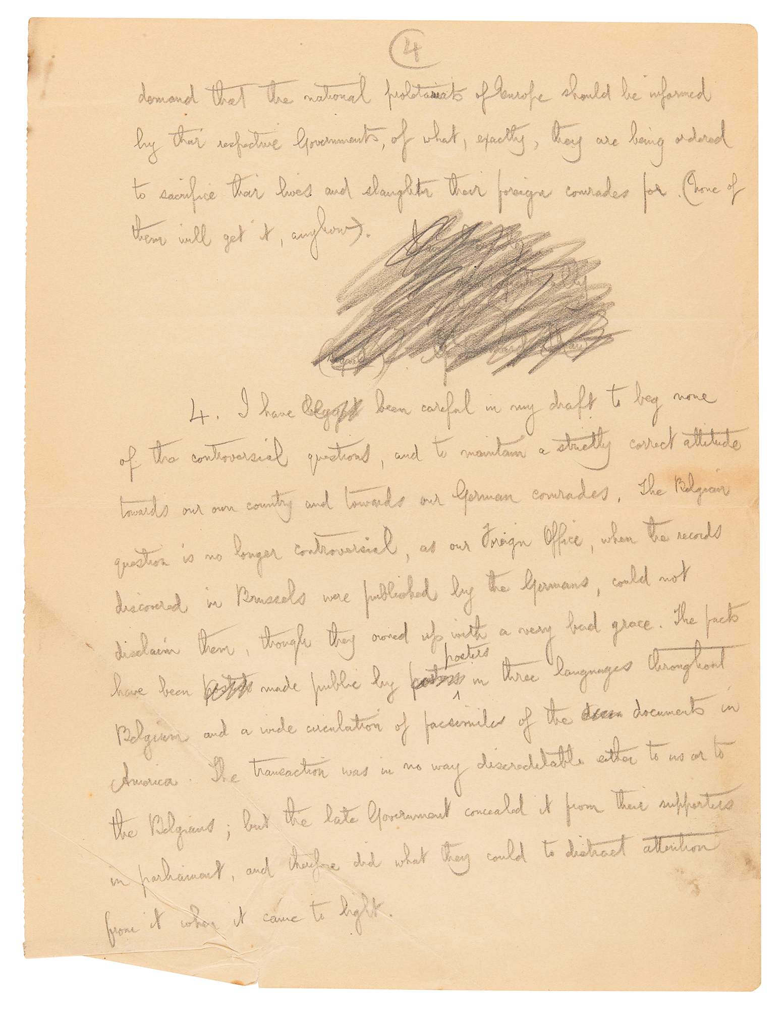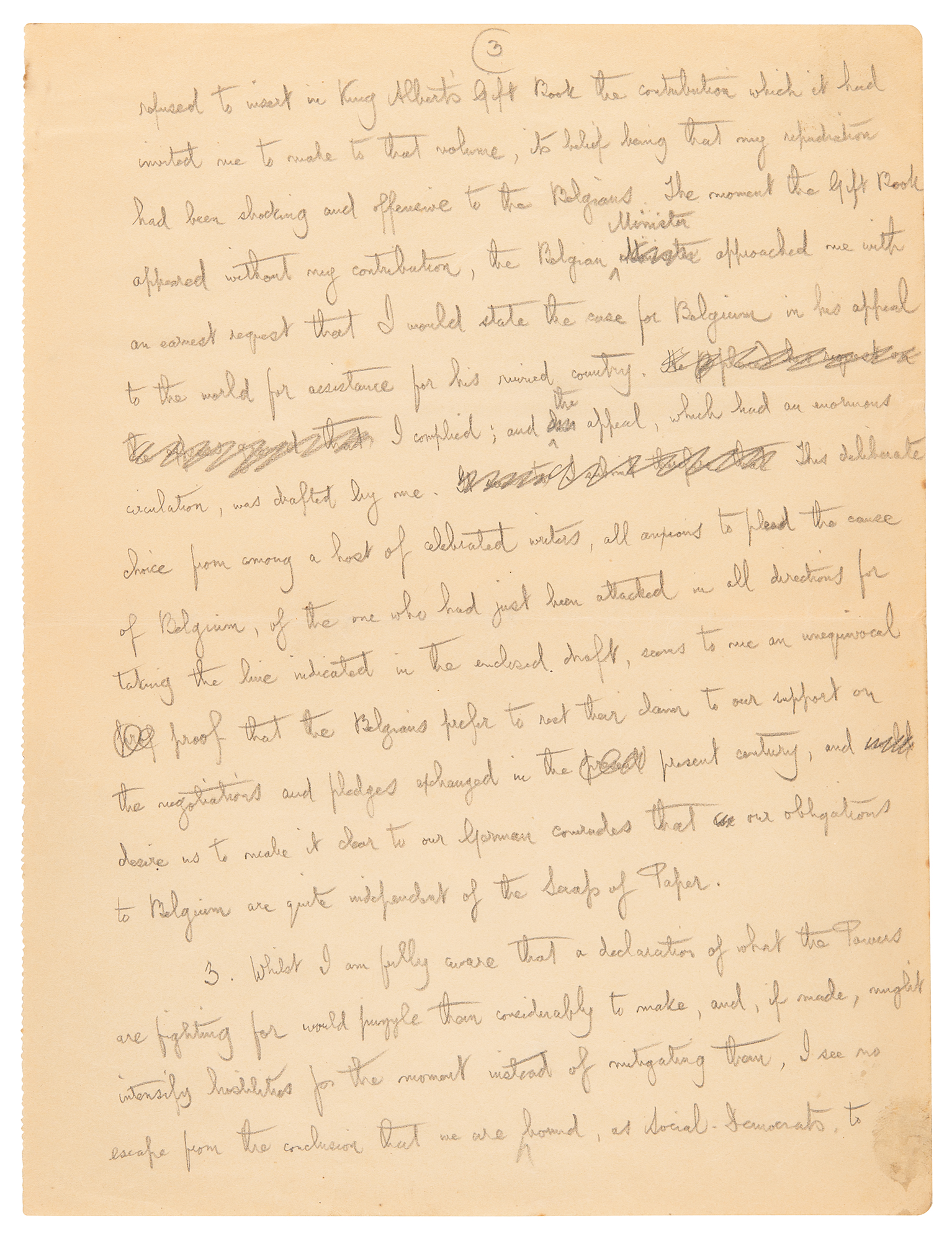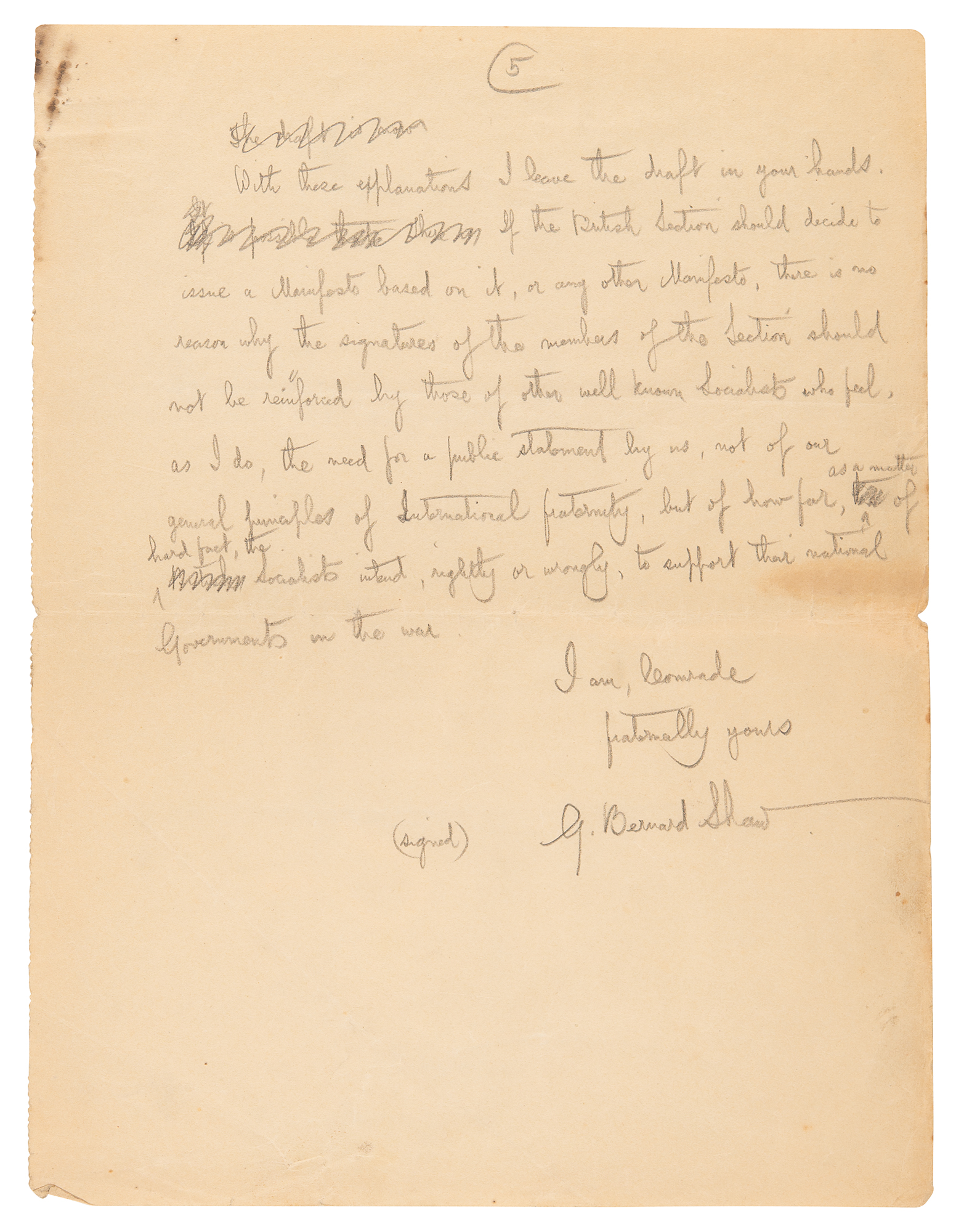AMS in pencil, signed "G. Bernard Shaw," five pages, 8 x 10.5, August 25, 1915. Shaw pens an open letter to the chairman of the "International Socialist Bureau," commenting on the international situation amidst World War I. In part: "Dear Comrade, At the forthcoming meeting of the British Section on the 3rd prox., the Manifesto dated June 23rd, issued by the National Executive of the German Social-Democratic Party, will come under consideration; and the question of a British reply to it will arise. A Representative Peace Conference, convened by the Society of Friends on the 24th June last, appointed an executive committee to draft a reply. The draft has been submitted to me, and doubtless to other Socialists, by our comrade Clifford Allen, with a request for my signature. As it consists of amiable generalities to which, in the abstract, no humane person can refuse assent, it is possible that it may be extensively signed, and may, in the absence of any more authoritative and definite document, be accepted as the best reply British Socialists can make to their German comrades. I have refused to sign it on the ground that it says nothing that might not be said by Admirals Fisher and Von Tirpitz, and that it conveys a misleading impression that British Socialists believe that the war can be stopped quite simply at any moment on general Pacifist principles.
