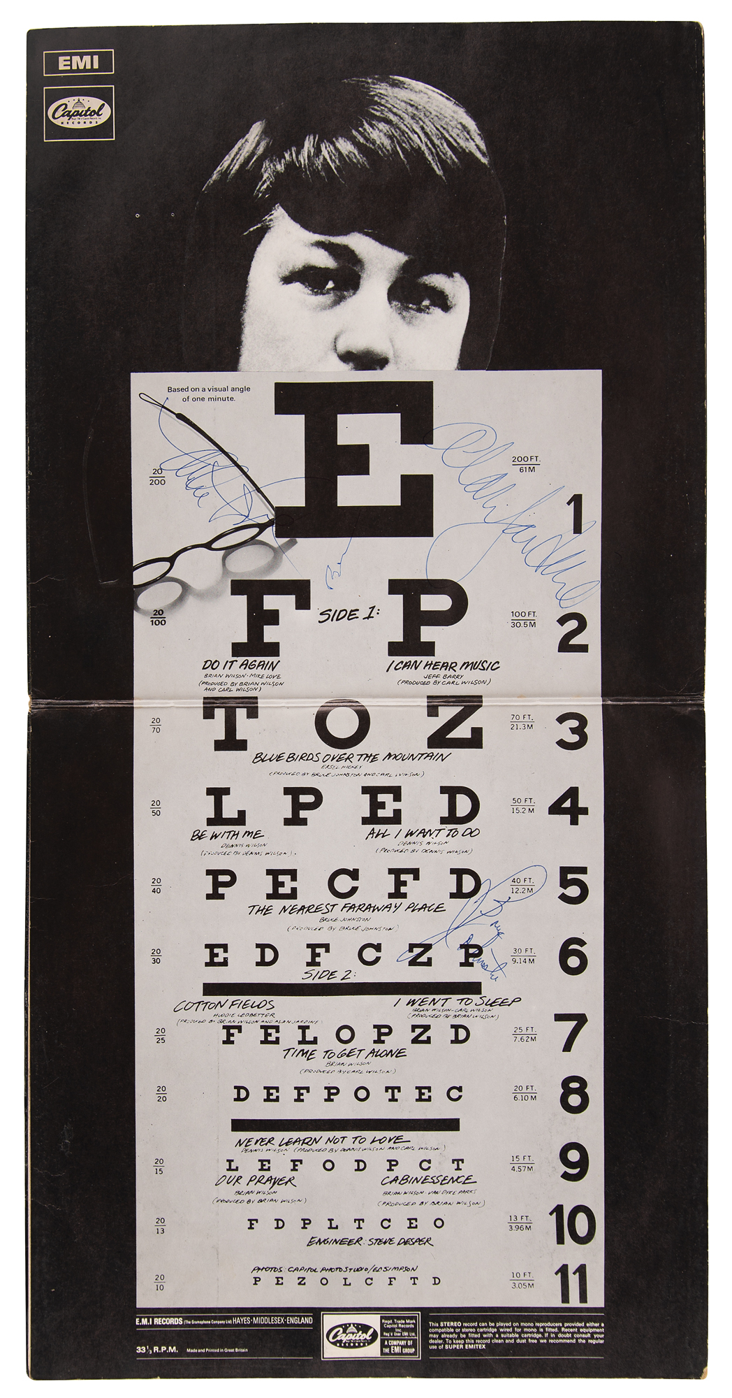 20/20 album signed on the inner gatefold in blue ink by Brian Wilson, Al Jardine, Bruce Johnston, and Mike Love. In very good to fine condition, with overall rippling. The record is not included.