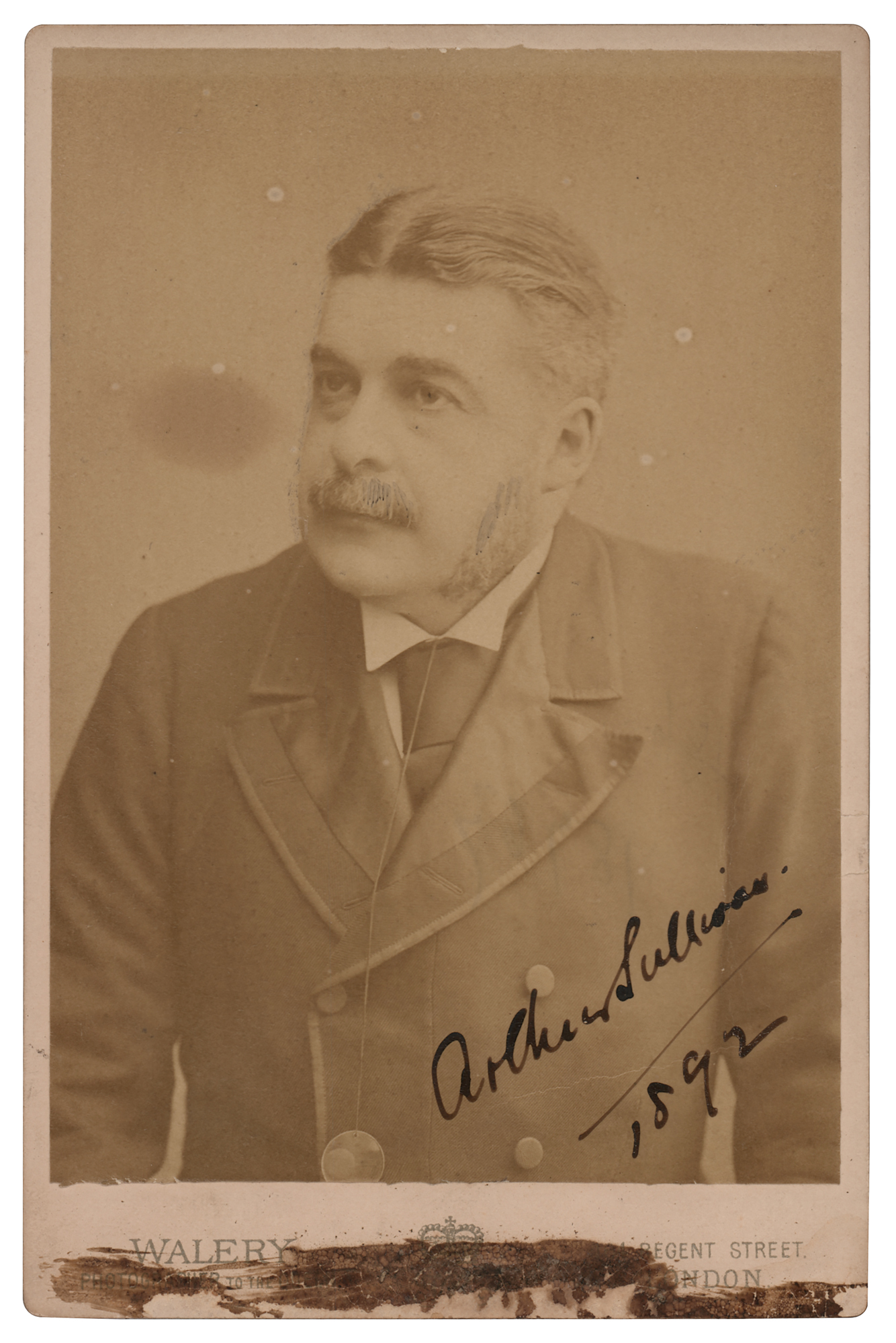 British composer (1842–1900) best known for his collaborations on more than a dozen classic comic operas with librettist W. S. Gilbert. Uncommon 4.25 x 6.5 cabinet photo of the English opera composer by Walery of London, boldly signed in ink, "Arthur Sullivan, 1892." In very good to fine condition, with a crease touching his last name, a light stain to the background, and some old adhesive residue to the bottom border.