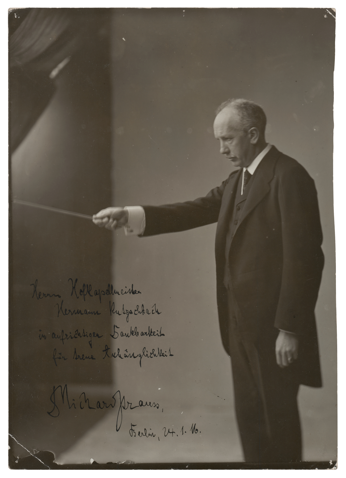 Scarce vintage matte-finish 6.75 x 9.25 photo of Richard Strauss holding his conductor's baton, neatly signed and inscribed in fountain pen in German, "Herrn Hofkapellmeister Hermann Rutzschbach…D. Richard Strauss, Berlin, 24.1.16.” In fine condition, with tack holes, and small creases, to the corners. A fantastic pose with a desirable association, presented from one conductor to another.