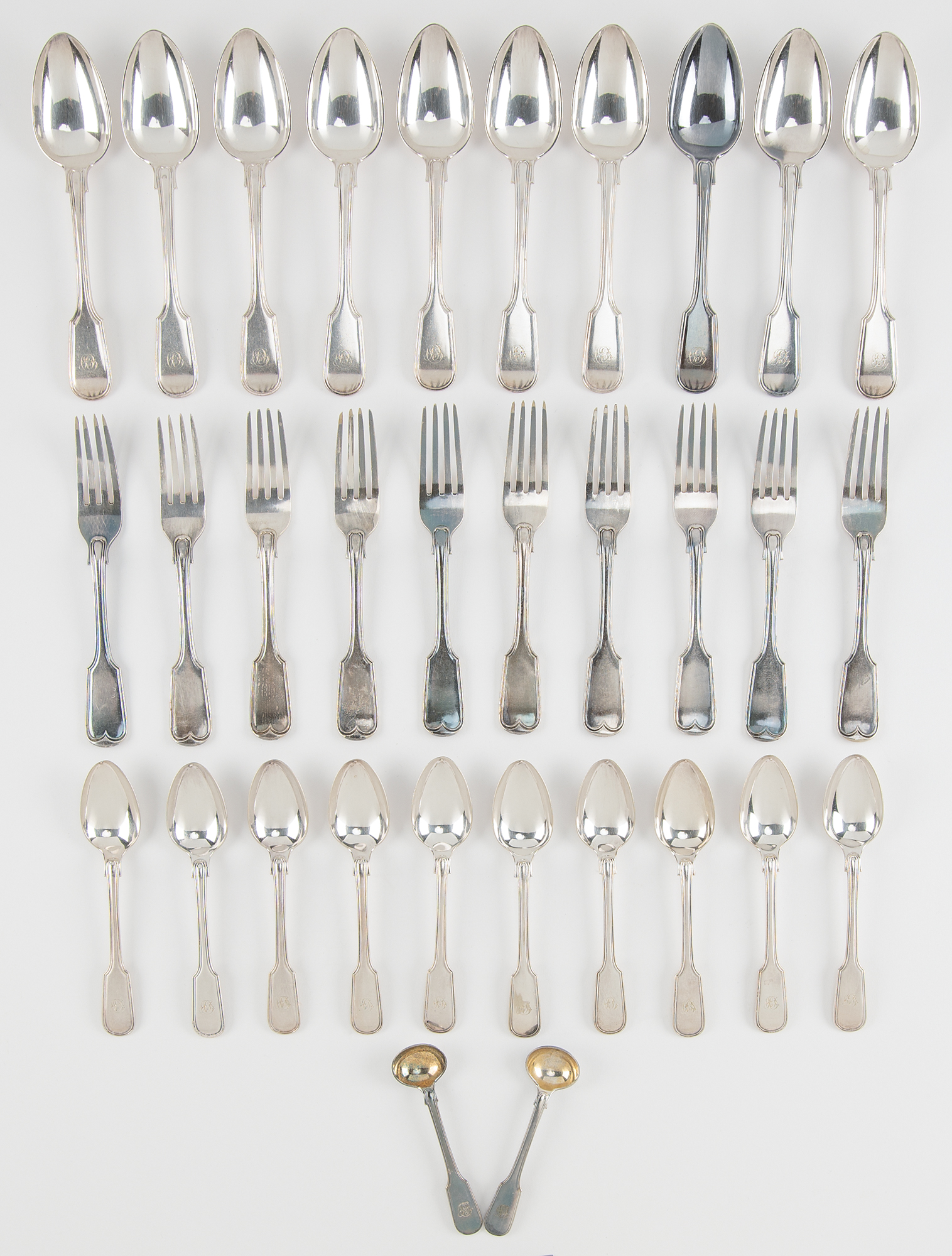 Fantastic set of 32 silver-plated spoons and forks personally owned and used by Charles Dickens at Gad's Hill Place, all elegantly engraved with his monogram in fancy script, "CD." Includes ten dessert spoons, ten forks, ten tea spoons, and two tiny salt spoons, all of a matching fiddle leaf thread pattern, with manufacturer's stamps of Martin, Hall & Co. of Sheffield, circa 1860. In overall very good to fine condition, with light wear from use.