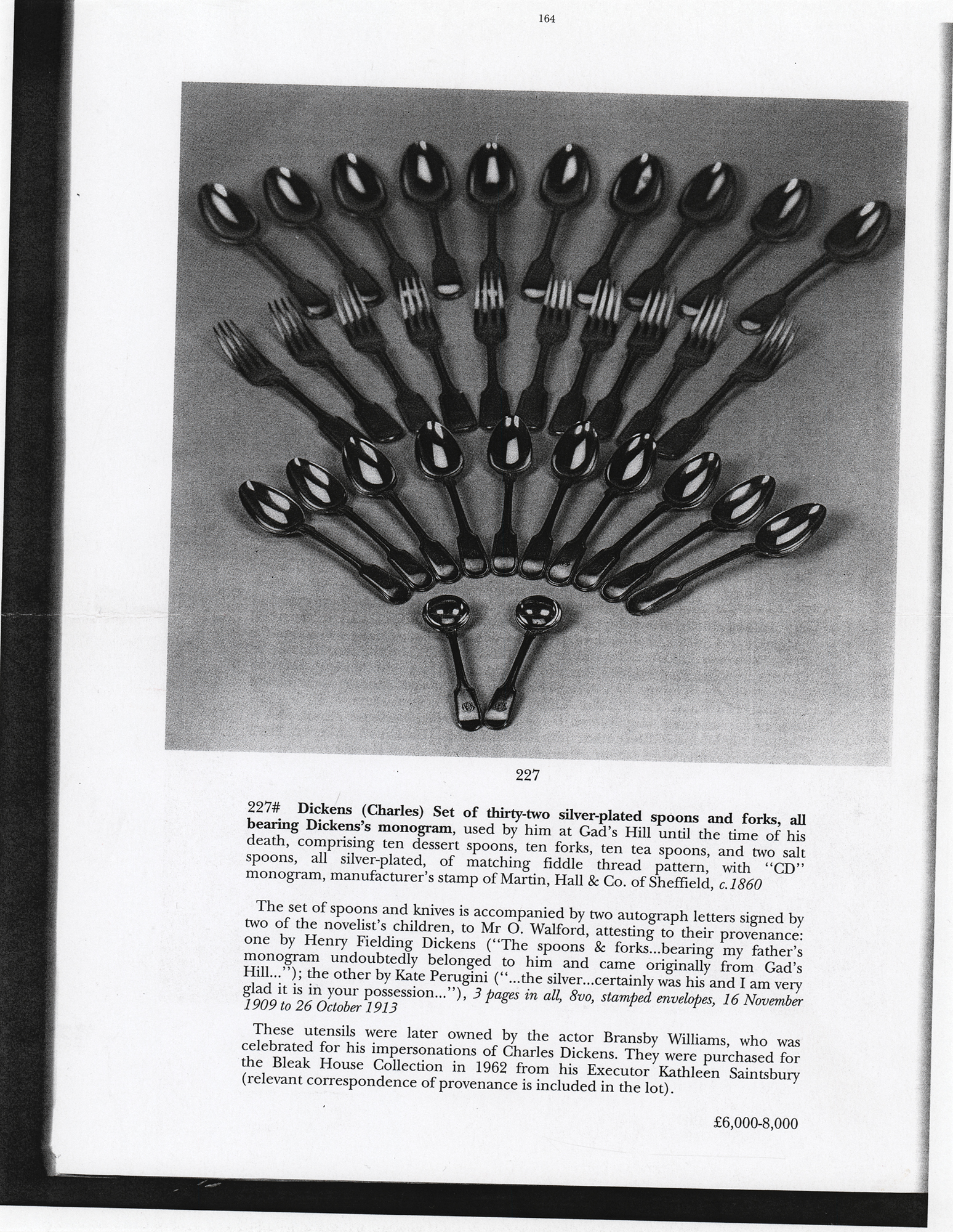 Provenance: Lot 227, English Literature and History including The Charles Dickens Archive, Sotheby's, July 15, 1999. Accompanied by a photocopy of the Sotheby's catalog page, which depicts all 32 pieces and notes that two of the novelist's children, Henry Fielding Dickens and Kate Perugini, attested to Dickens's ownership and use of the silverware set. Unfortunately, those letters have been lost, as has later correspondence documenting their ownership by actor Bransby Williams, and the purchase of the silverware for the Bleak House Collection in 1962.