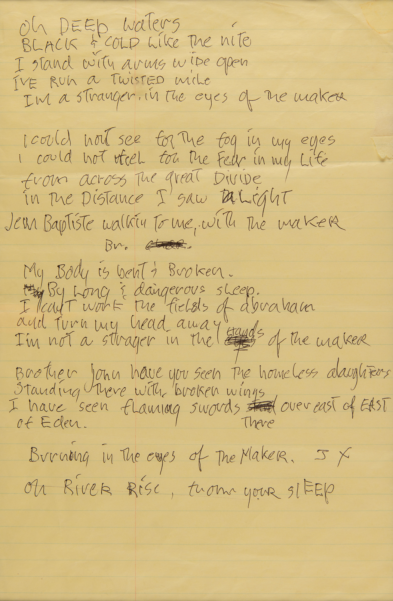 Unsigned handwritten lyrics by Jerry Garcia, one page, 8 x 12.5, no date. Garcia pens the lyrics to 'The Maker,' a song by Daniel Lanois that was regularly played in concert by the Jerry Garcia Band from 1992 to 1995. Garcia writes, in full: