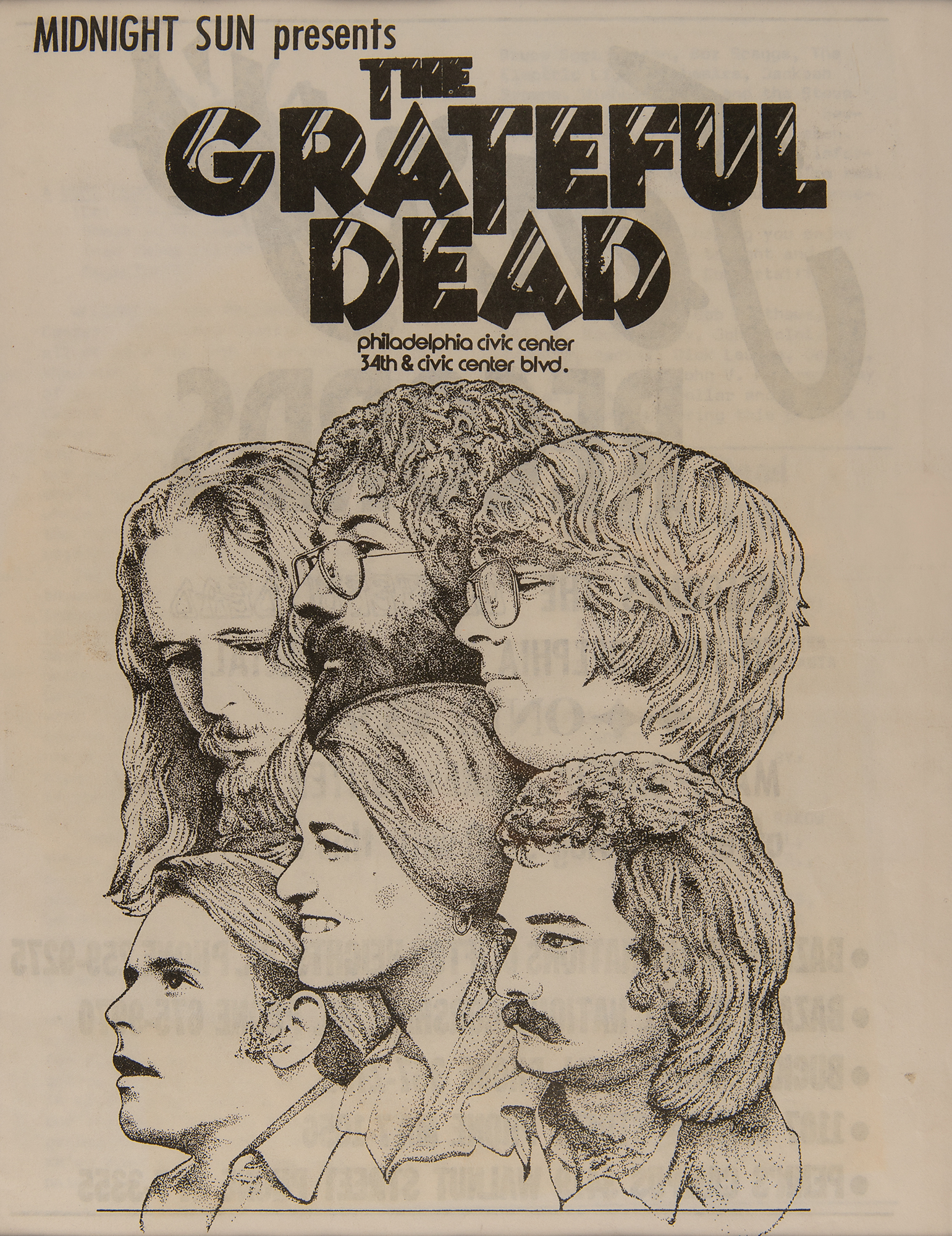 Handsomely double-matted and framed with a concert flyer for the Grateful Dead at the Philadelphia Civic Center to an overall size of 25.25 x 20.25. In fine condition, with light folds and creases.