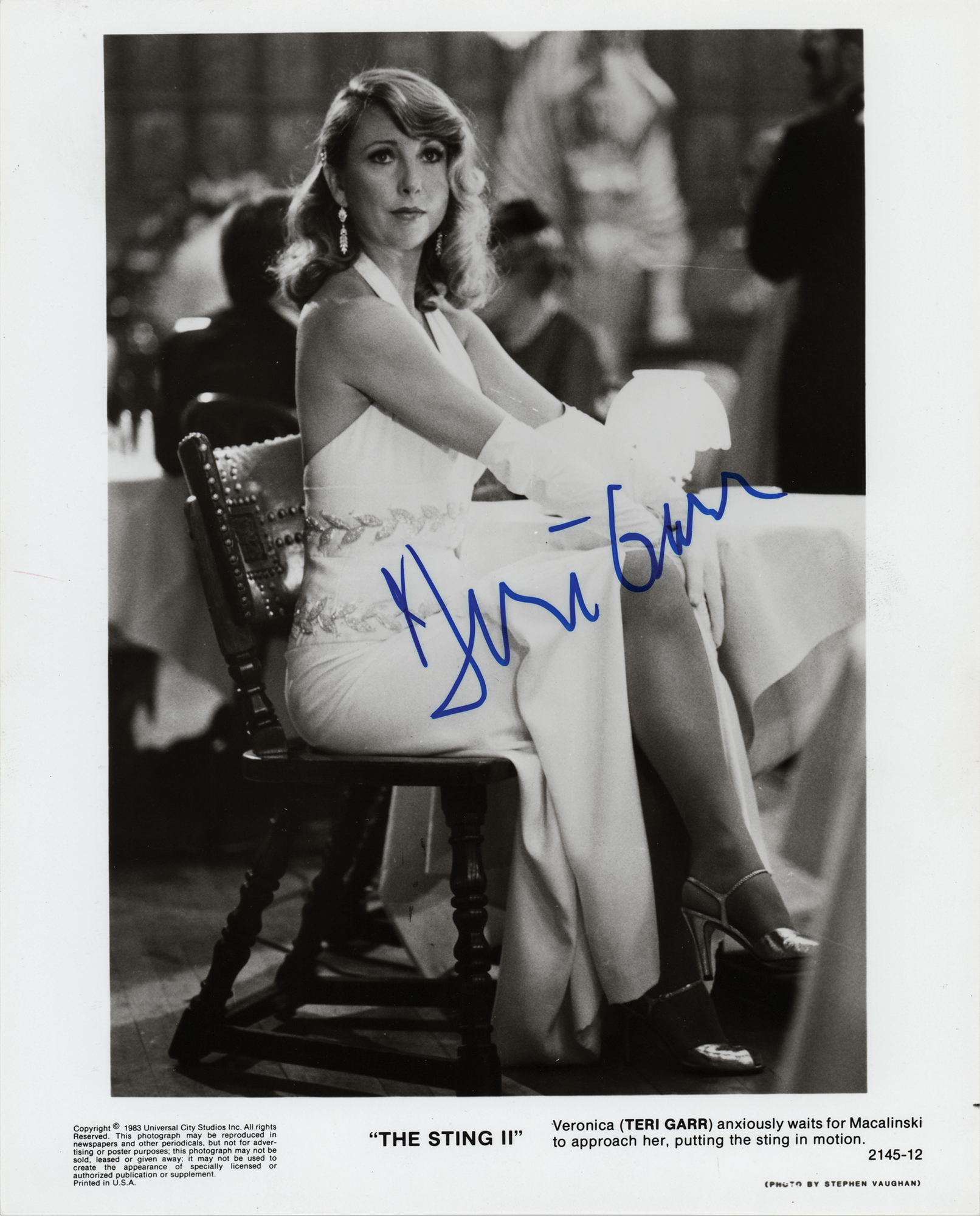 Glossy 8 x 10 photo of Teri Garr as Veronica in the 1983 comedy The Sting II, signed in blue felt tip. In very fine condition.
