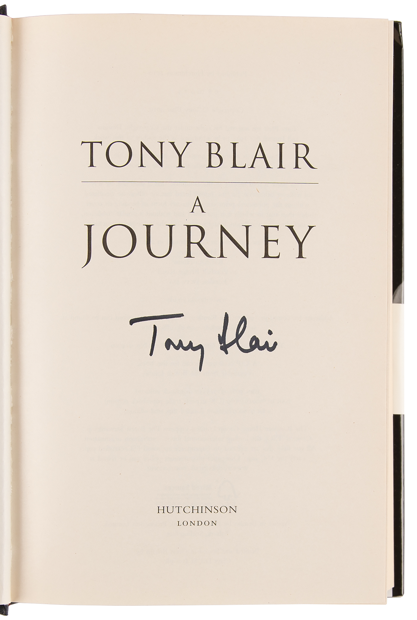 Two items: an official Rawlings Major League (Selig) baseball, signed on a side panel in black felt tip by Tony Blair; and a later printing of Tony Blair: A Journey, hardcover with dust jacket, published by Hutchinson of London in 2010, signed on the title page in black felt tip by Tony Blair. In fine condition, with a PSA/DNA label affixed to the rear of the baseball. Accompanied by a certificate of authenticity from PSA/DNA for the baseball.