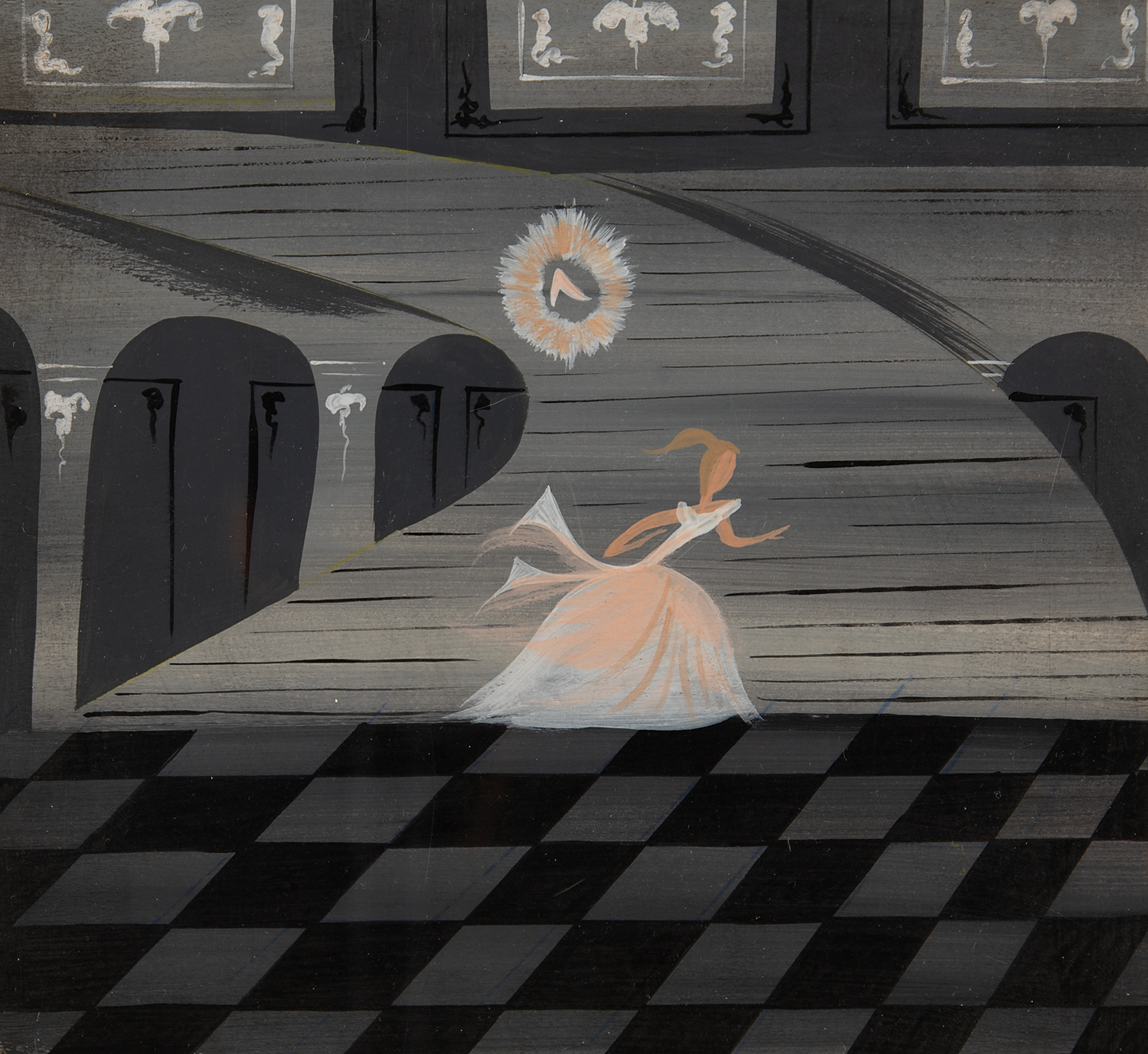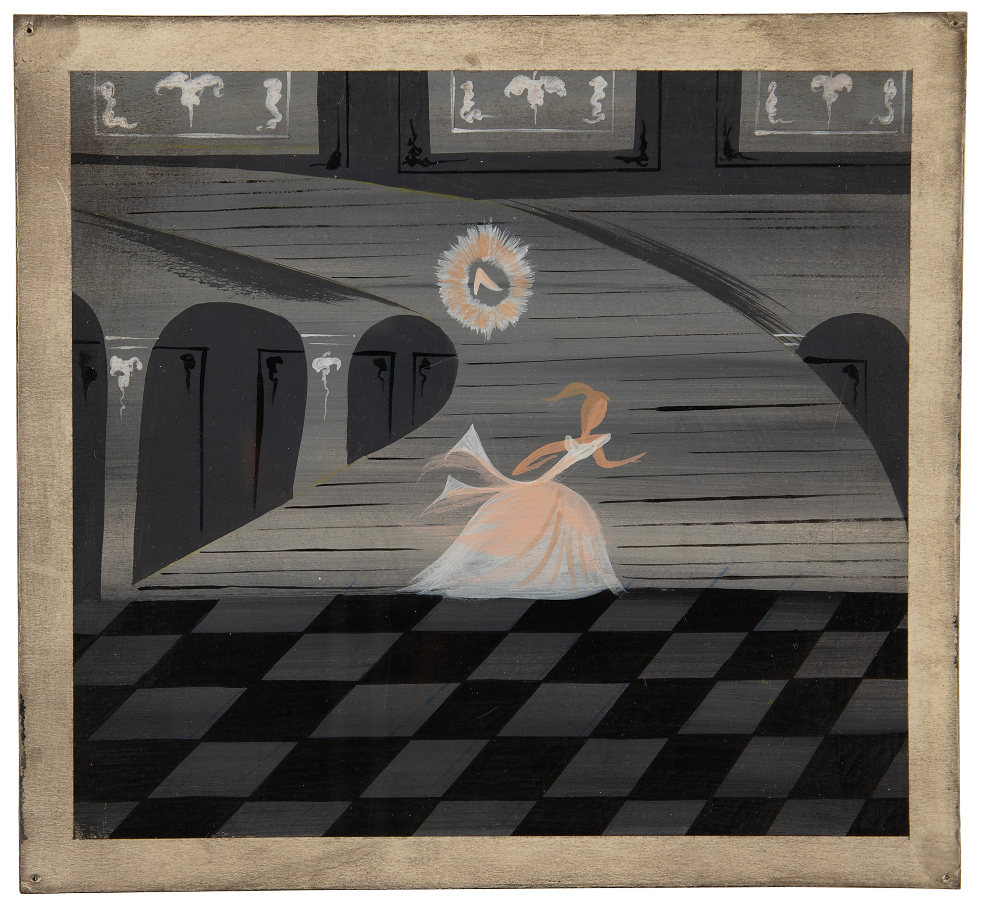 (Walt Disney Studios, 1950) Exquisite original concept painting by Mary Blair for Cinderella, showing the title character fleeing from the castle in her white ball gown, leaving a single glass slipper glowing on the winding staircase. An impressive rendering of the stark interior castle just moments before midnight, Blair employs shades of white, gray, and black to cast a nervous atmosphere to the painting; Blair’s decision to remove the background color not only places all focus on Cinderella and her abandoned glass slipper, but it likewise adds a greater sense of urgency and anxiety as Cinderella makes her last-second escape. Accomplished in tempera on 9.75 x 9 artist's board. In fine condition, with tack holes to borders.