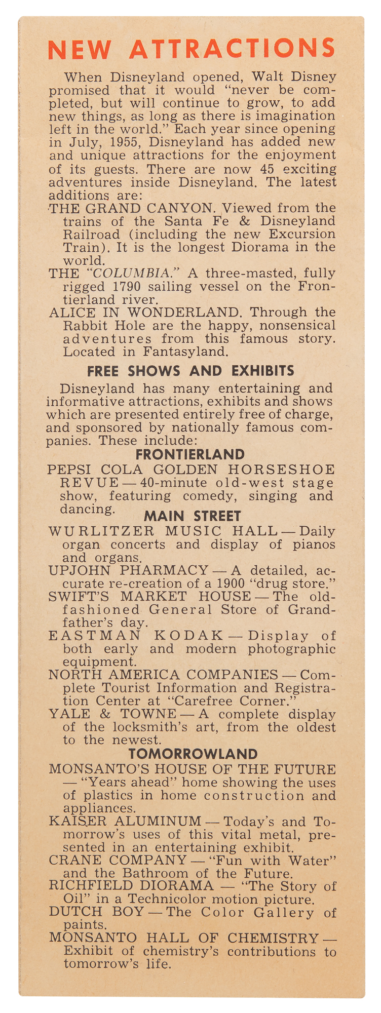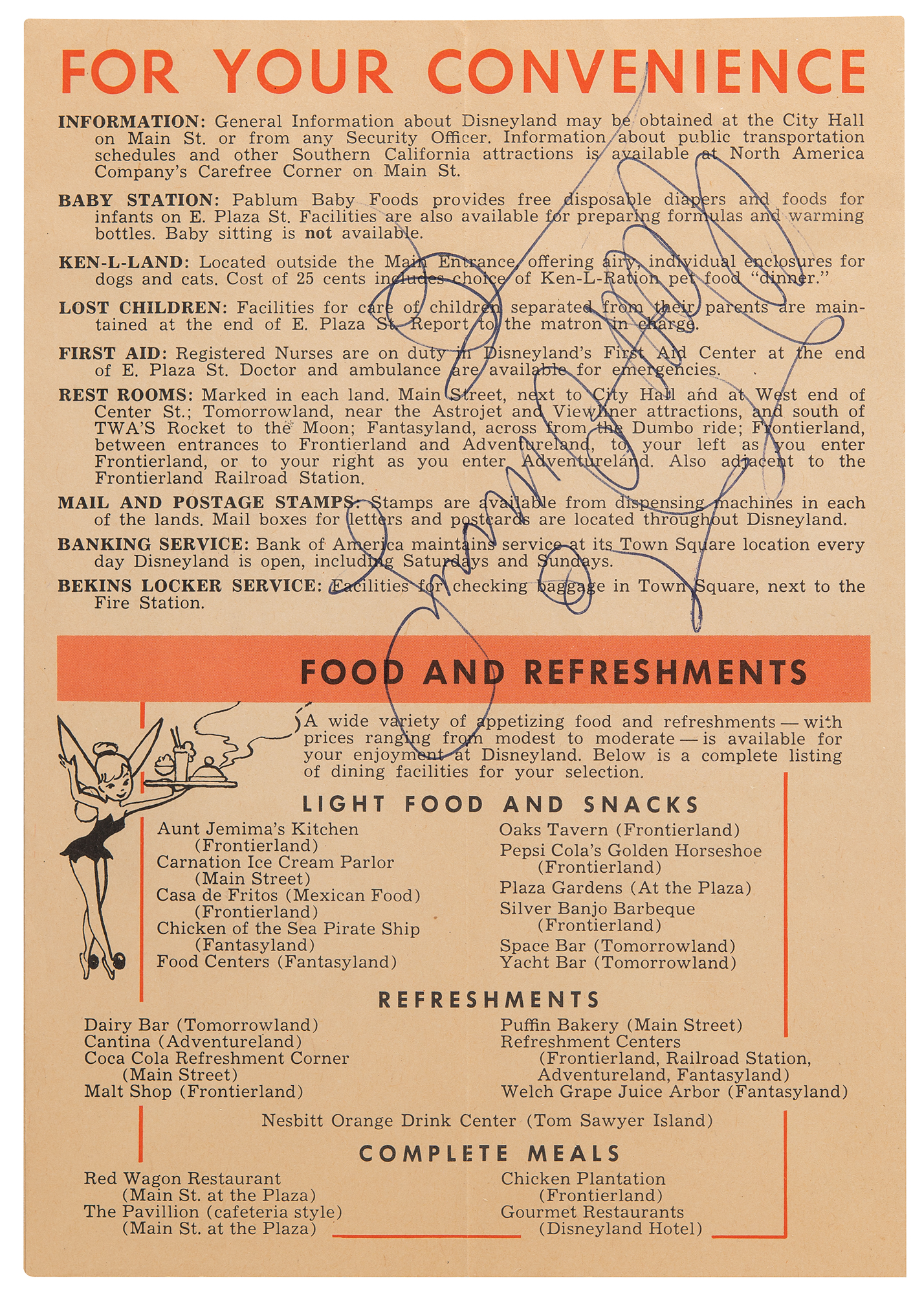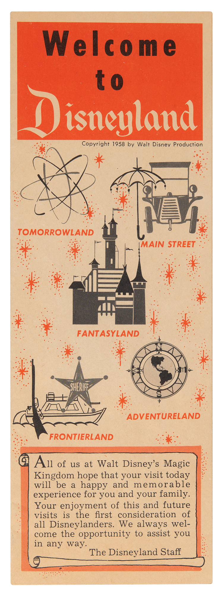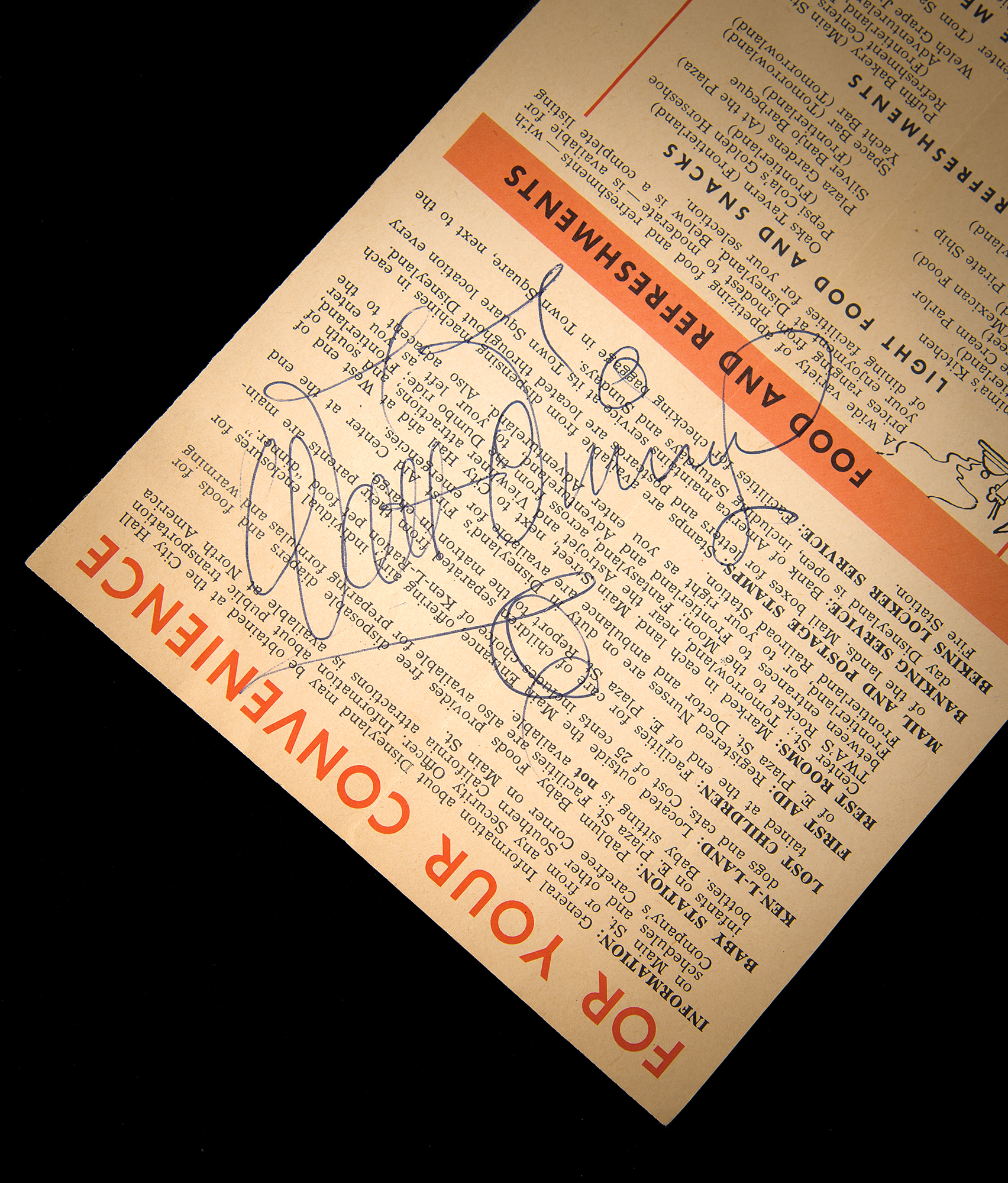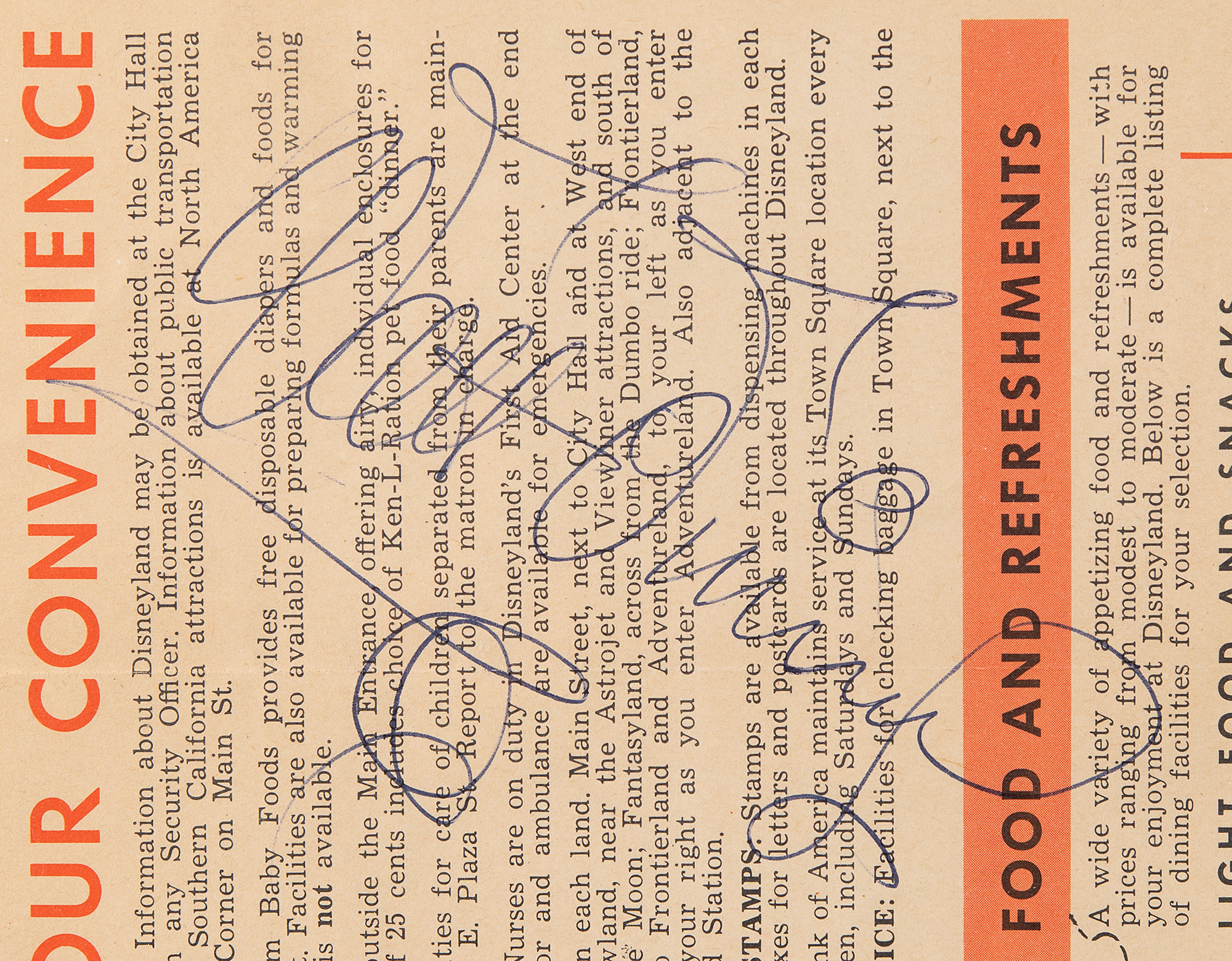 Vintage accordion-fold ‘Welcome to Disneyland’ brochure from circa 1958, measures 12 x 8.5 open, signed upside down on the back page in ballpoint, “Walt Disney.” This rare brochure retains great color and bold text, and boasts a variety of vintage Disney designs related to rides and attractions like Tomorrowland, Main Street, Fantasyland, Frontierland, and Adventureland. When unfolded, the brochure reveals a wonderful map of ‘Disneyland’s Five Lands,’ the lower left of which bears a small ‘welcome’ box from Walt Disney. In fine condition. Accompanied by a certificate of authenticity from Phil Sears Collectibles, which notes that the signature is consistent with examples from the 1950s.