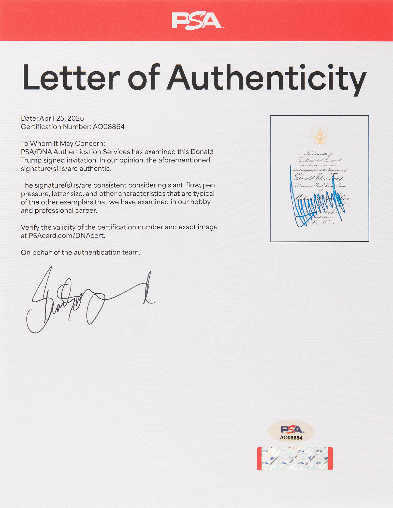 Official 8.5 x 11 printed invitation for the inauguration of President Donald Trump and Vice President Mike Pence on January 20, 2017, issued by the Presidential Inaugural Committee, signed prominently in blue felt tip by Donald Trump. In very fine condition. Accompanied by a full letter of authenticity from PSA.