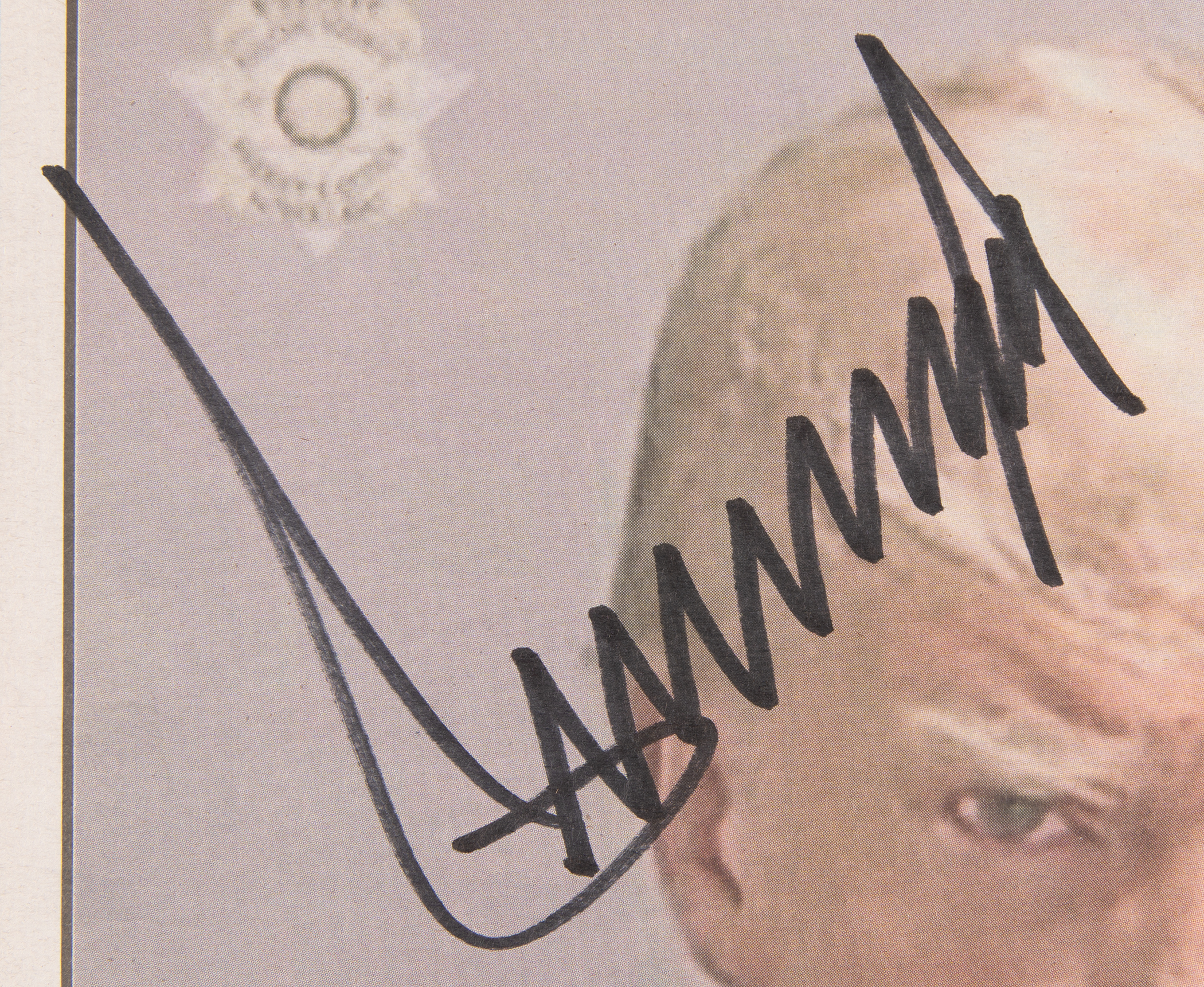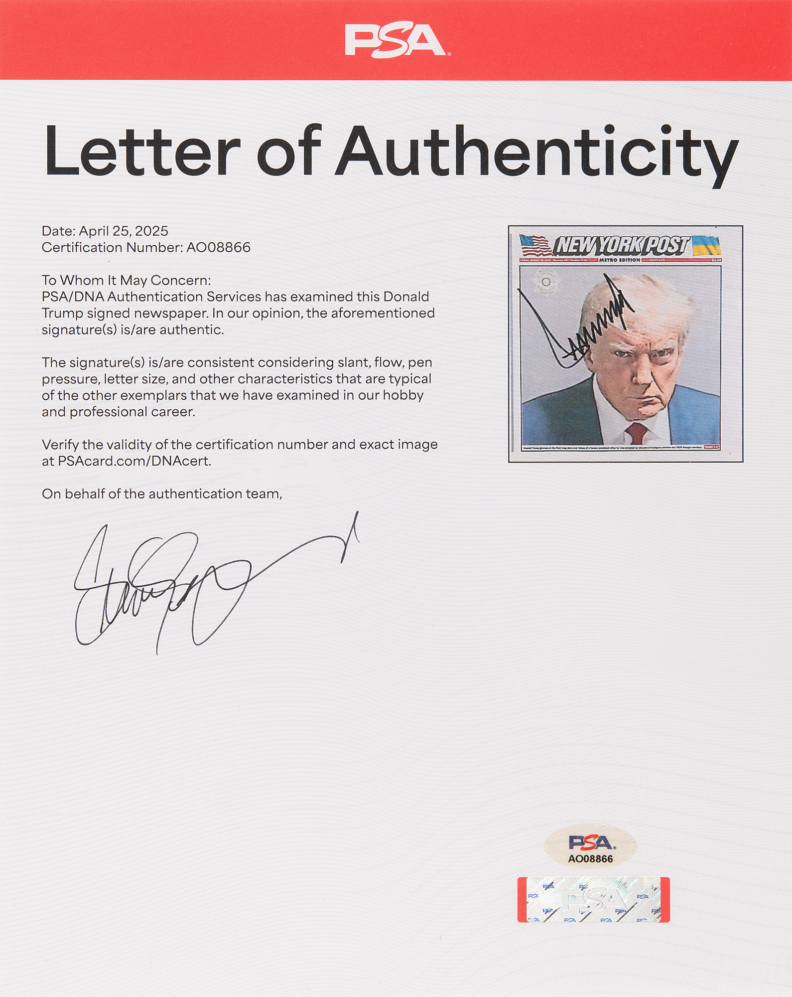 Metro edition of the New York Post newspaper from Friday, August 25, 2024, sixty-three pages, 11.5 x 12, the front page featuring a color image of Donald Trump’s mug shot, signed prominently in black felt tip by Trump. The photograph was taken a day earlier at the Fulton County Jail in Atlanta, Georgia, on August 24, 2023, after Trump voluntarily surrendered himself to authorities following his indictment on charges of election racketeering and related offenses. In fine condition. Accompanied by a full letter of authenticity from PSA. The consignor notes that the signature was obtained in person at a Trump rally.