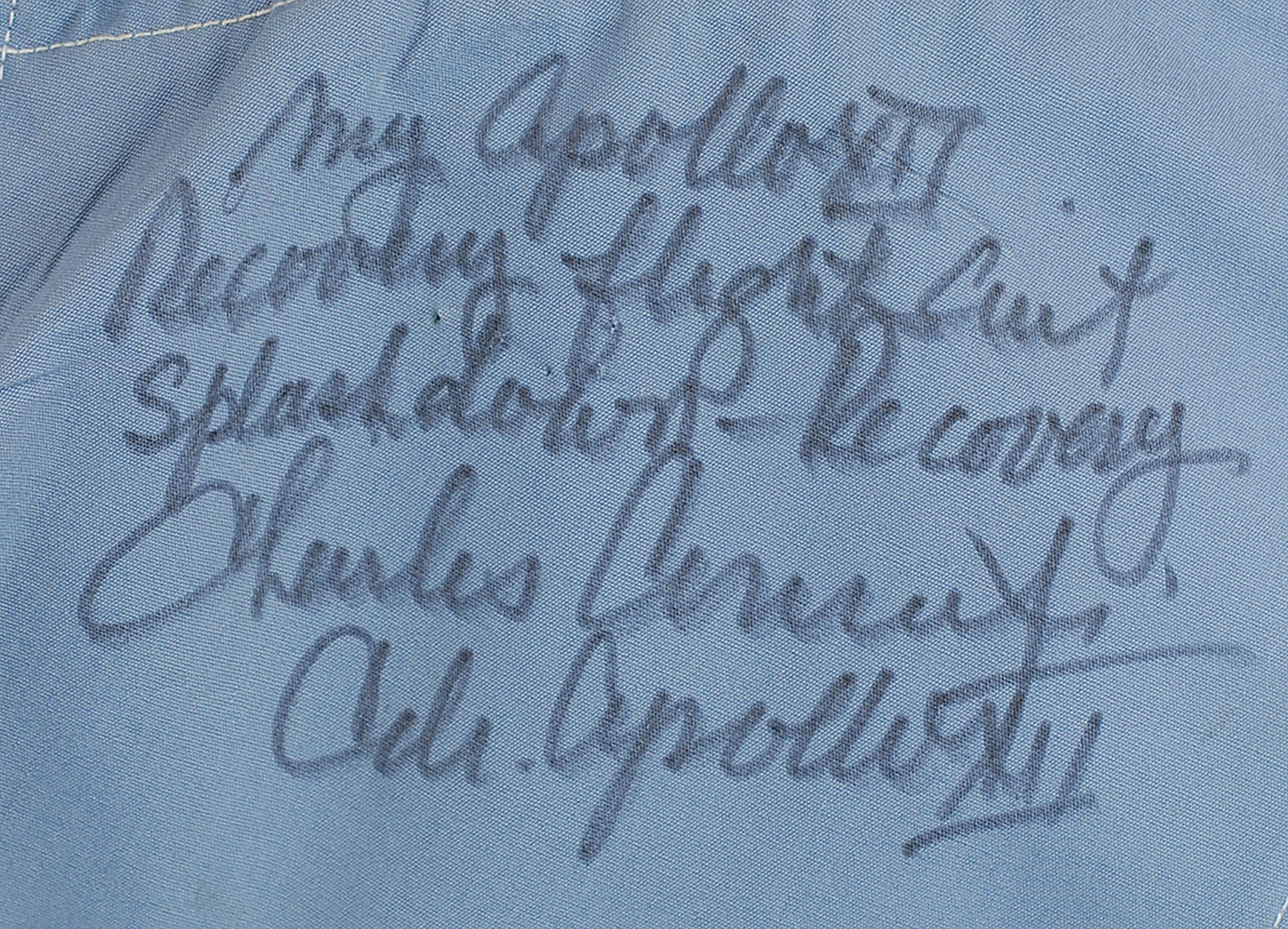 Charles Conrad's blue flight suit worn during recovery following the Apollo 12 mission, with an Apollo 12 mission patch on the right breast and an official NASA 'meatball' patch on the left, signed below in black felt tip, "My Apollo XII recovery flight suit, Splashdown-Recovery, Charles Conrad, Jr., Cdr. Apollo XII." The original Land Mfg. Co. Flite Wear tag is sewn into the collar area, labeled "Conrad" on a small white tag below. Expected wear and soiling from use, otherwise fine condition. Lasting from November 14 to November 24, 1969, the Apollo 12 crew of Conrad, Alan Bean, and Richard Gordon returned to Earth in the Command Module Yankee Clipper with a splashdown east of American Samoa. Wearing these blue flight suits, they were soon recovered by the USS Hornet. An absolutely fantastic piece- worn at the conclusion of the Apollo 12 mission-with direct astronaut provenance. The Leon Ford Collection.