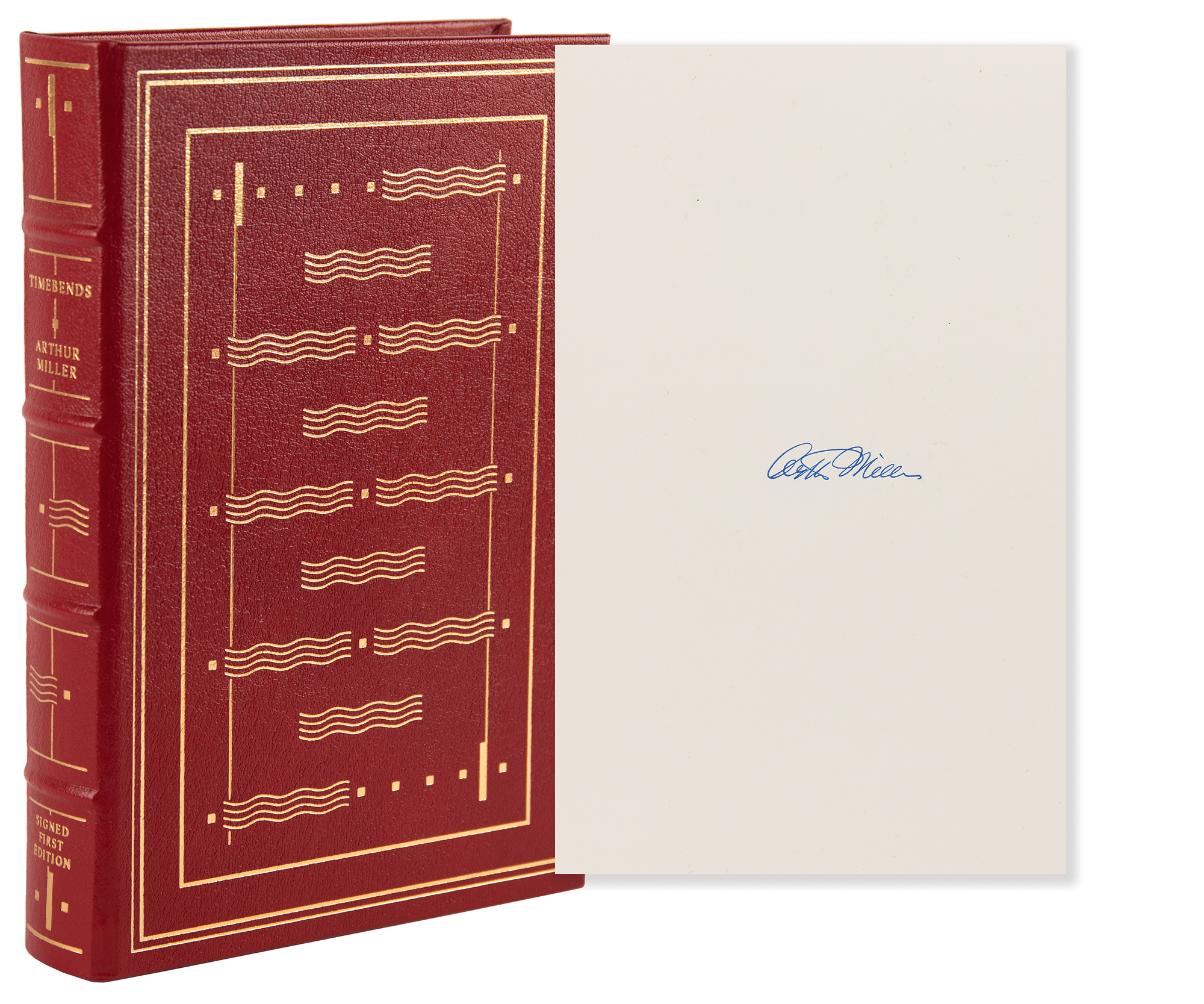 Signed book: Timebends: A Life. Limited first edition. Franklin Center, Pennsylvania: Franklin Library, 1987. Leatherbound hardcover, 6.5 x 9.5, 614 pages. Signed in blue ink on an opening page by Arthur Miller. In very fine condition. Accompanied by the publisher's introductory letter.