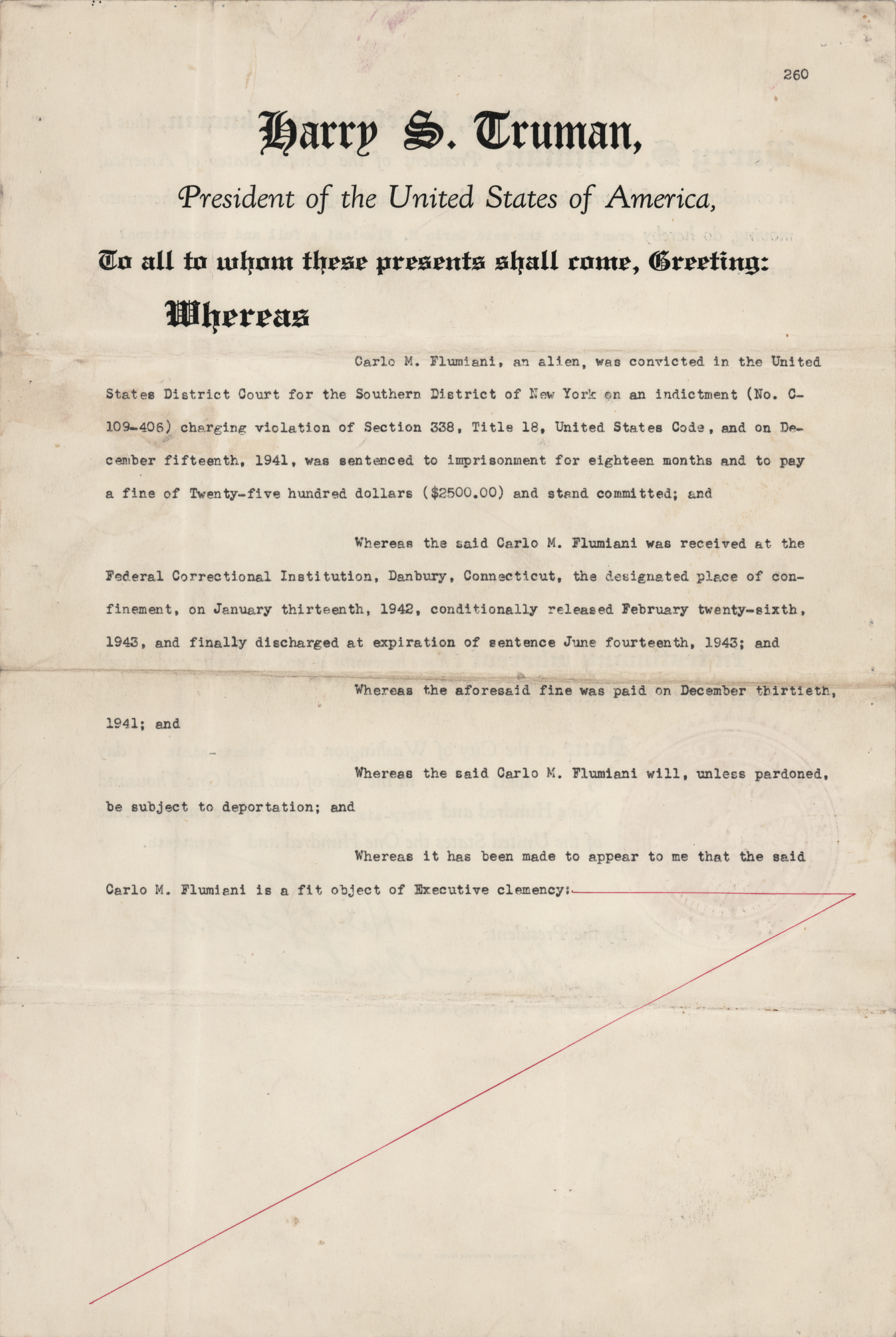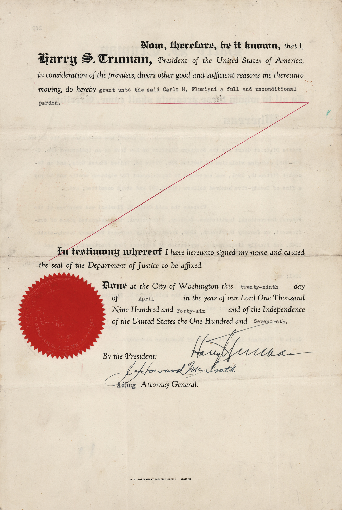DS as president, one page both sides, 9 x 13.5, April 29, 1946. President Truman issues a pardon to “Carlo M. Flumiani, an alien who was convicted in the United States District Court for the Southern District of New York on an indictment…charging violation of Section 338, Title 18…on December fifteenth, 1941, [and] was sentenced to imprisonment for eighteen months and to pay a fine of Twenty-five hundred dollars.” The reverse reads: “I, Harry S. Truman, President of the United States of America, in consideration of the premises, divers other good and sufficient reasons me thereunto moving, do hereby grant unto the said Carlo M. Flumiani a full and unconditional pardon.” Signed at the conclusion by President Truman and countersigned by acting Attorney General J. Howard McGrath, who was later appointed as Truman’s third Attorney General. The red seal affixed to the left side remains fully intact. In very good to fine condition, with light soiling, creasing, and intersecting folds.