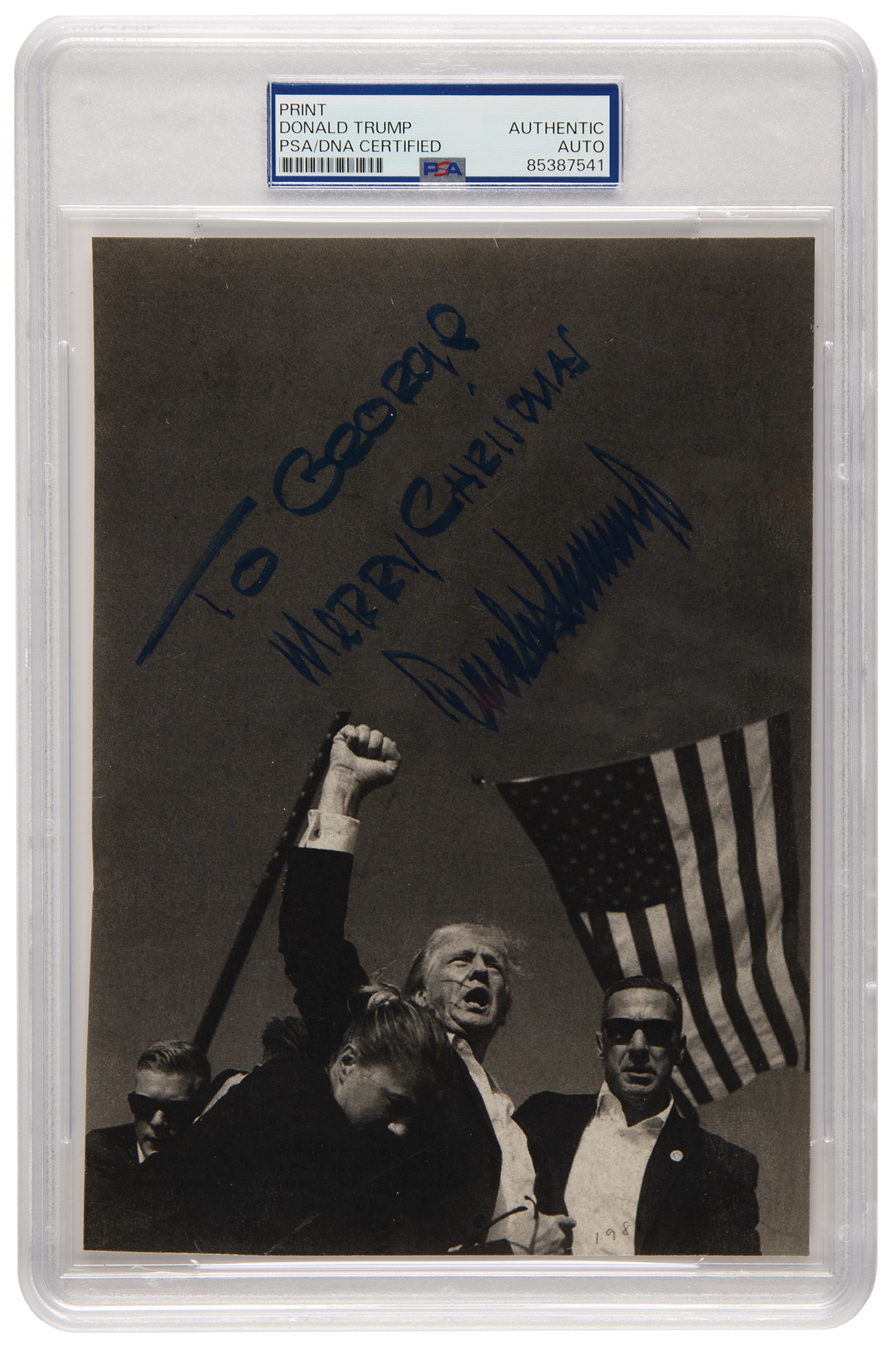 Rare felt tip signature and inscription, "To George, Merry Christmas, Donald Trump,” on an off-white 5.5 x 7.75 book page on which has been printed a black-and-white image of AP photojournalist Evan Vucci’s historic photo of Donald Trump pumping his fist after surviving an assassination attempt at an open-air campaign rally near Butler, Pennsylvania, on July 13, 2024. Trump’s face is shown streaked with blood as Secret Service agents escort him off the stage. In very fine condition. Encapsulated in a PSA/DNA authentication holder. A scarce and desirable autograph given Trump's addition of "Merry Christmas"—the first such example we have offered.
