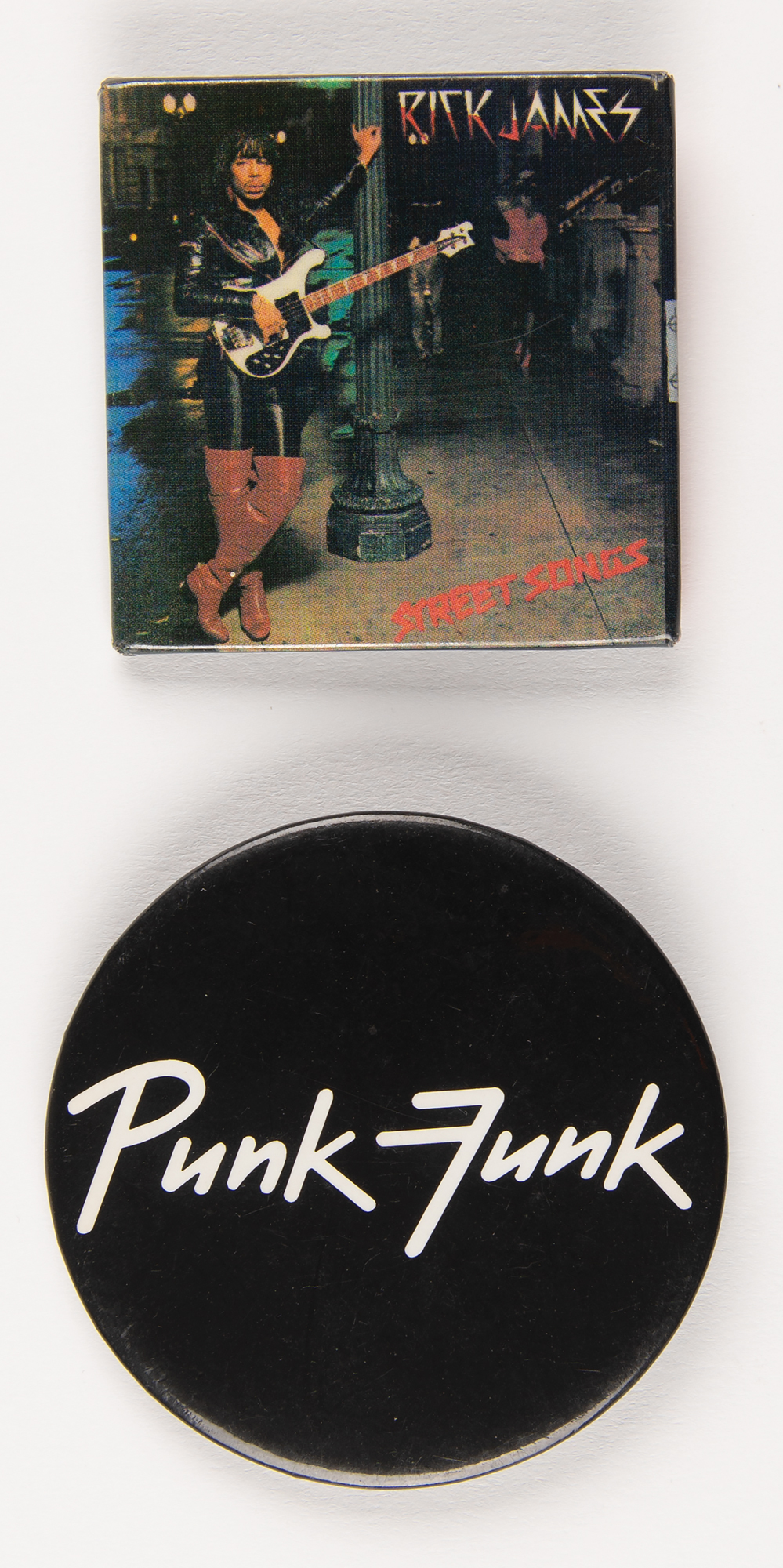 Additionally includes: Sarna's backstage pass for the "Rick James Throwin' Down Tour 1982," signed by Rick James's brother, tour manager, and noted visual artist LeRoi Johnson; two cloth backstage passes from the 1982 tour, marked "Stagehand" and "All Access"; two different "Stone City Band" tour laminates, marked "5" and "26"; two metal pins, one with "Punk Funk" in white lettering and one with the "Rick James / Street Songs" album cover; a Rick James Christmas card, featuring a portrait of the band with Santa Claus on one side, and a printed message on the other: "Have a Merry Christmas and a Funky New Year"; a ticket to The Jacksons World Tour 1979, for their show at Memorial Auditorium in Buffalo, New York, on October 27, 1979; and a Rick James "Celebration of Life" memorial program from 2004.