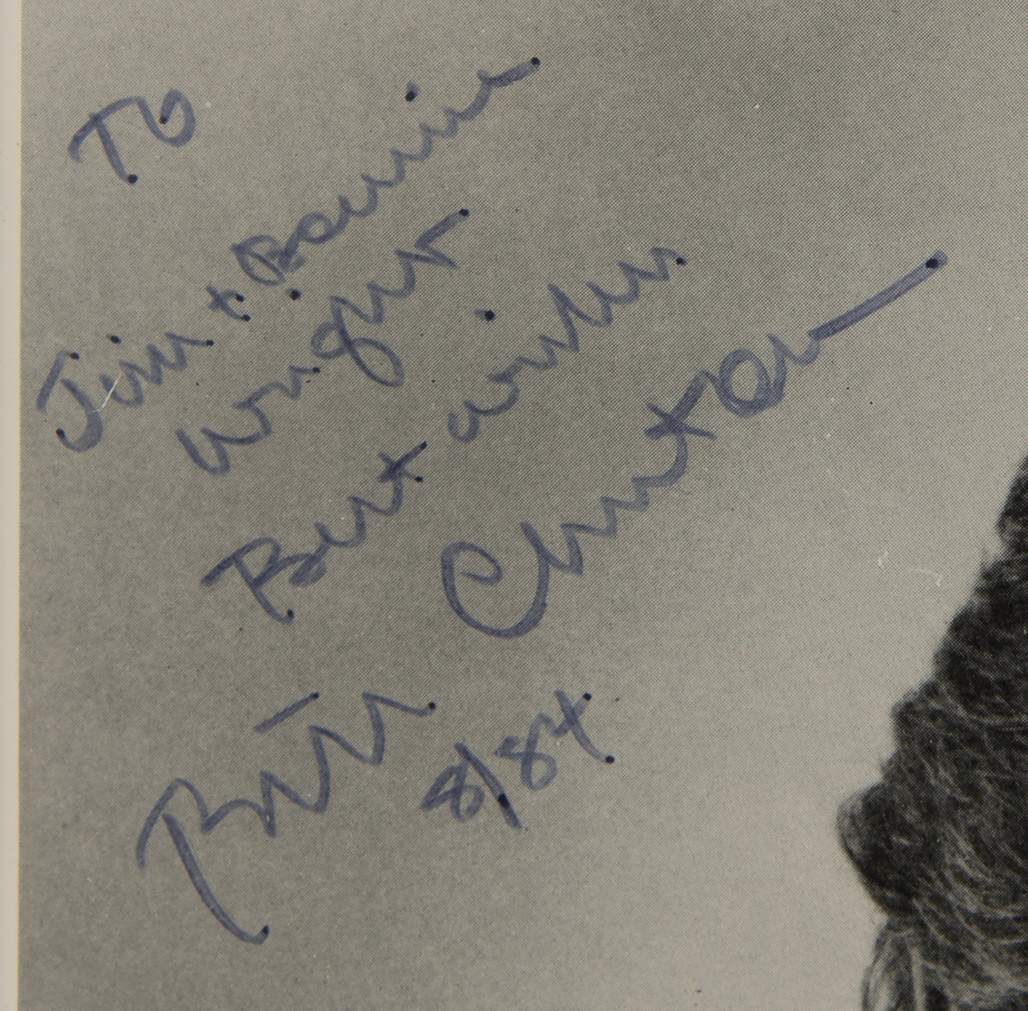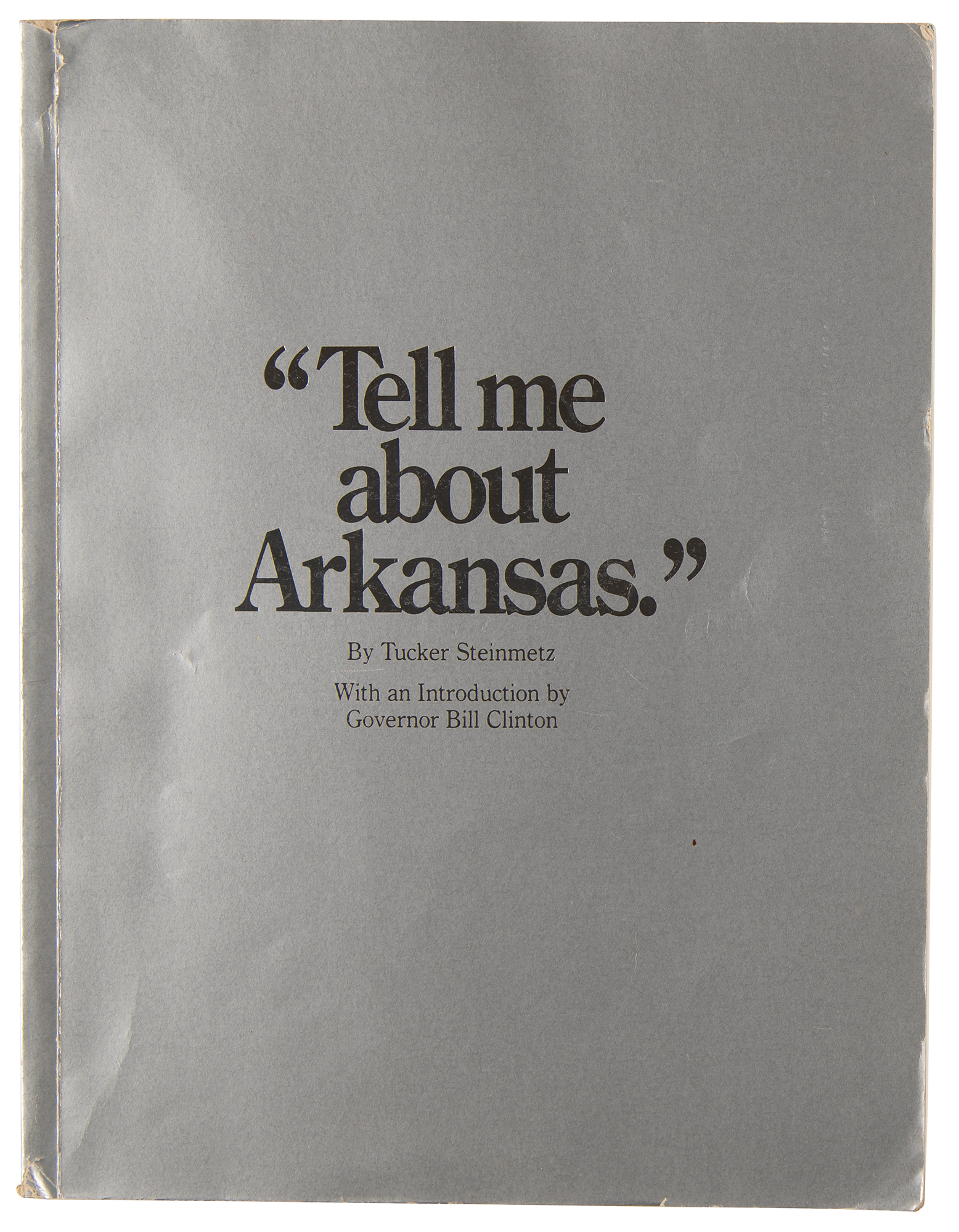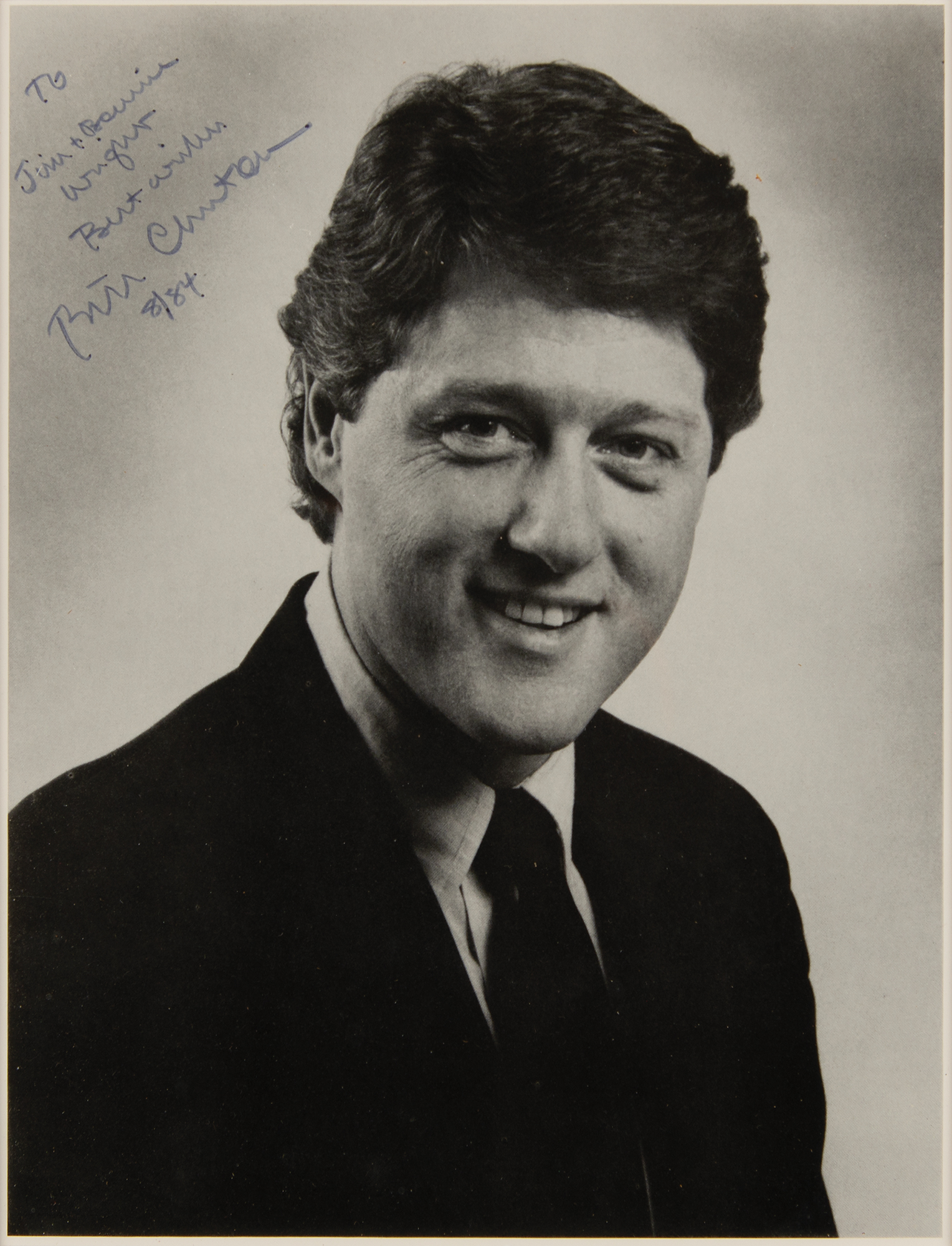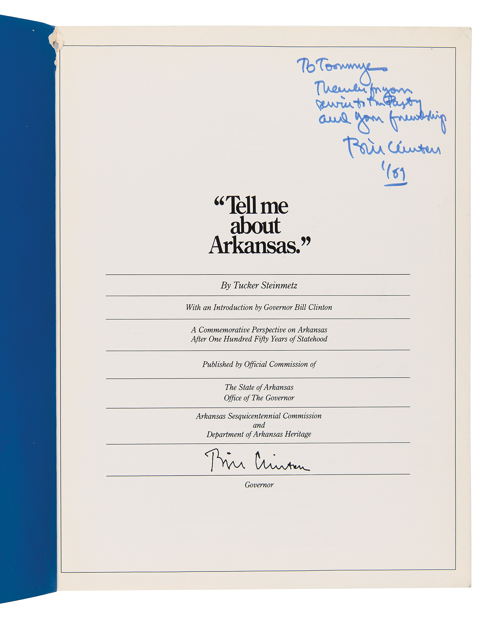 Two items: a semi-glossy 7.5 x 9.5 portrait photo of Arkansas Governor Bill Clinton, signed and inscribed in black felt tip, “To Jim & Bonnie Wright, Best wishes, Bill Clinton, 8/84”; and a commemorative booklet entitled “‘Tell me about Arkansas’ – A Commemorative Perspective on Arkansas After One Hundred Fifty Years of Statehood,” 133 pages, 8.5 x 11, signed and inscribed on the title page in blue felt tip, “To Tommy, Thanks for your service to the Party and your friendship, Bill Clinton, 1/89.” The photo is matted and framed to an overall size of 13 x 16. In overall fine condition, with light creasing to the book's covers, and a tear to the upper spine area. Accompanied by an original color glossy 4.25 x 3.5 Polaroid photo of Clinton standing with a young admirer, and a period newspaper clipping of Clinton at a ceremonial ribbon cutting, both affixed to a magnetic photo album sheet.