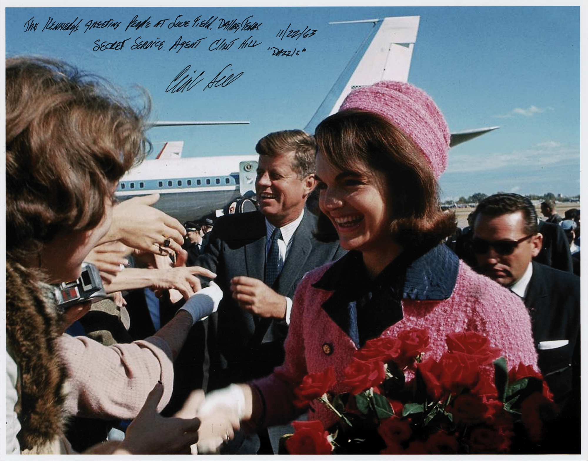 Color satin-finish 14 x 11 photo of the Kennedys upon their arrival at Love Field, Dallas, on the day of John F. Kennedy's assassination, signed in black felt tip, "The Kennedys greeting people at Love Field, Dallas, Texas, 11/22/63, Secret Service Agent Clint Hill, 'Dazzle,' Clint Hill." In fine condition.