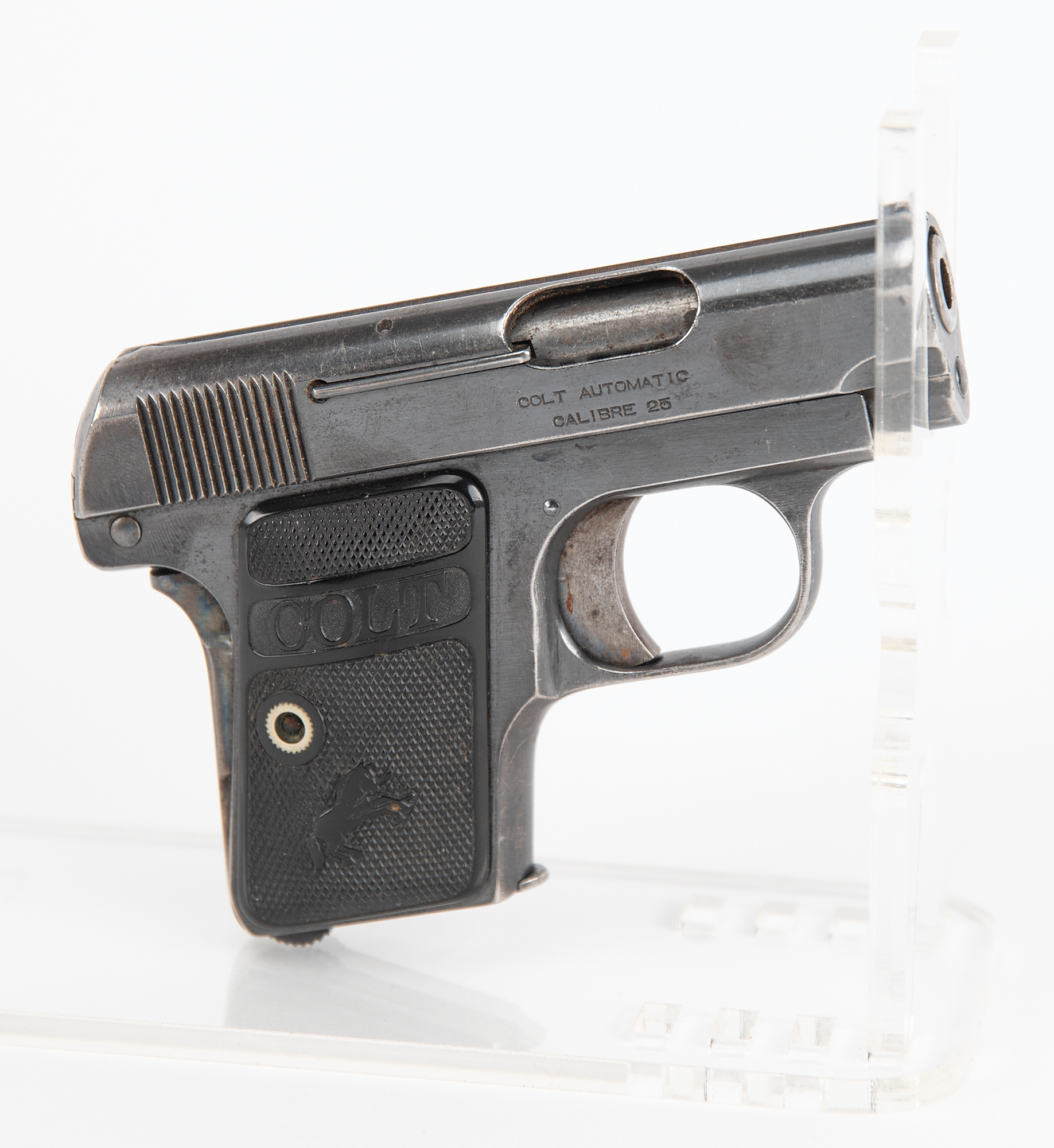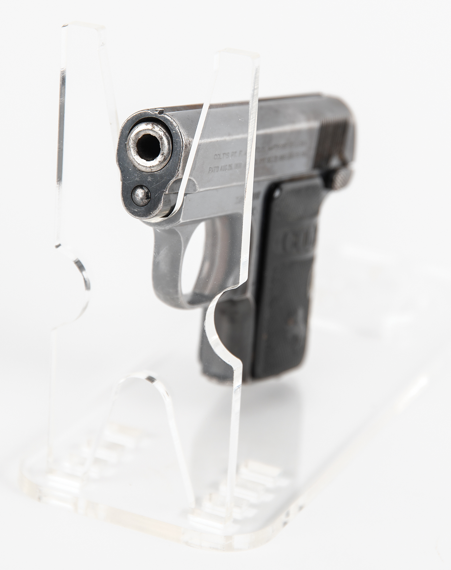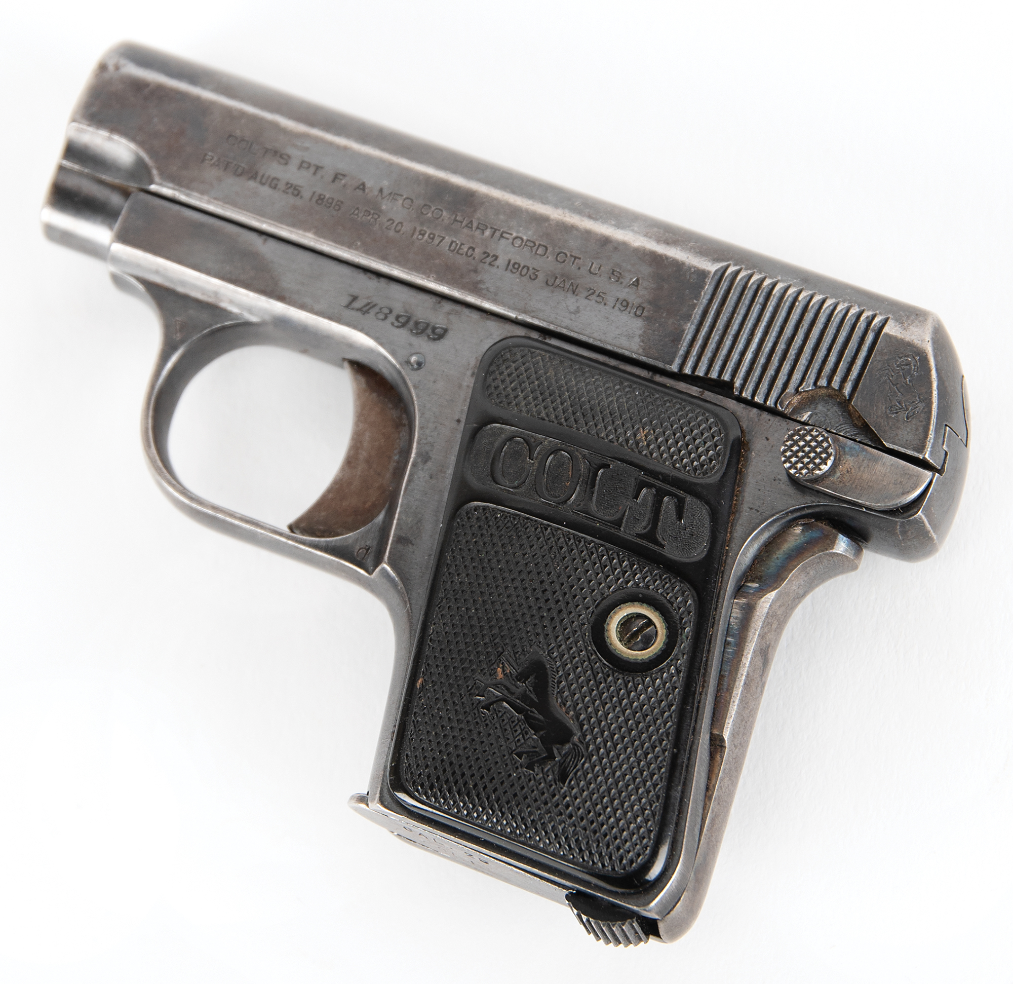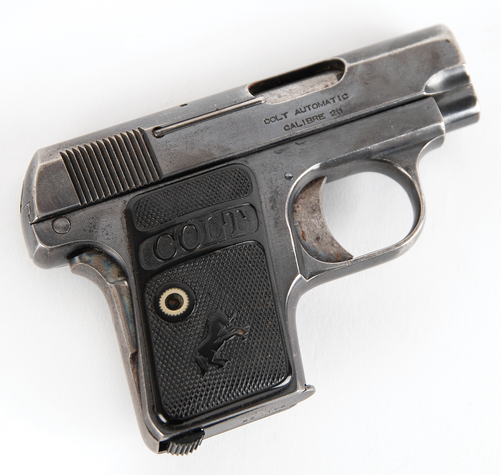 Accompanied by a notarized letter by Philip Mascarello, dated September 11, 2000, to Greg Martin of Butterfield's Auction House. He writes: "I have a 25 cal. Colt gun serial #148999 that was given to my folks in the prohibition era by Al Capone. My mother told me it was given to them for protection if needed. My father was a bootlegger in those days. Al Capone would stop at our house and have some of my mother's cooking Italian style which he liked. From what I remember he always stopped at night (Capone). There was a place in Chicago Heights called Hungry Hill where he had a brewery which was close to our house. You did not dare say any wrong about Capone in that area as he fed most of the people living there…I remember the big black Cadillac that Capone came in. He always had a driver…I remember the people that made the booze. Luigi was my father, Emilio was his brother and Pete & Setimo. My father was killed being chased by the police. He had a load of booze in the back seat of the Oakland car he was driving. He ran into a moving freight train."