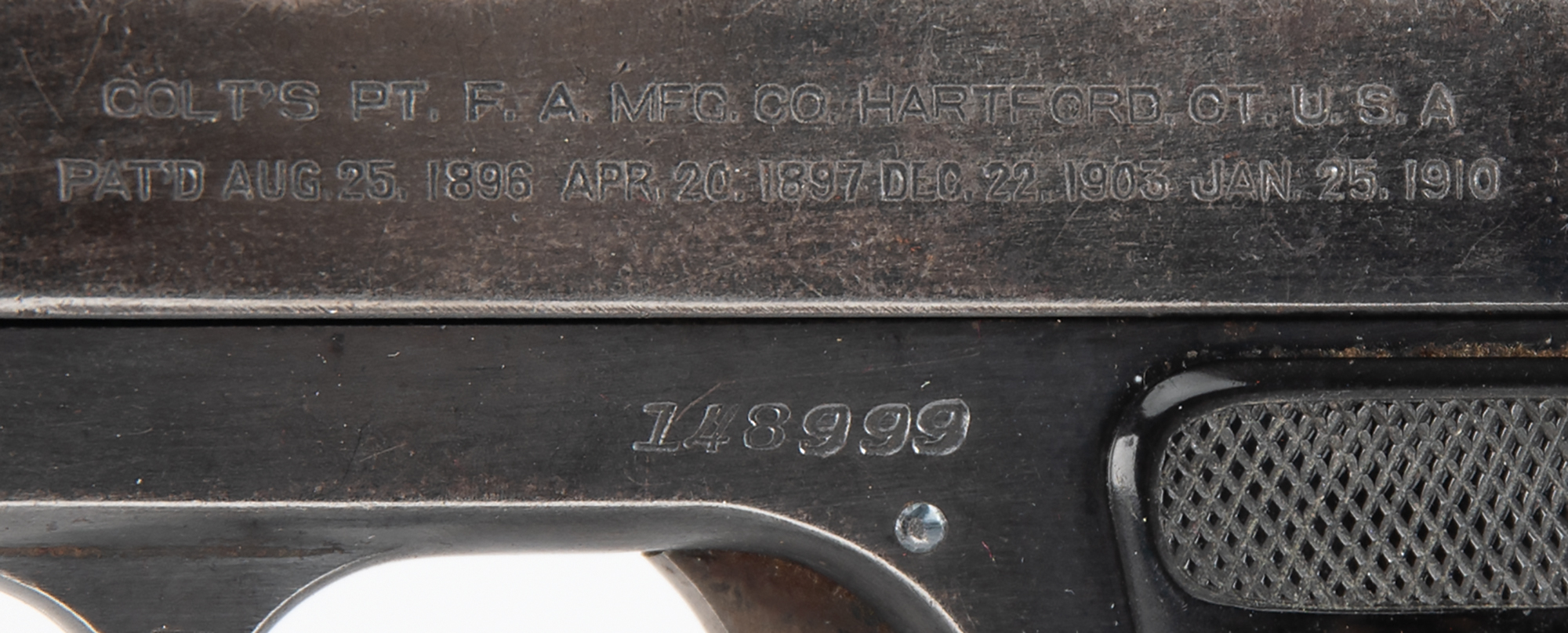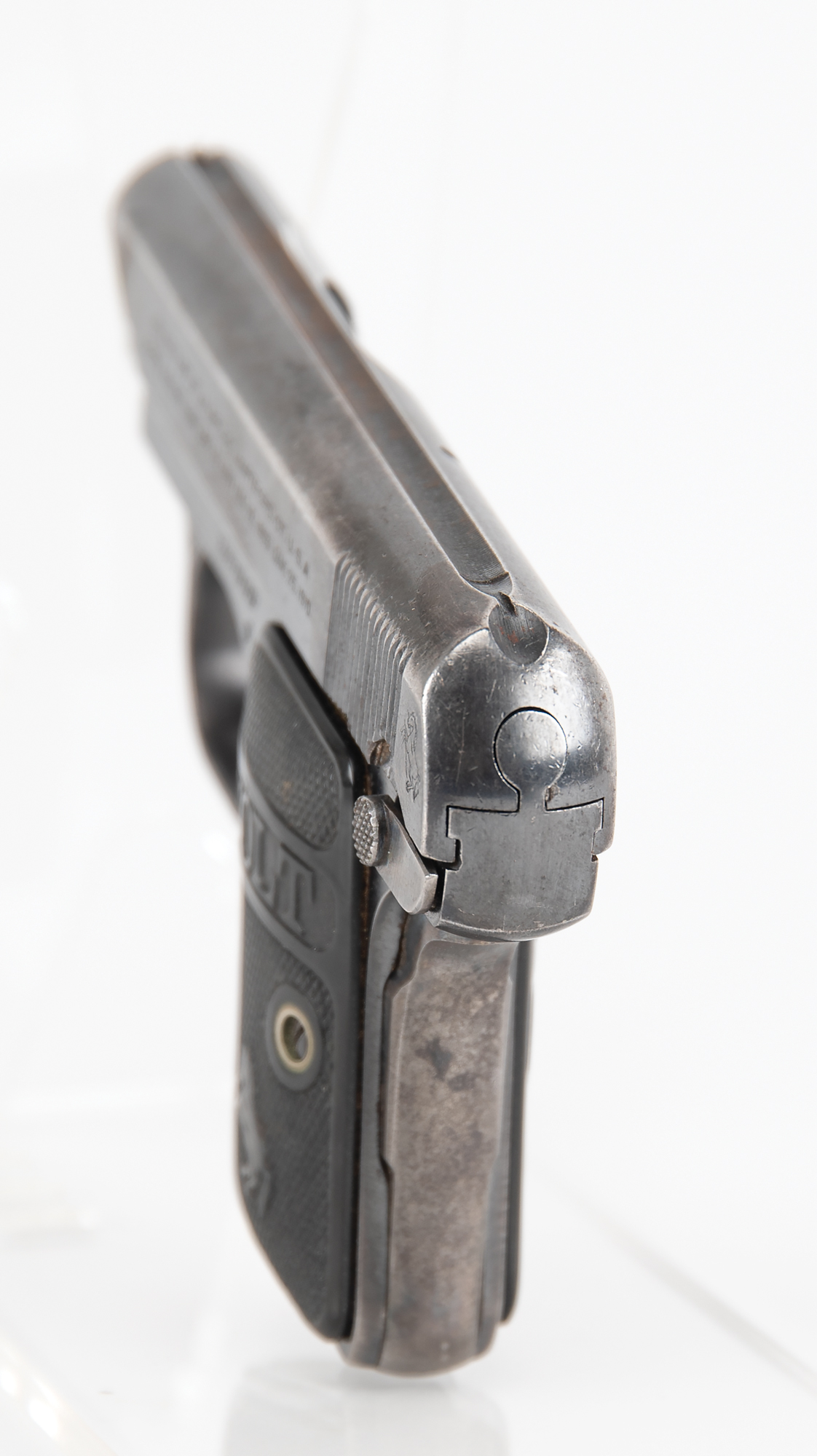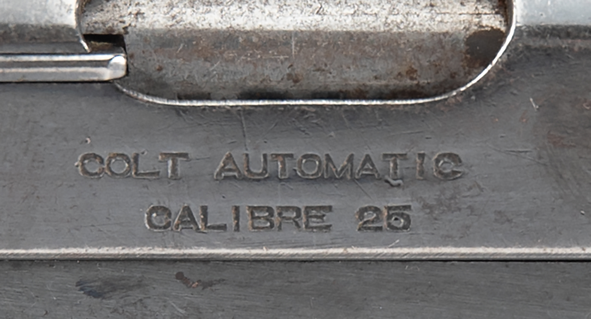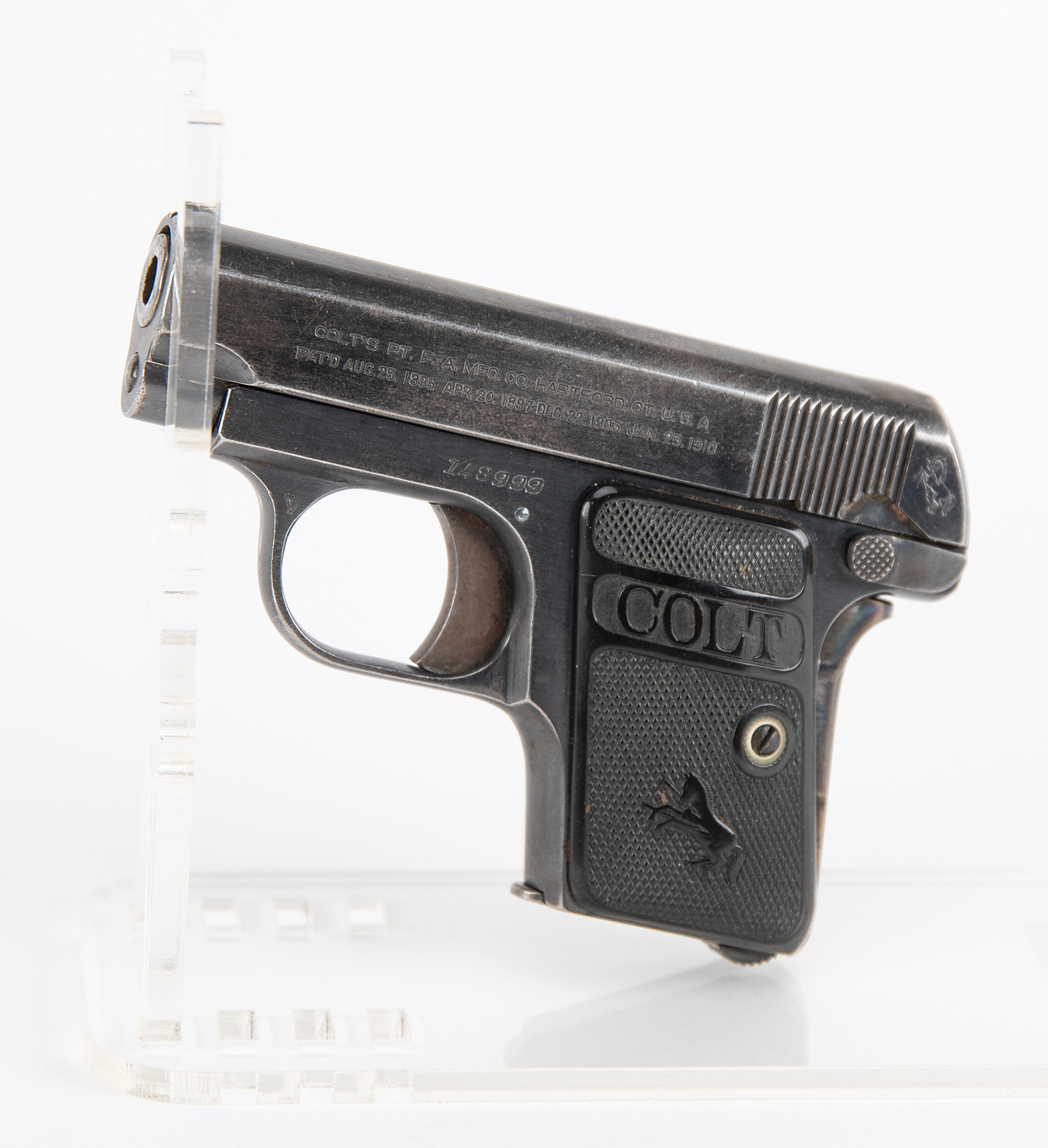 Accompanied by a notarized letter by Philip Mascarello, dated September 11, 2000, to Greg Martin of Butterfield's Auction House. He writes: "I have a 25 cal. Colt gun serial #148999 that was given to my folks in the prohibition era by Al Capone. My mother told me it was given to them for protection if needed. My father was a bootlegger in those days. Al Capone would stop at our house and have some of my mother's cooking Italian style which he liked. From what I remember he always stopped at night (Capone). There was a place in Chicago Heights called Hungry Hill where he had a brewery which was close to our house. You did not dare say any wrong about Capone in that area as he fed most of the people living there…I remember the big black Cadillac that Capone came in. He always had a driver…I remember the people that made the booze. Luigi was my father, Emilio was his brother and Pete & Setimo. My father was killed being chased by the police. He had a load of booze in the back seat of the Oakland car he was driving. He ran into a moving freight train."