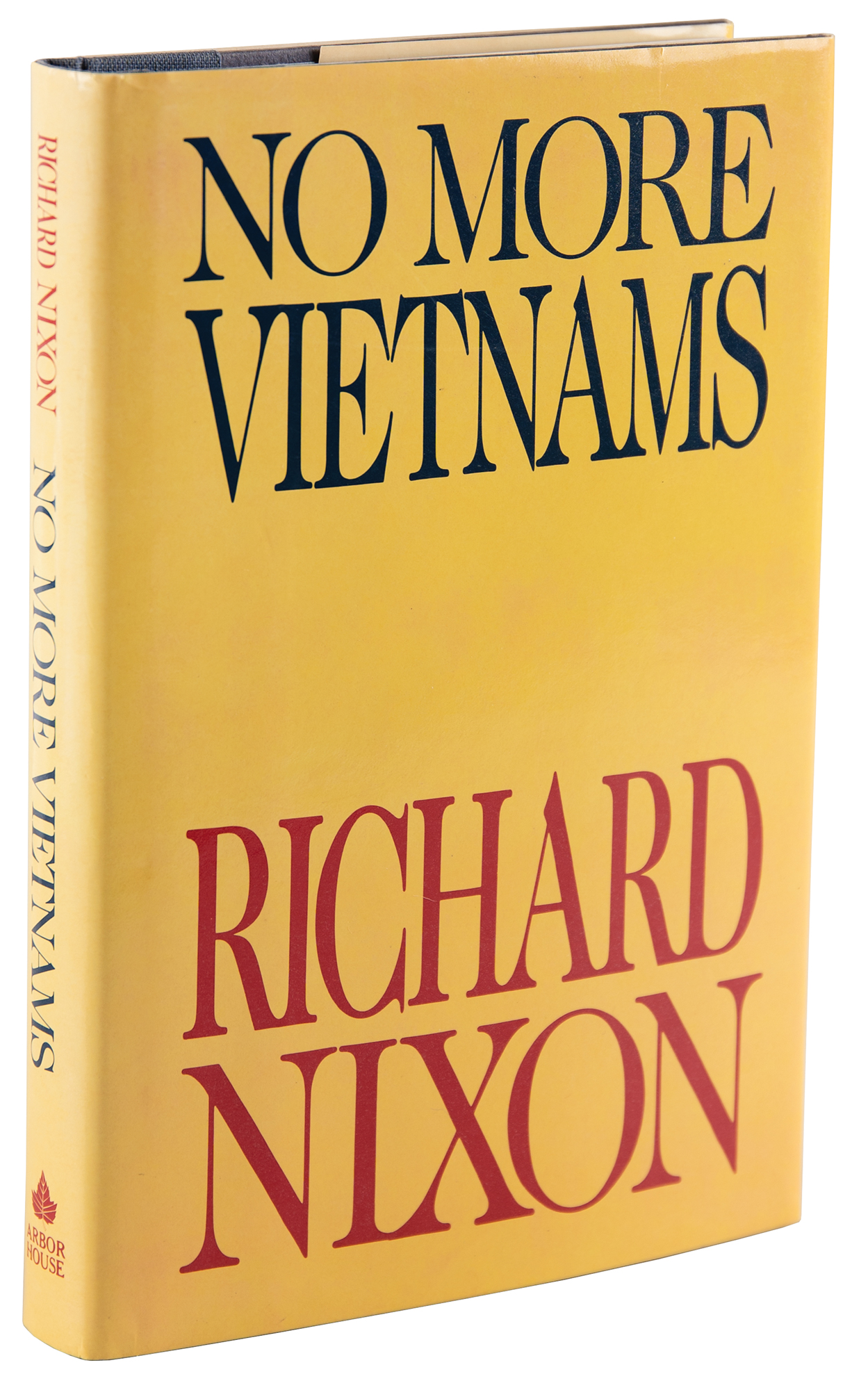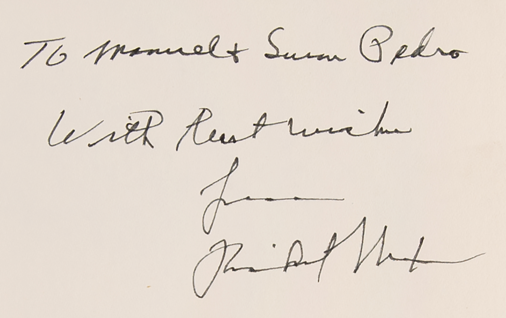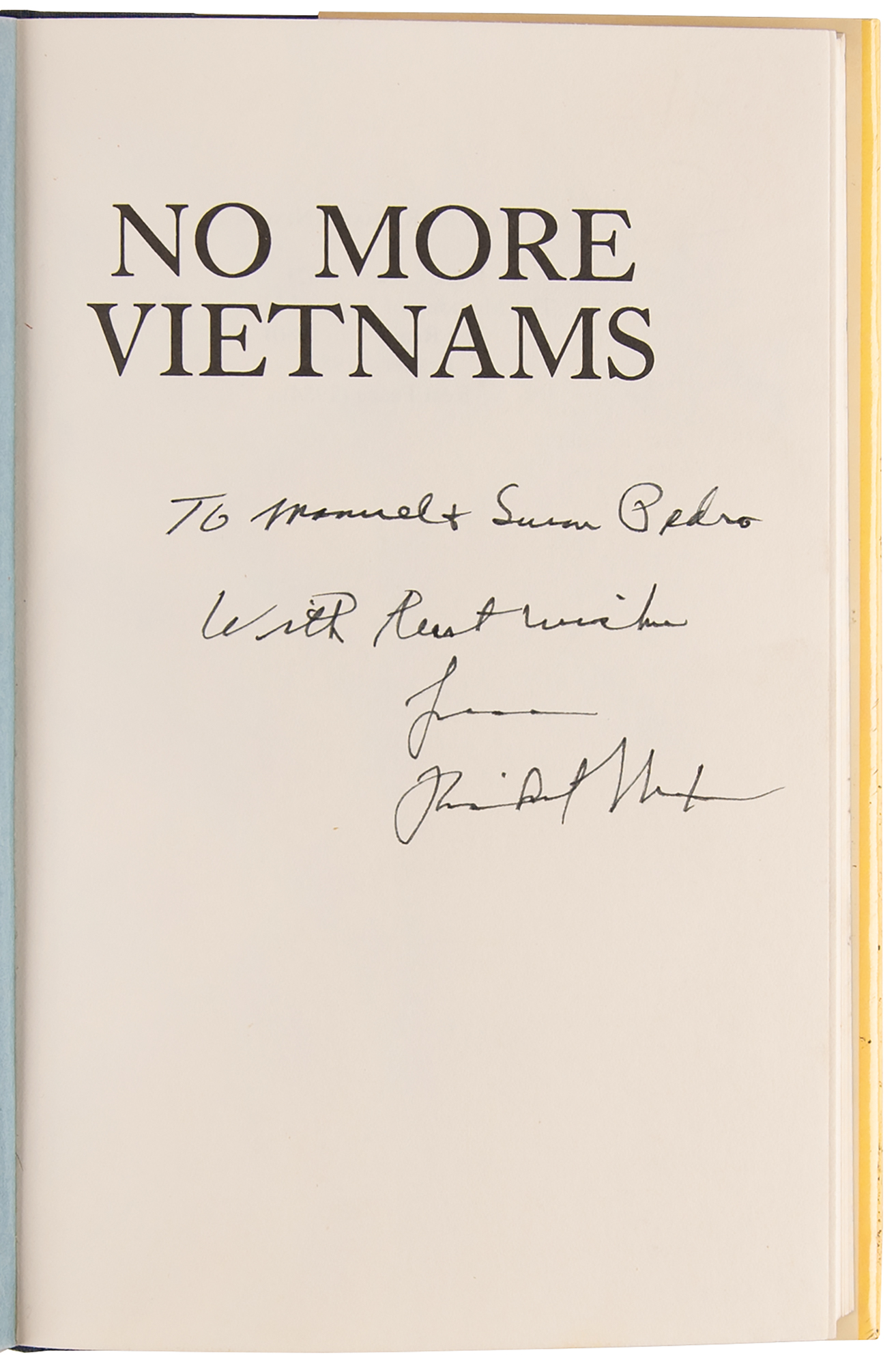 Signed book: No More Vietnams. First edition. NY: Arbor House, 1985. Hardcover with dust jacket, 5.75 x 8.5, 240 pages. Signed and inscribed on the half-title page in black felt tip, "To Manuel & Susan Pedro, With best wishes, from Richard Nixon." In fine condition.