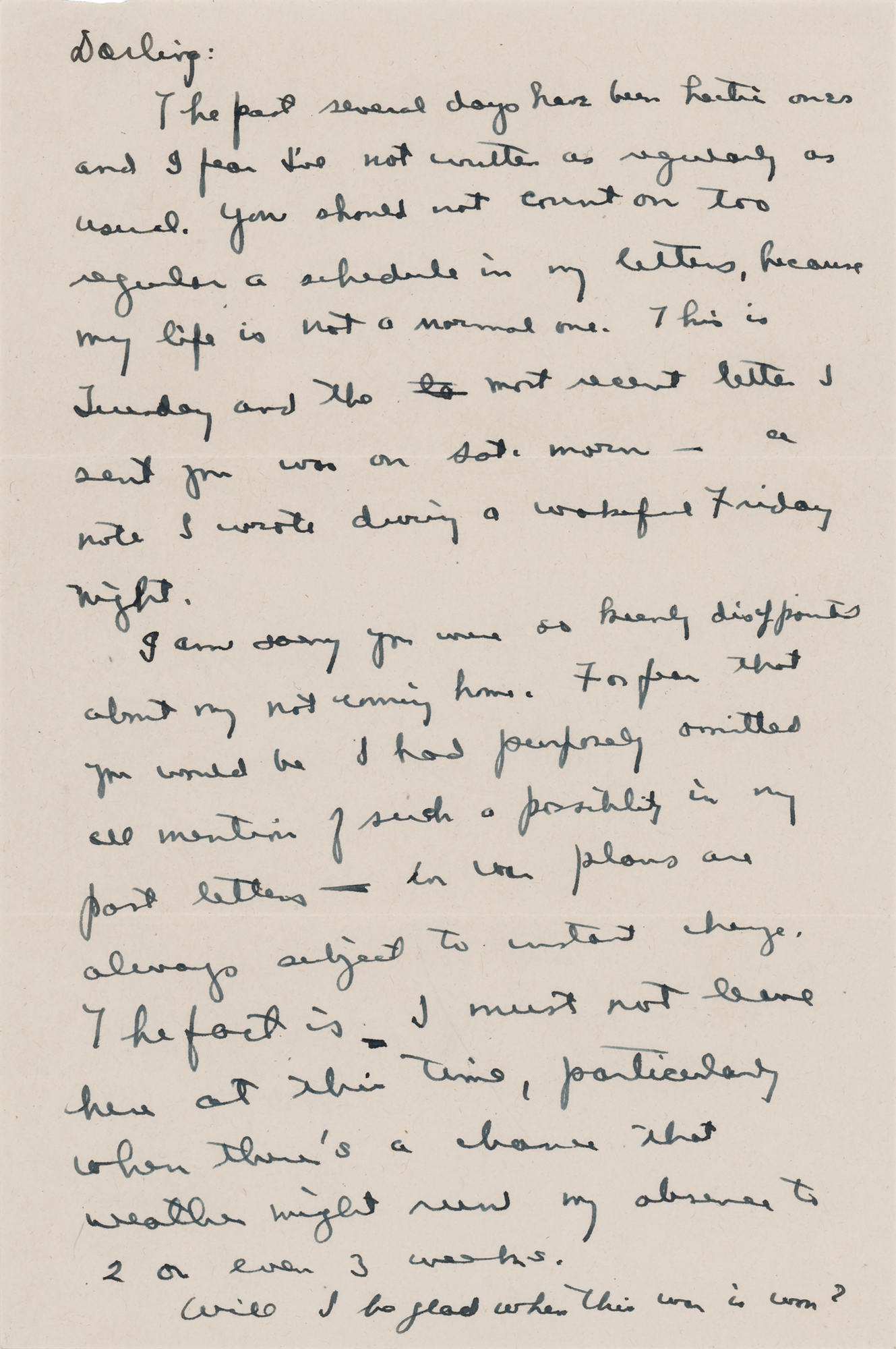 I am sorry you were so keenly disappointed about my not coming home. For fear that you would be I had purposely omitted all mention of such a possibility in my past letters - for plans are always subject to instant change. The fact is I must not leave here at this time, particularly when there's a chance that weather might run my absence to 2 or even 3 weeks. Will I be glad when this war is over? The usual interruption took place between these two sheets. This sentence is six hours later than the preceding one.