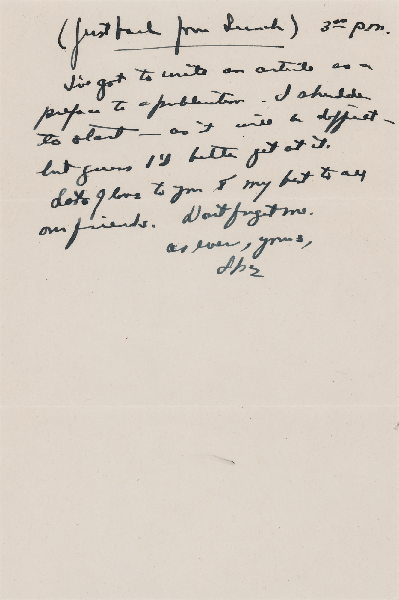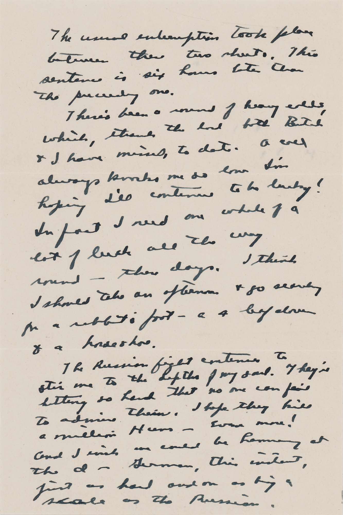 The Russian fight continues to stir me to the depths of my soul. They're hitting so hard that no one can fail to admire them. I hope they kill a million Huns ? even more! And I wish we could be hammering at the d? Germans, this instant, just as hard and on as big a scale as the Russians. (Just back from lunch) 3:00 p.m. I've got to write an article as a preface to a publication. I shudder to start ? as it will be difficult ? but guess I'd better get at it. Lots of love to you & my best to all our friends. Don't forget me.? In very fine condition.