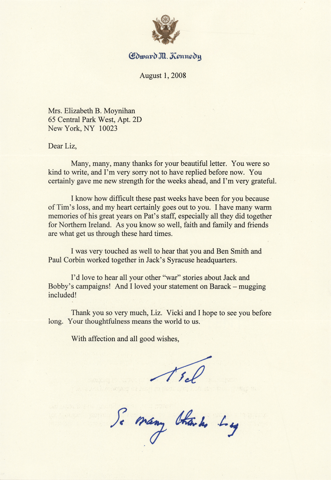 TLS signed “Ted, So many thanks Liz,” one page, 7.25 x 10.5, personal letterhead, August 1, 2008. Letter to Elizabeth B. Moynihan, widow of Senator Daniel Patrick Moynihan, in part: "Many, many, many thanks for your beautiful letter. You were so kind to write, and I'm very sorry not to have replied before now. You certainly gave me new strength for the weeks ahead, and I'm very grateful. I know how difficult these past weeks have been for you because of Tim's loss, and my heart certainly goes out to you. I have many warm memories of his great years on Pat's staff, especially all they did together for Northern Ireland. As you know so well, faith and family and friends are what get us through these hard times…I'd love to hear all your other 'war' stories about Jack and Bobby's campaigns! And I loved your statement on Barack—mugging included!" In very fine condition. Accompanied by the original mailing envelope.