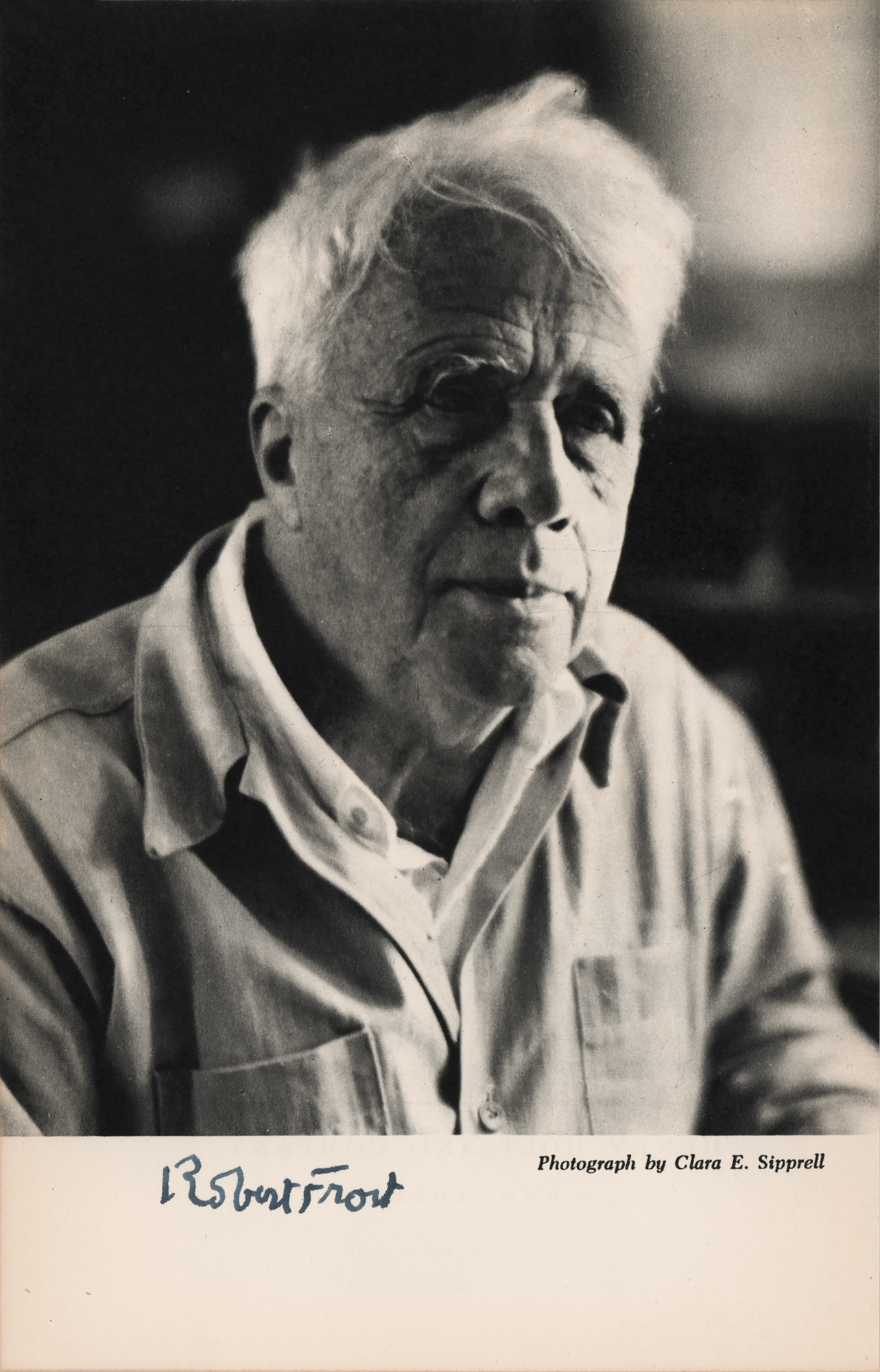 Appealing 5.25 x 8.25 paperstock photo of the popular New England poet by Clara E. Sipprell, signed in the lower border in fountain pen, "Robert Frost." In very fine condition.