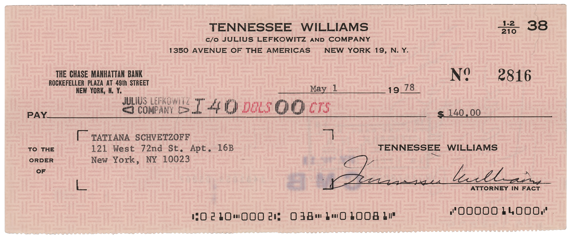Personal check, 8.5 x 3.5, filled out in type and signed by Williams, "Tennessee Williams," payable to Tatiana Schvetzoff for $140, May 1, 1978. In fine condition, with a PSA/DNA label affixed to the reverse. Accompanied by a certificate of authenticity from PSA/DNA.