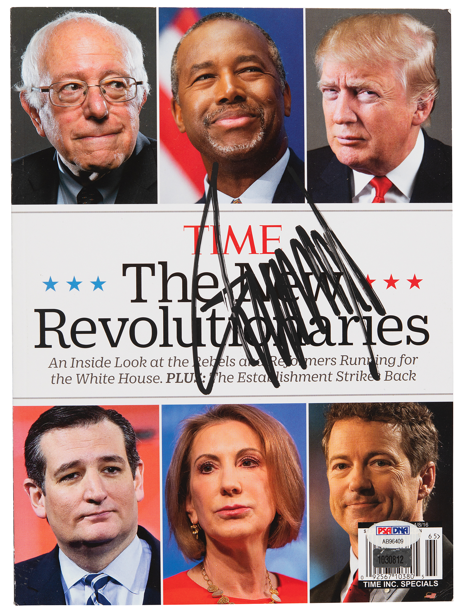 Special issue of Time magazine from April 8, 2016, with the front cover featuring images of Donald Trump, Ben Carson, Bernie Sanders, Ted Cruz, Carly Fiorina, and Rand Paul, which the magazine collectively describes as "The New Revolutionaries," 96 pages, 8 x 10.75, signed on the front cover in black felt tip by Trump. In fine condition, with light edgewear and a PSA/DNA label affixed to the lower right corner. Accompanied by a certificate of authenticity from PSA/DNA.