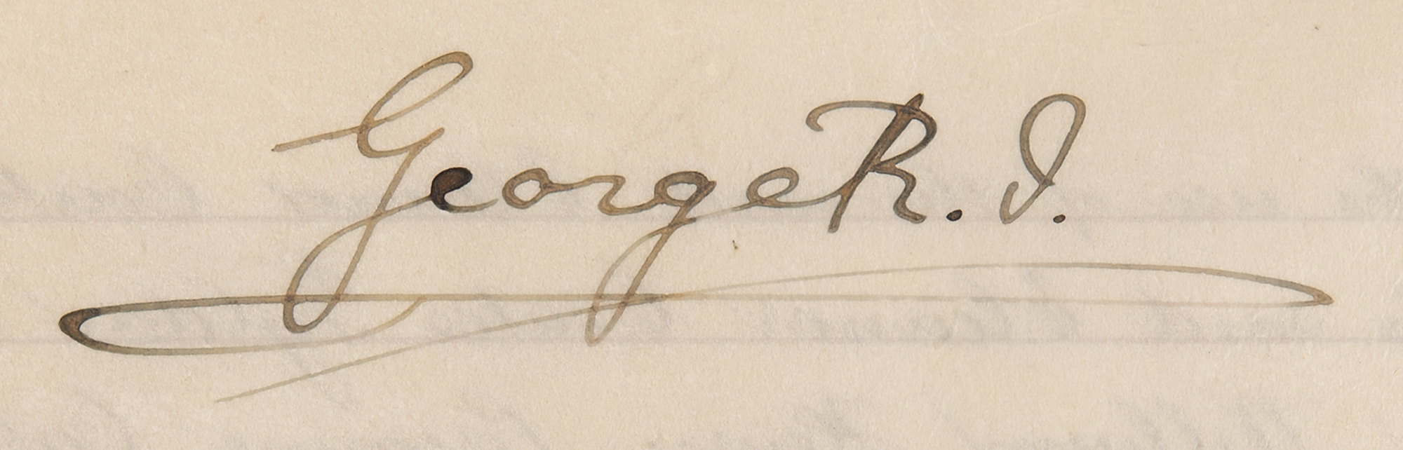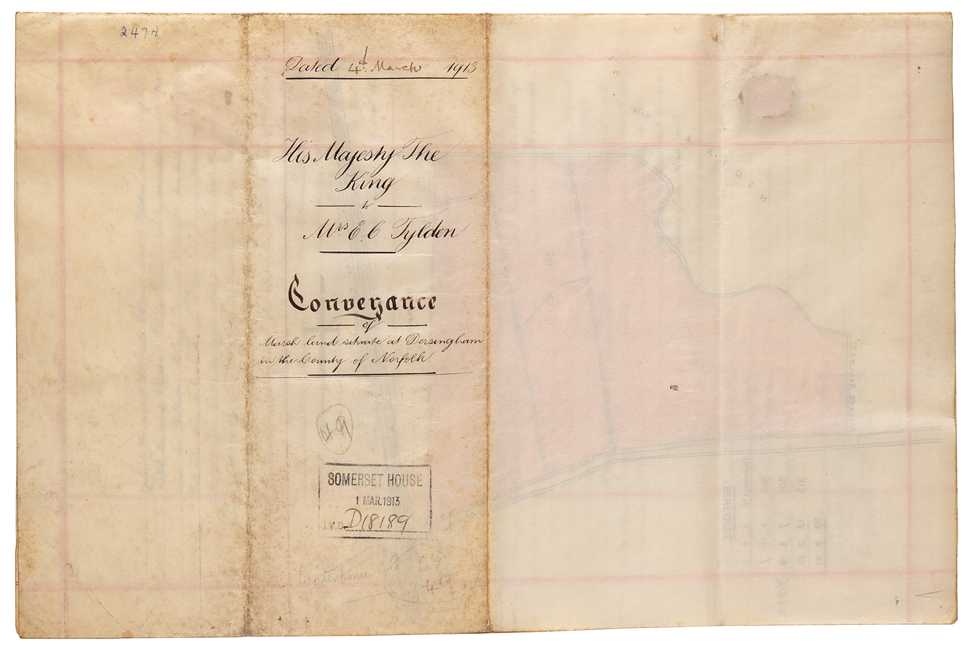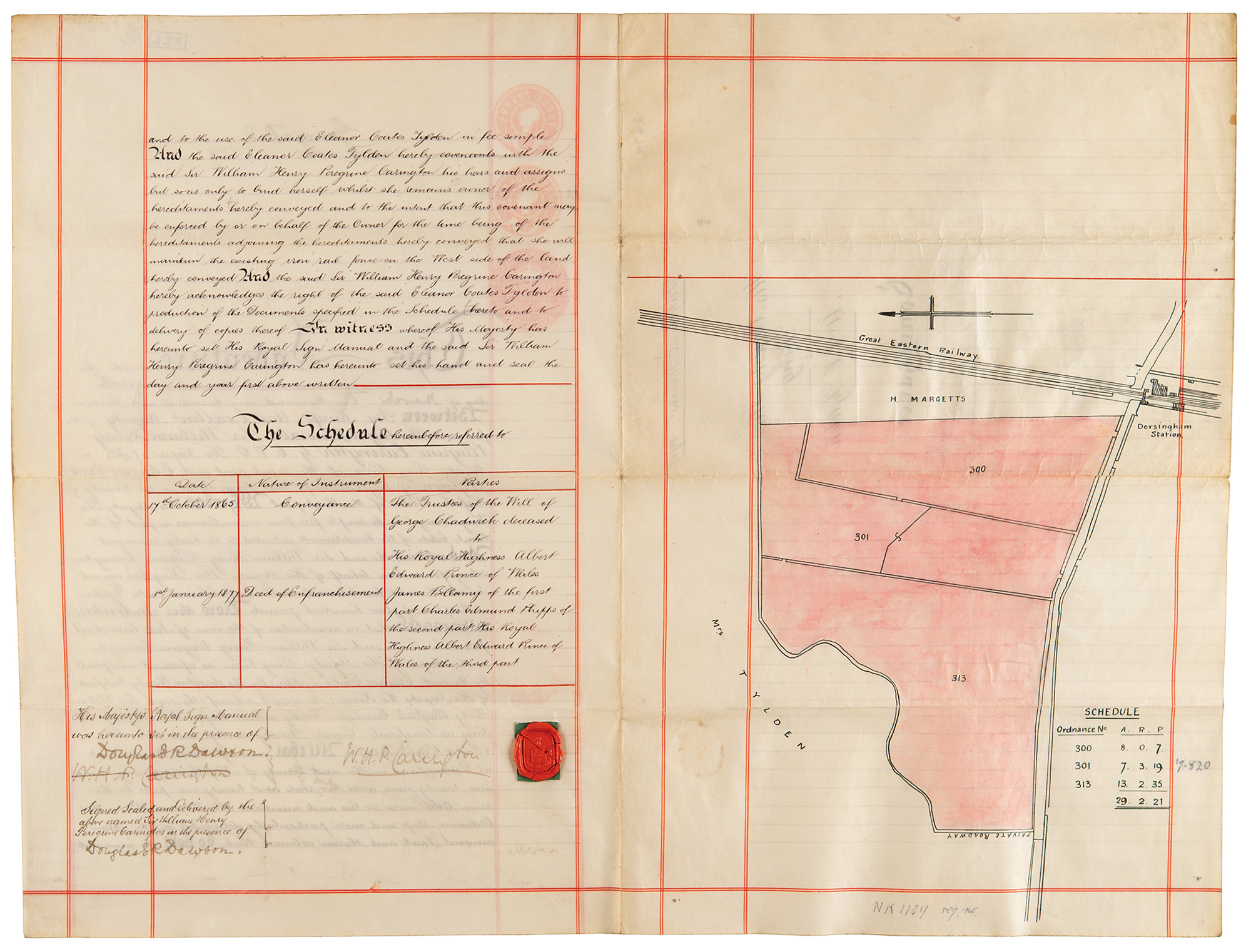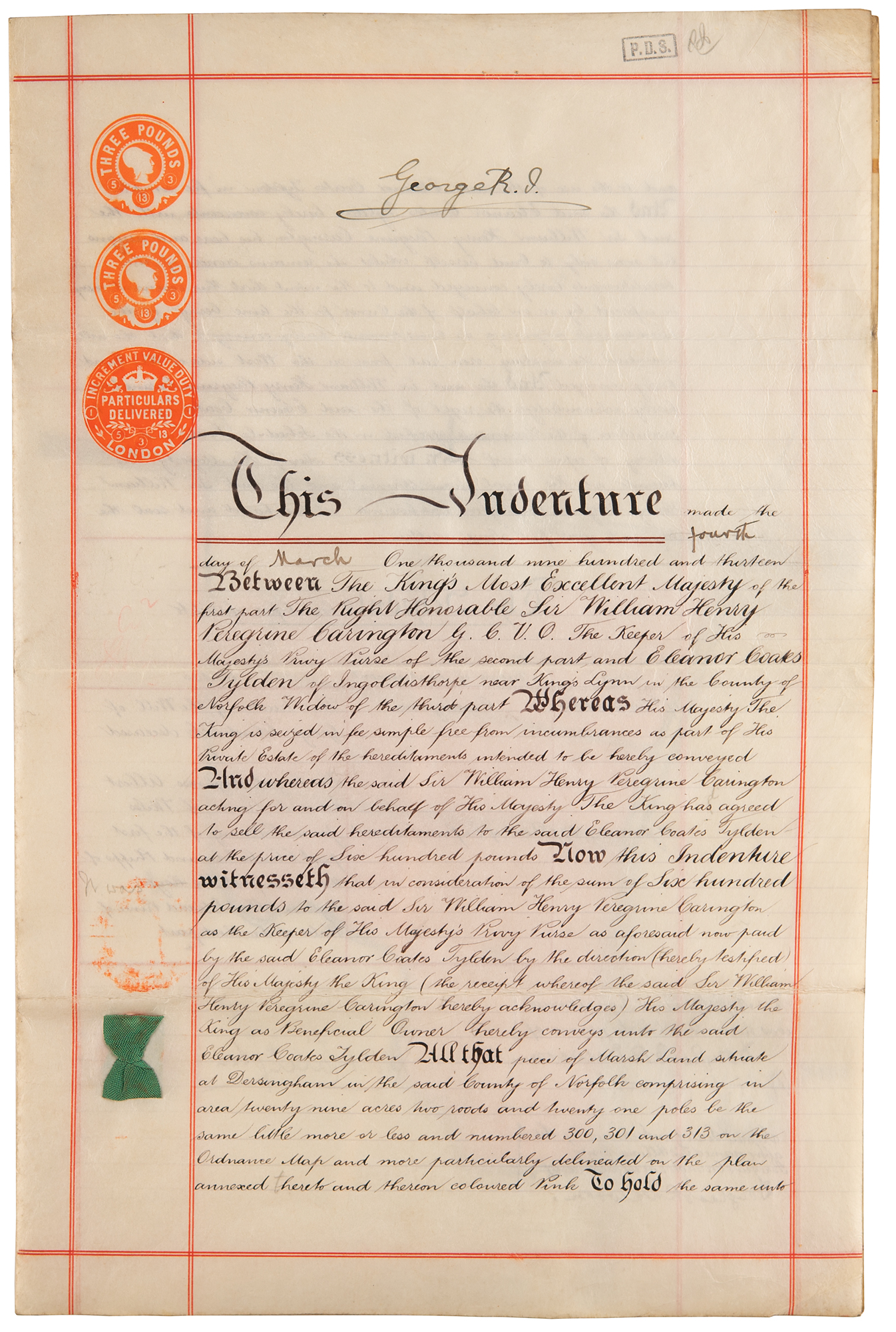 Manuscript vellum DS, signed “George R. I.,” three pages on two adjoining sheets, 10.25 x 15.75, March 4, 1913. Indenture made between Sir William Henry Peregrine Carington, “The Keeper of His Majesty’s Privy Purse,” and Eleanor Coates Tylden, which relates to the king’s agreeing to sell and convey hereditaments of his private estate, described thusly as “Marshland situate at Dersingham in the County of Norfolk,” for a sum of 600 pounds. Signed at the top of the first page by King George V, and countersigned at the bottom of the second page by William Carington, who signs next to the orange wax seal. The adjacent third page bears a hand-colored map of the conveyed land. In fine condition.