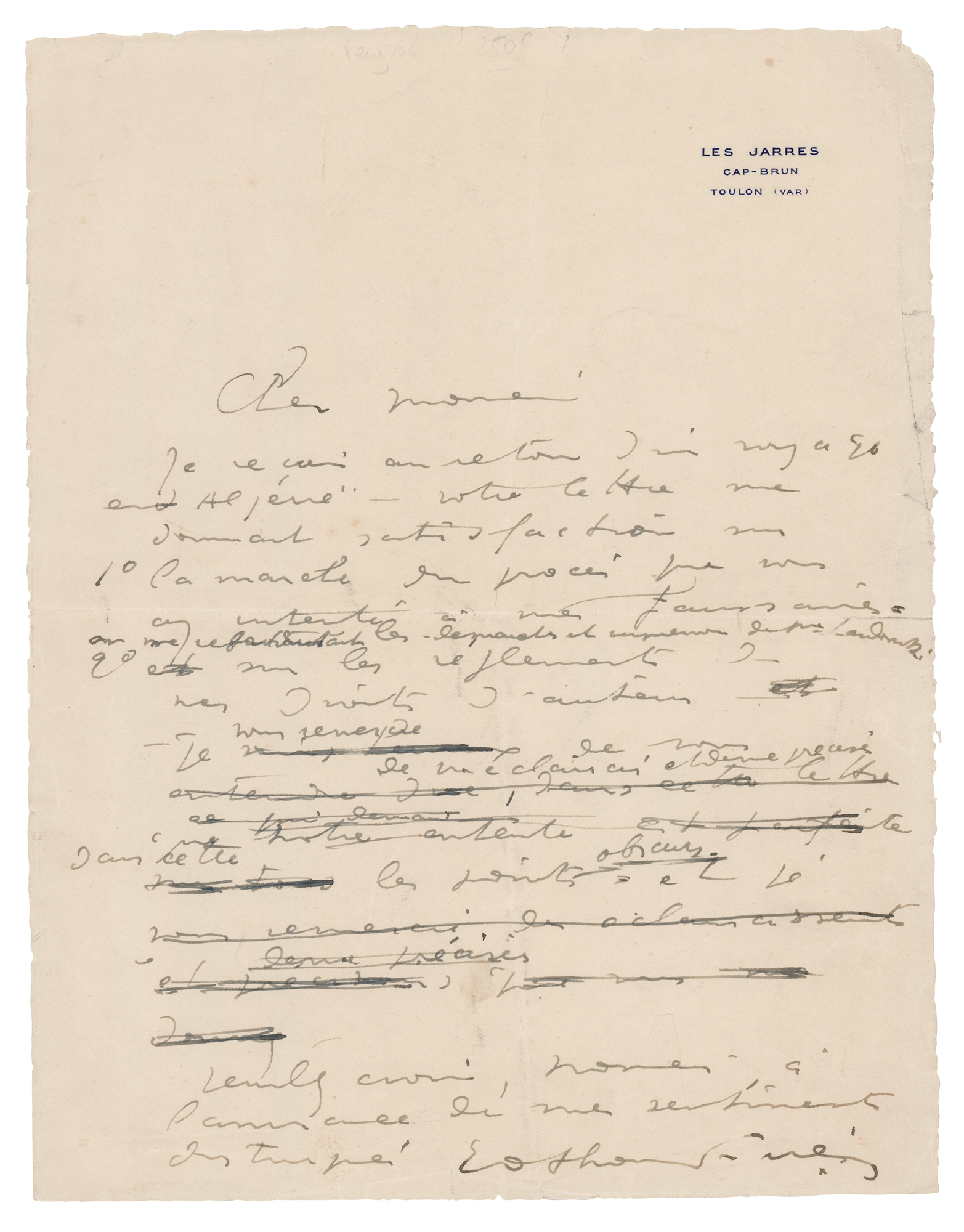 French artist (1879–1949) of the Fauvist movement and close friend of Raoul Dufy. ALS in French, one page, 8 x 10.5, Les Jarres letterhead, no date. Untranslated handwritten letter by Othon Friesz, who strikes through and corrects several lines. In fine condition.