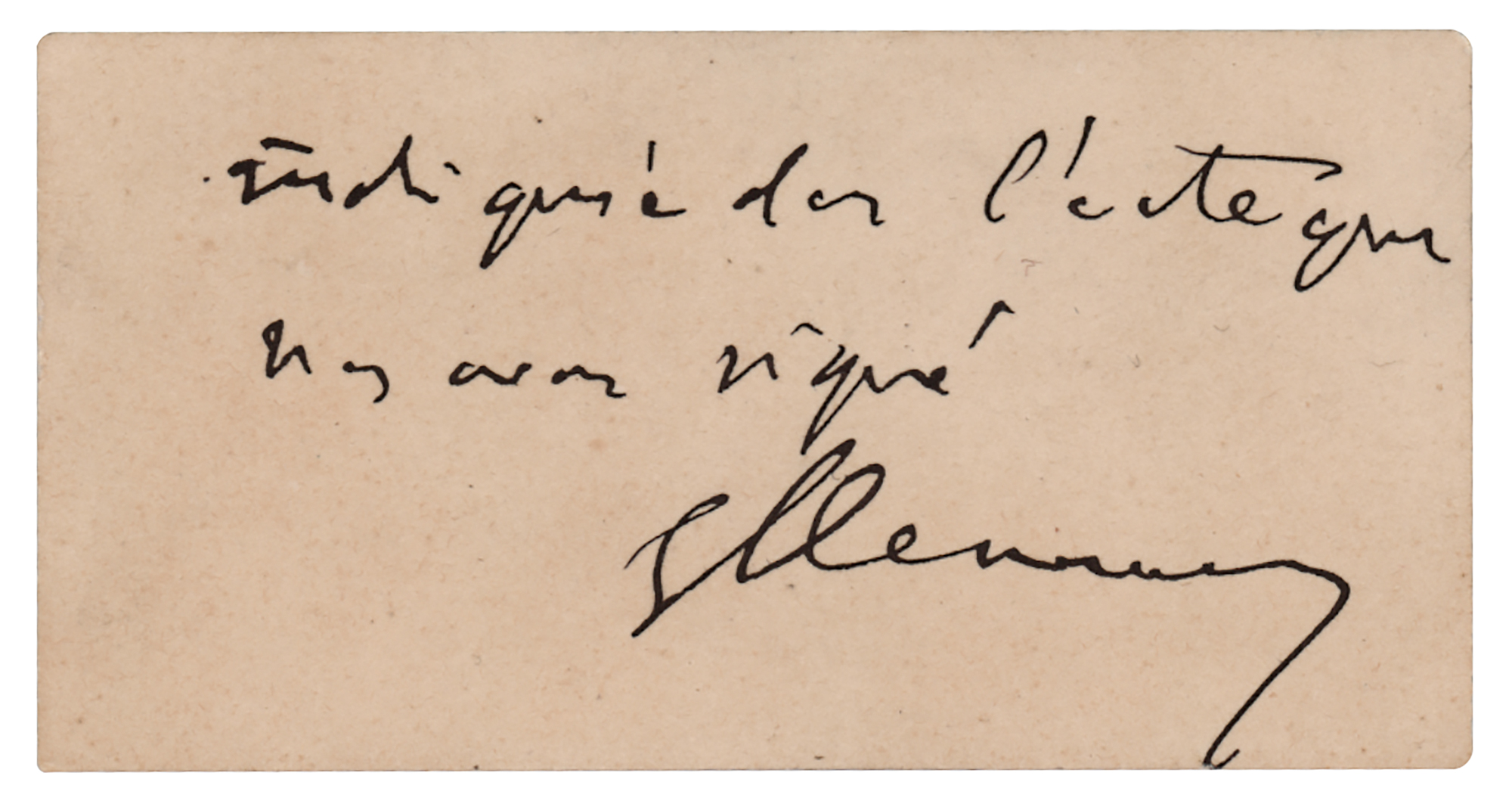 Journalist and statesman (1841-1929) who served as Prime Minister of France during World War I. George Clemenceau's personal calling card, 3 x 1.5, elegantly engraved with his name in a simple, cursive script, "G. Clemenceau," signed and inscribed on both sides in ink by the French statesman. In fine condition.