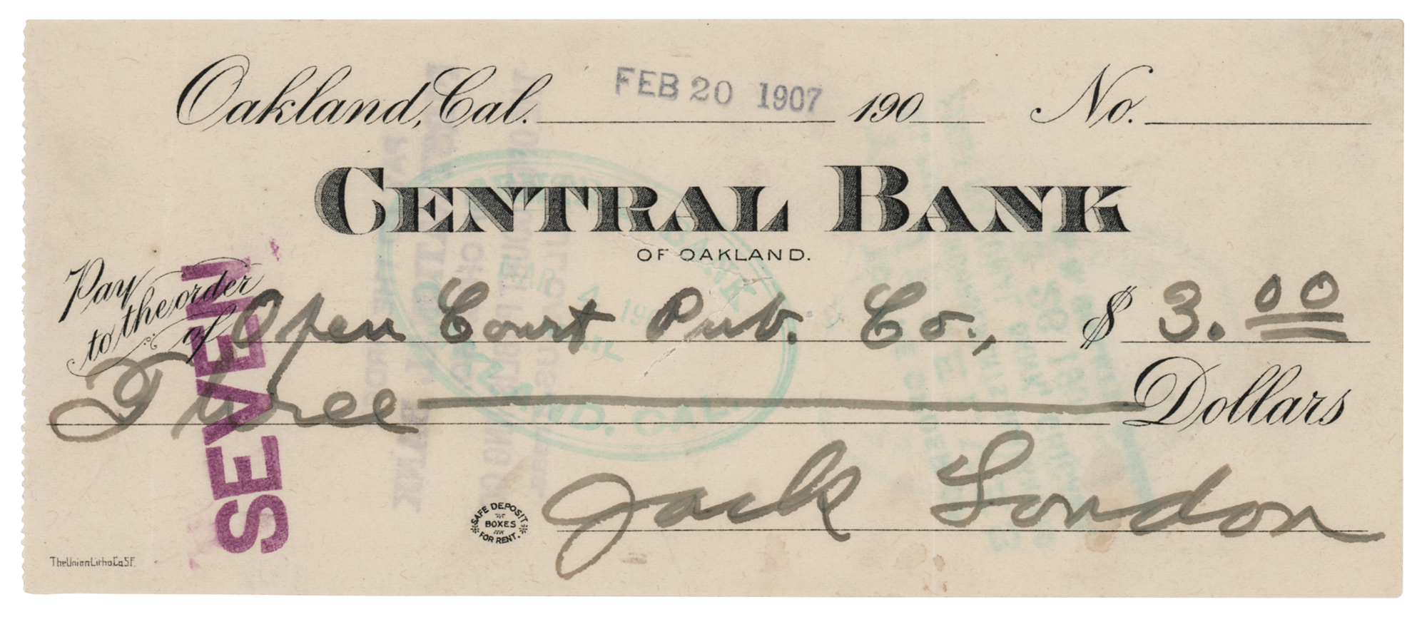 Central Bank of Oakland check, 6.5 x 2.75, filled out in another hand and signed by London, "Jack London," payable to Open Court Pub. Co. for $3, February 20, 1907. In fine condition.
