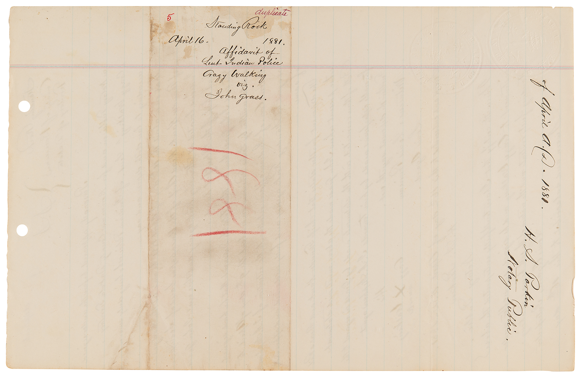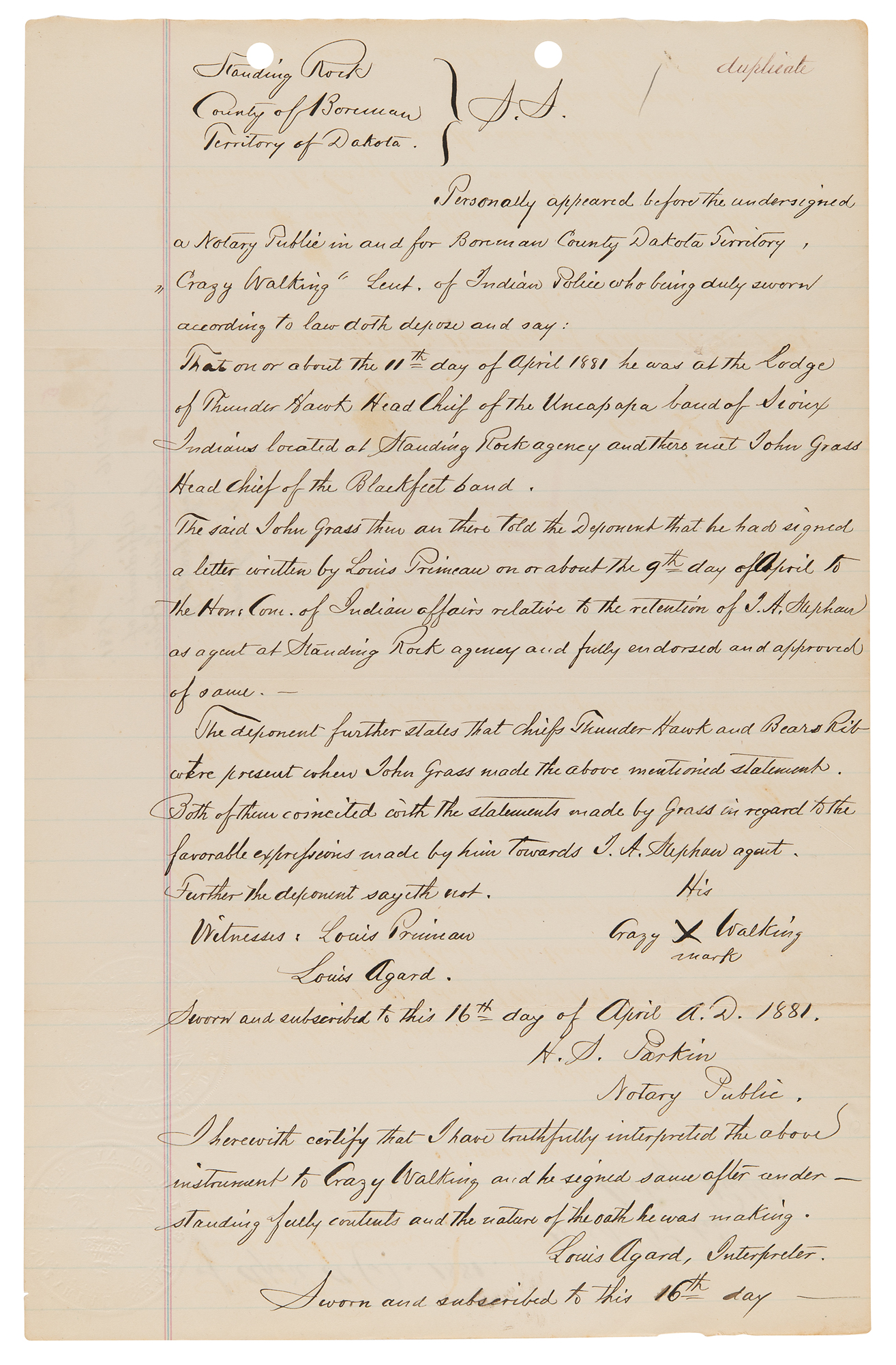 Manuscript copy of a deposition taken against Chief John Grass, one page, 8 x 12.5, April 16, 1881. Notarized manuscript copy of a deposition regarding the Sioux chief, marked "duplicate," in relation to potential efforts to undermine the authority of the Indian agent, Father Joseph A. Stephan—known as the 'fighting priest'—at Standing Rock. In part: "'Crazy Walking,' Lieut. of Indian Police who being duly sworn according to law doth depose and say: That on or about 11th day of April 1881 he was at the Lodge of Thunder Hawk Head Chief of the Uncapapa band of Sioux Indians located at Standing Rock agency and there met John Grass Head Chief of the Blackfeet band. The said John Grass then and there told the Deponent that he had signed a letter written by Louis Primeau on or about the 9th day of April to the Hon: Com. of Indian affixed relative to the retention of J. A. Stephan as agent at Standing Rock agency and fully endorsed and approved of same. The deponent further states that Chiefs Thunder Hawk and Bear's Rib were present when John Grass made the above mentioned statement. " In fine condition.