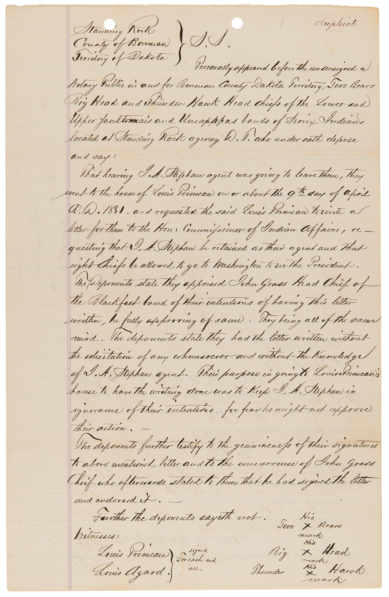 Manuscript copy of a deposition by three Sioux chiefs, one page both sides, 8 x 12.5, April 15, 1881. Manuscript copy of a deposition by the Sioux chiefs in relation to potential efforts to undermine the authority of the Indian agent, Father Joseph A. Stephan—known as the 'fighting priest'—at Standing Rock, marked "duplicate." In part: "Two Bears, Big Head and Thunder Hawk Head chiefs of the Lower and Upper Yanktomais and Uncapapas bands of Sioux Indians located at Standing Rock agency D.T. who under oath depose and say: That hearing J. A. Stephan agent was going to leave them, they went to the house of Louis Primeau…and requested the said Louis Primeau to write a letter for them to the Hon: Commissioner of Indian Affairs, requesting that J. A. Stephan be retained as their agent and that eight chiefs be allowed to go to Washington to see the President. The Deponents state that they apprised John Grass, Head Chief of the Blackfeet band of their intentions of having this letter written, he fully approving of same. They being all of the same mind. The deponents state they had the letter written without the solicitation of any whomsoever and without the knowledge of J. A. Stephan agent." In fine condition.