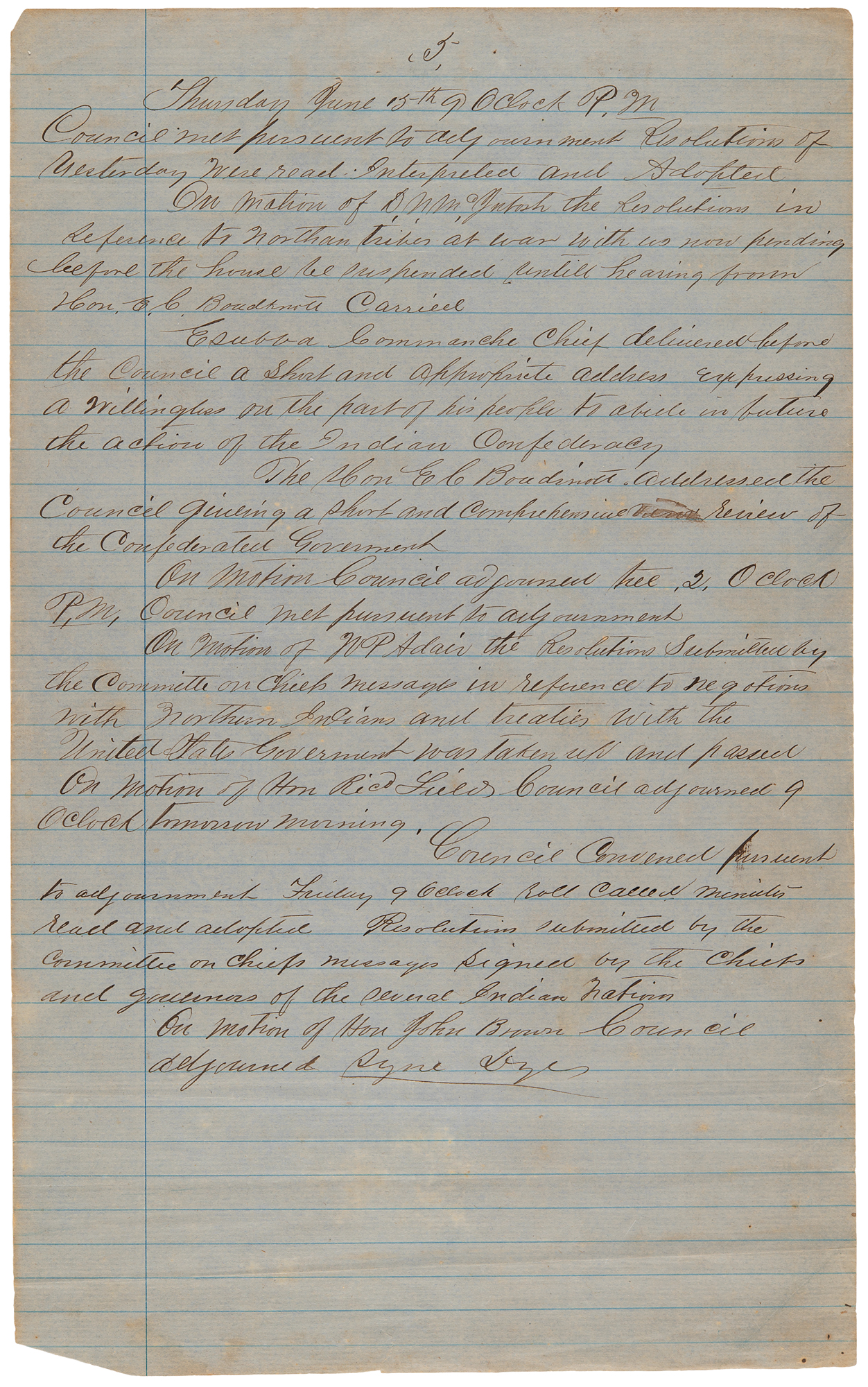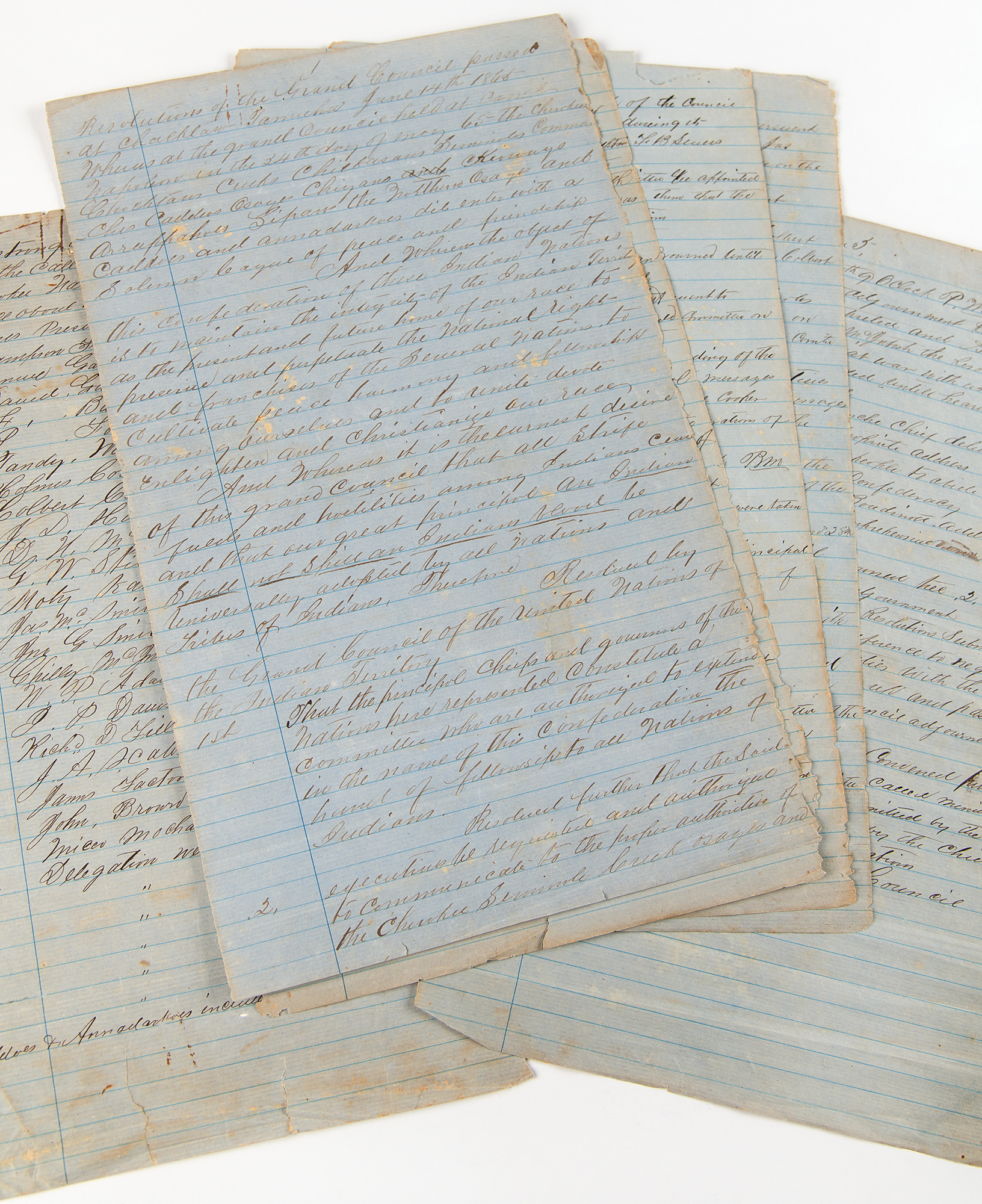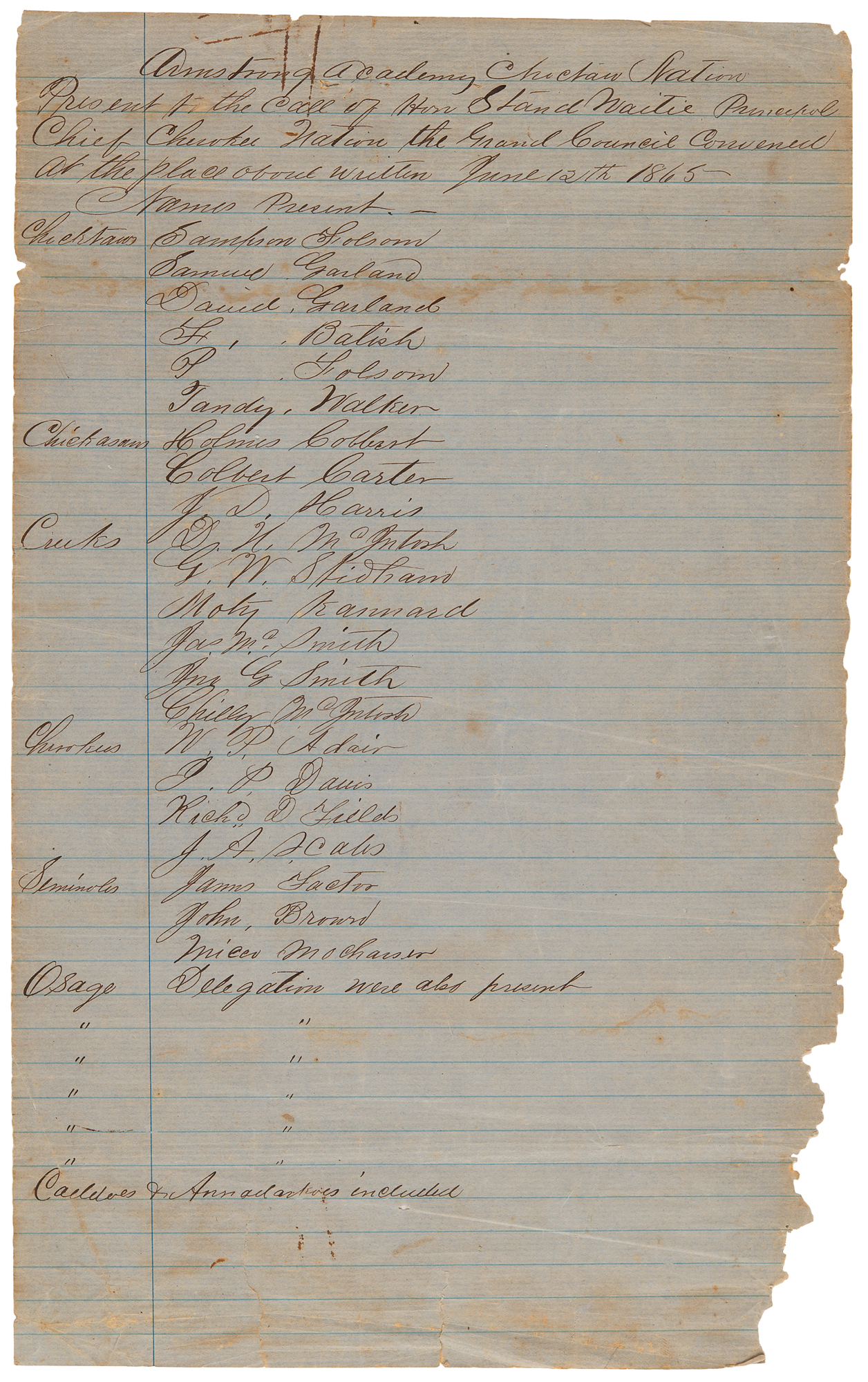 Manuscript resolutions and meeting minutes, six pages, 8 x 13, June 14, 1865. Six manuscript pages from the "Grand Council" convened at "Armstrong Academy, Choctaw Nation, Present to the call of Hon. Stand Watie, President," including one page of partial resolutions calling for the creation of a 'United Nations of the Indian Territories,' four pages of meeting minutes, and an attendance list.